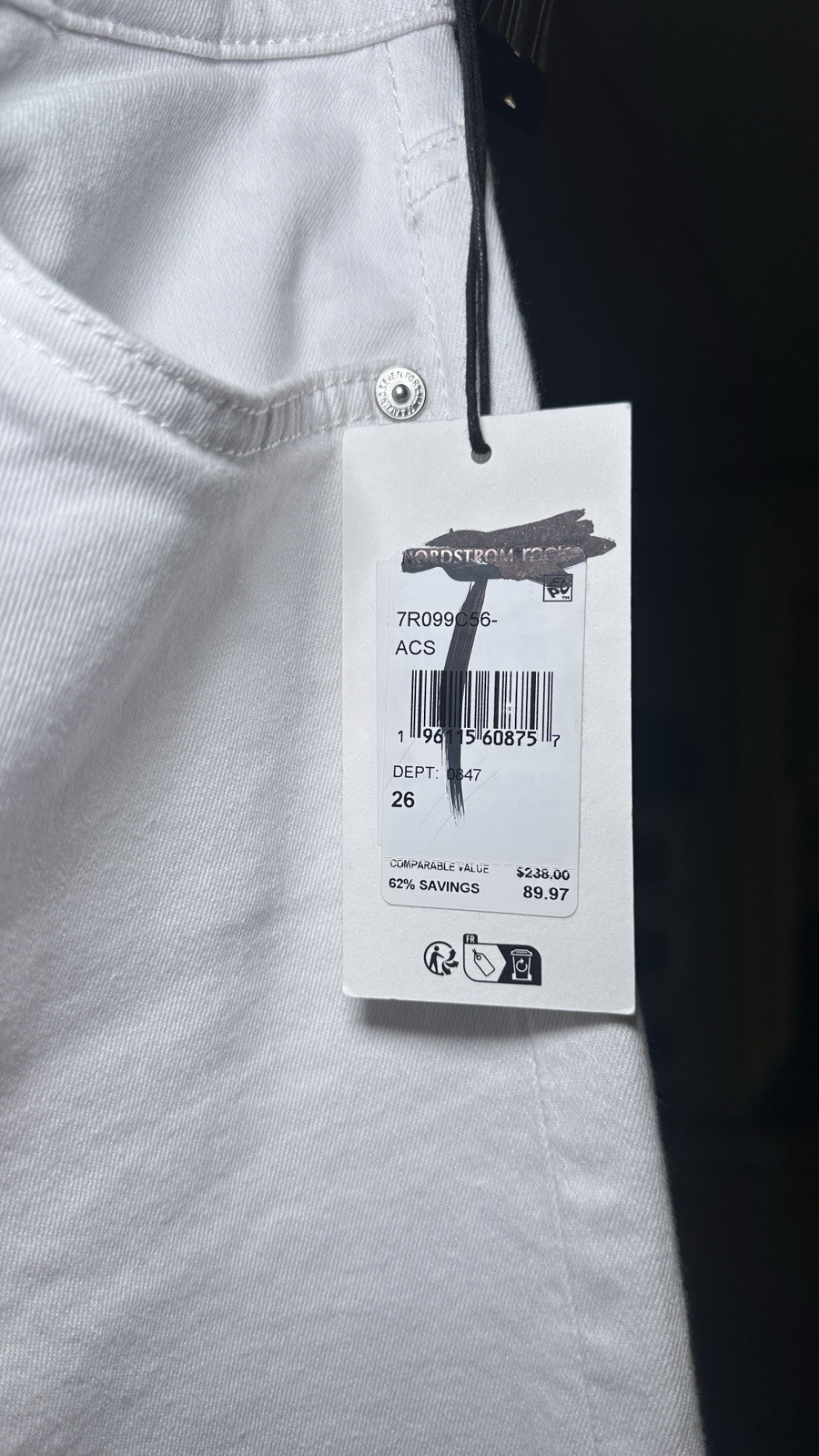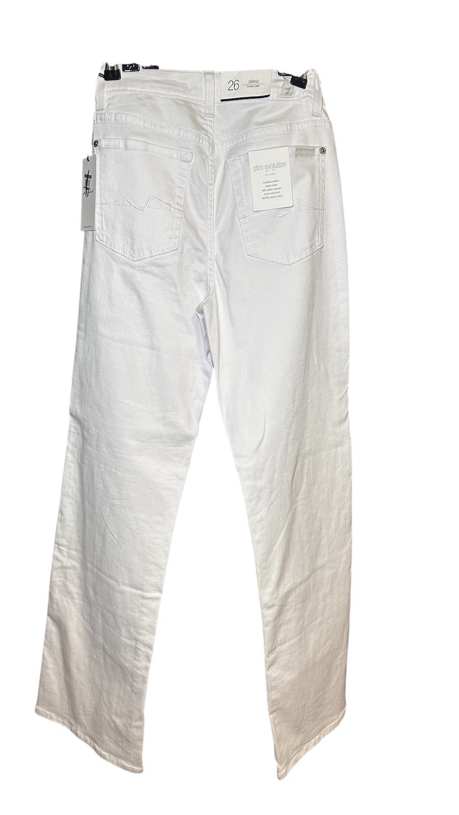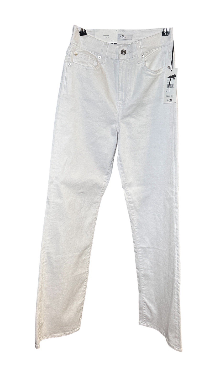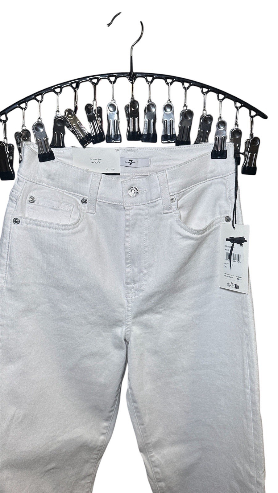 The product is a pair of women’s white straight leg jeans by 7 For All Mankind in size 26. These jeans feature a solid pattern, button closure, and a light fabric wash. Made from a blend of spandex and cotton denim, they have a regular fit and are designed with a side slit and stretch for comfort. Perfect for various occasions, from casual to party or going out, these jeans are a stylish and versatile addition to any wardrobe, offering a touch of glam and contemporary flair.