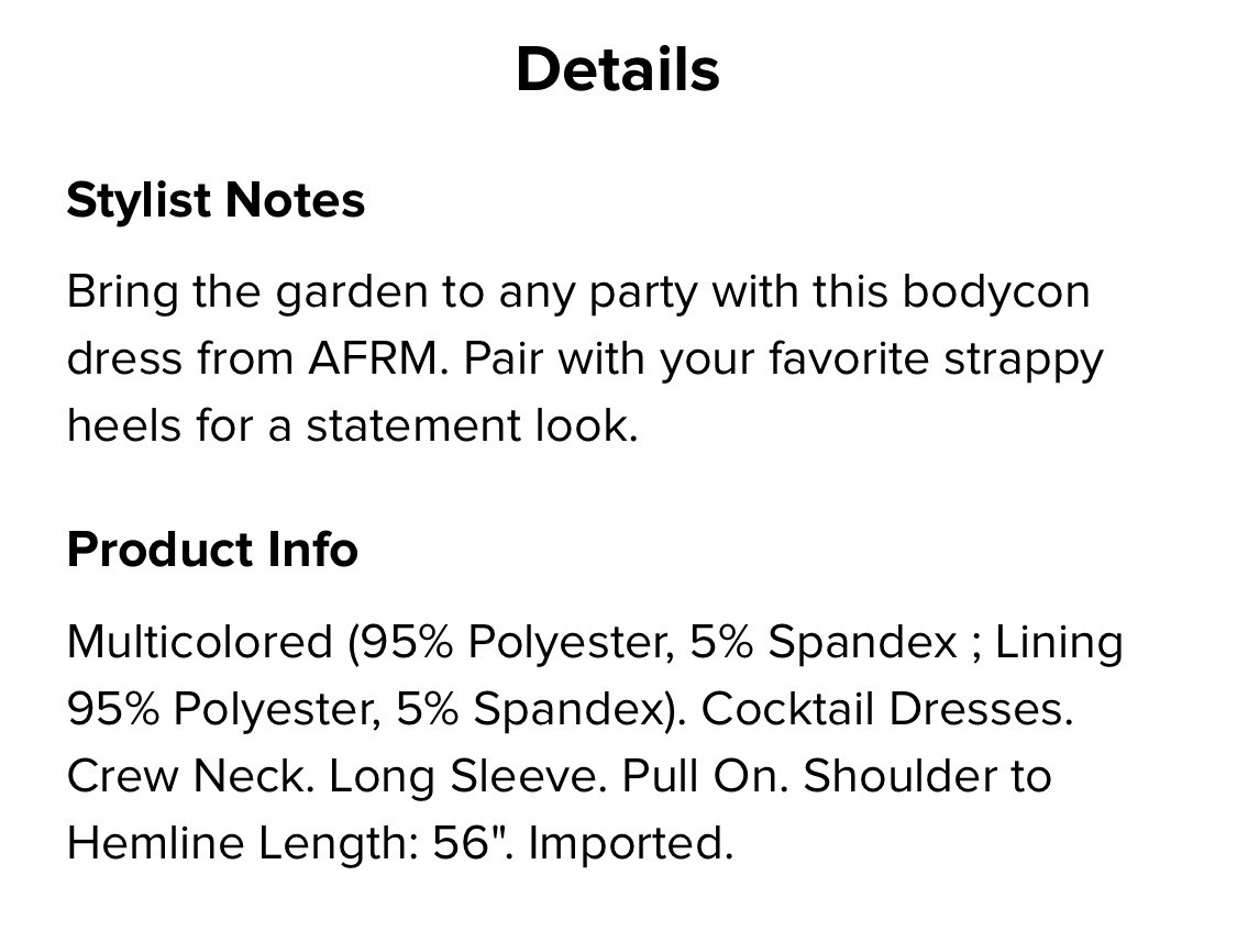 The Afrm Dress Didi Crewneck Dress in size XS is a stylish bodycon dress designed for women. It features a crew neck neckline, long length, and comes in a vibrant multicolor design. This dress is perfect for those looking to make a statement with their outfit and has a flattering fit for a size XS. With a unit quantity of 3, this dress is a versatile addition to any wardrobe, suitable for various occasions and settings.