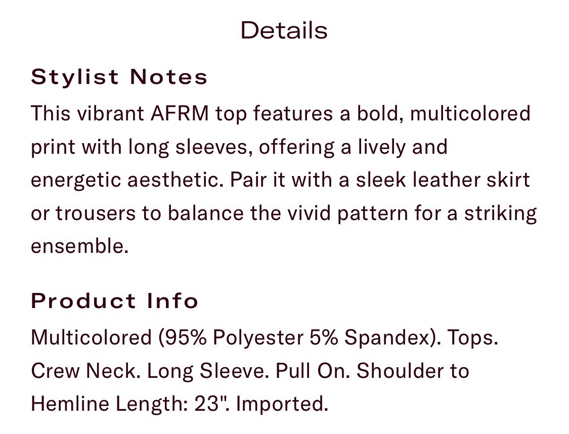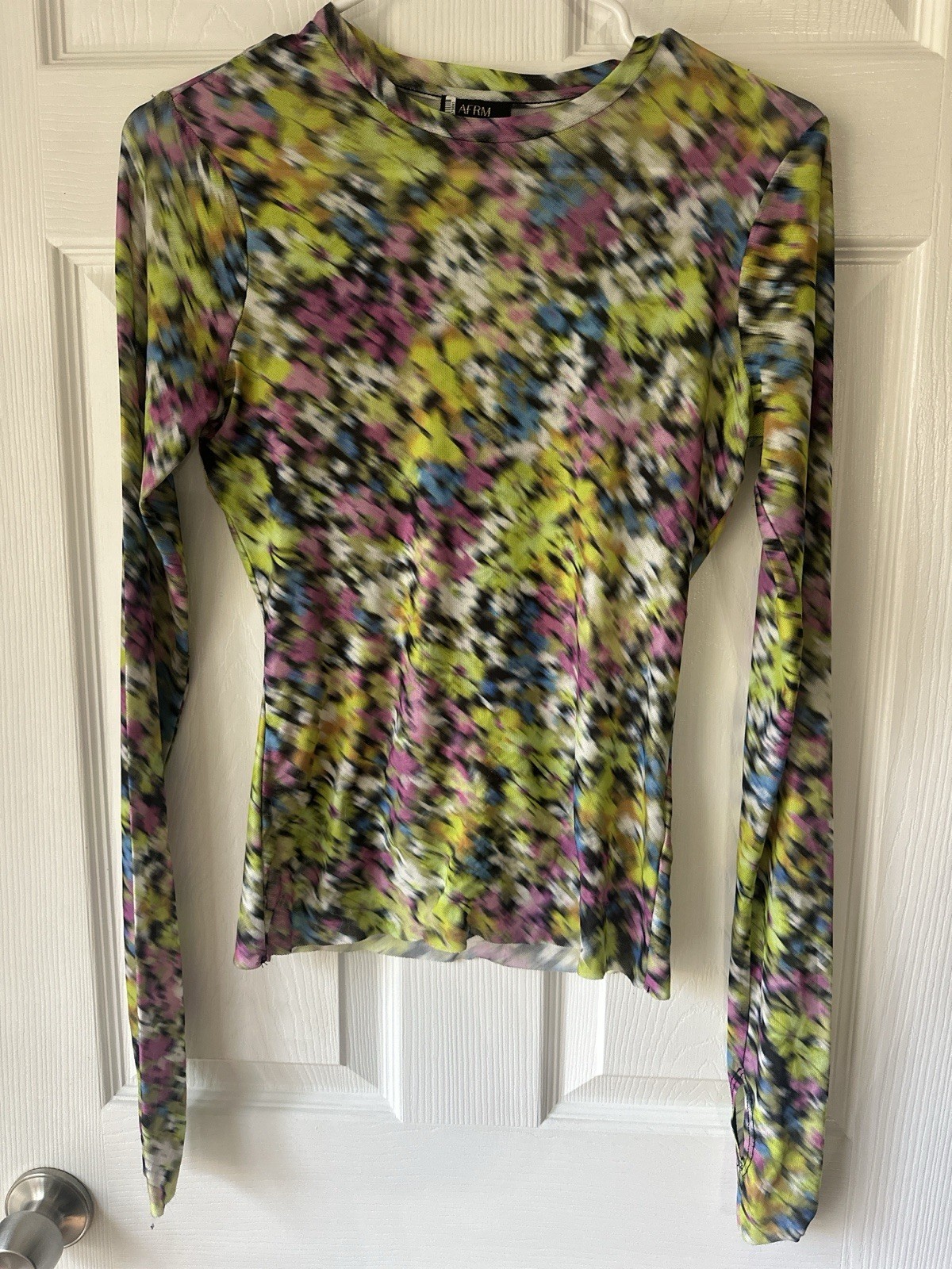 The AFRM Kaylee Women's Vibrant Colored Crewneck Long Sleeve in size M is a stylish and colorful floral patterned T-shirt. Made with a mesh fabric, this slim fit shirt features a classic/fitted sleeve design and a round neckline. Ideal for women looking for a basic yet trendy top with a colorful theme, this versatile piece can be worn in various ways to suit different outfits and occasions. The unit quantity is 3, making it a great addition to any wardrobe for those who appreciate vibrant and fashionable clothing options.