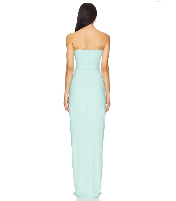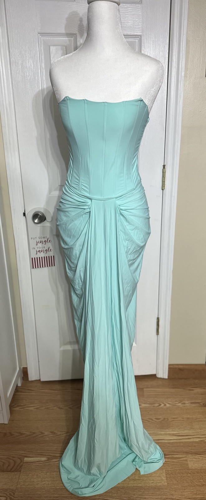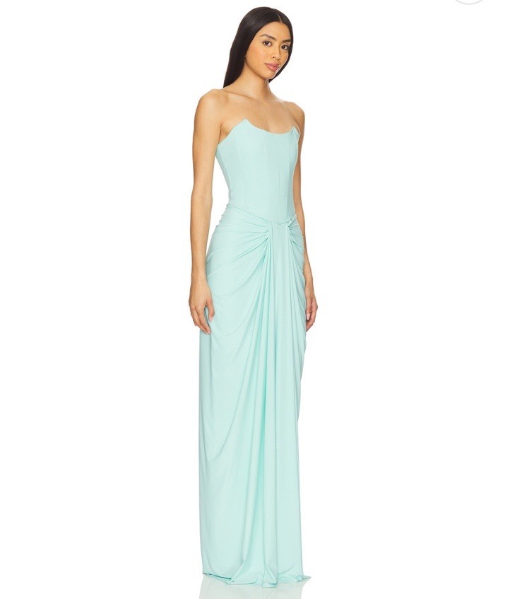 NWOT The Deme by Gabriella x Revolve Pearl Gown is a stunning green dress designed for women in size XS. It features a flattering bustier style and a long length, making it perfect for formal occasions or special events. The dress is from a reputable brand known for its high-quality and stylish designs, making it a great addition to any woman's wardrobe.