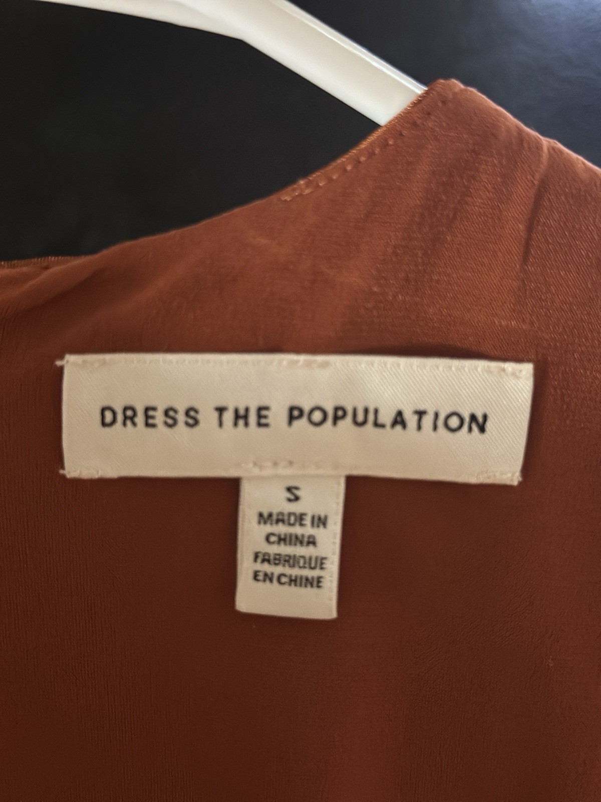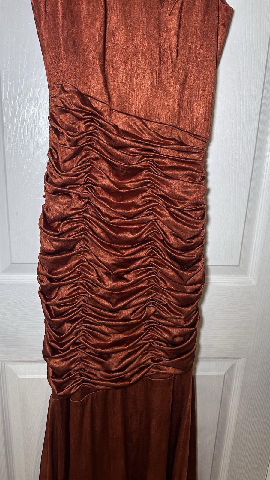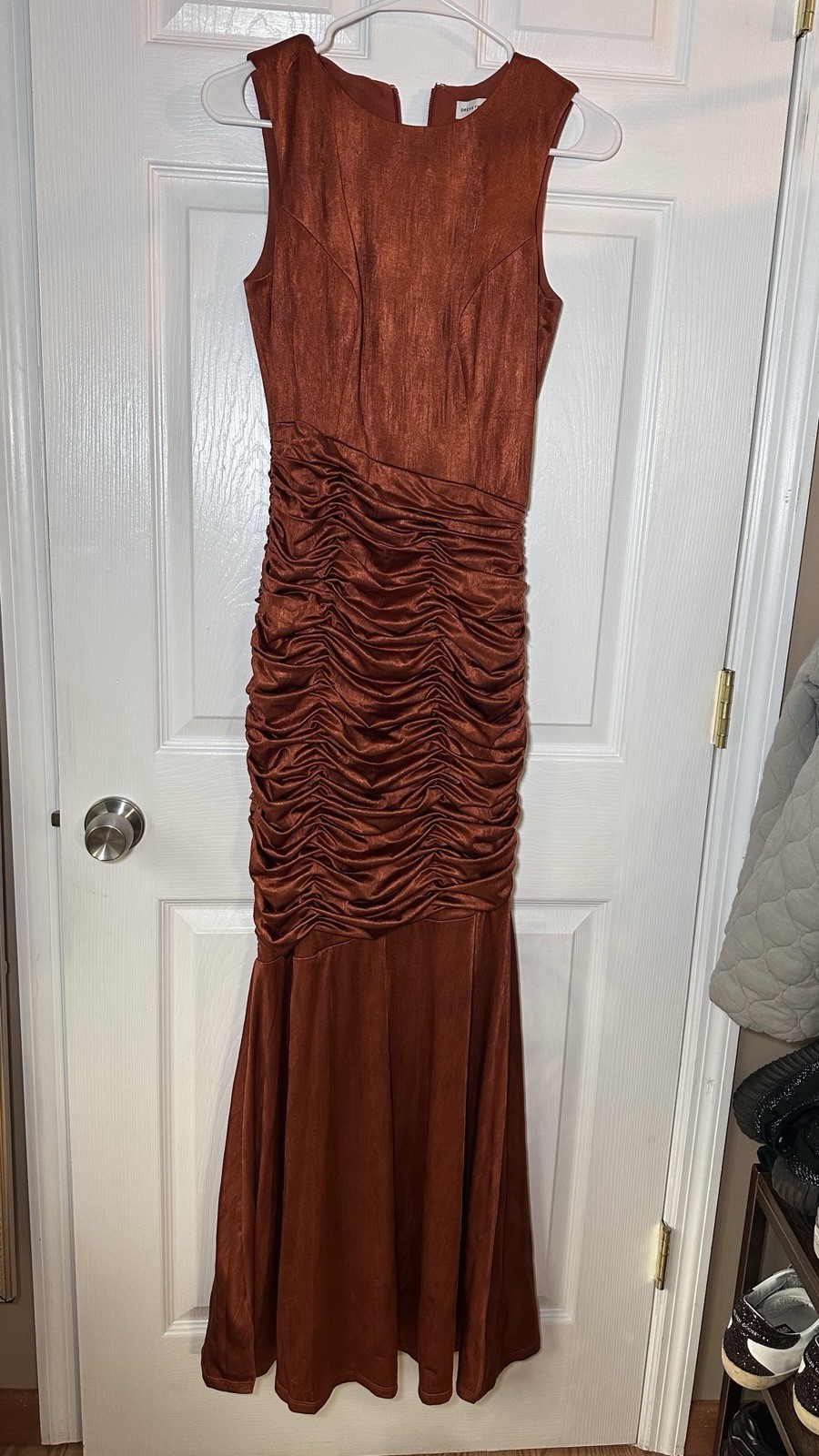The Dress The Population Violetta Mermaid Gown is a stunning ball gown designed for women in size small. Featuring a solid orange color with ruched detailing, this sleeveless dress has a long length that is perfect for formal occasions. The gown offers a mermaid silhouette, adding an elegant touch to the overall design. With an original retail price of $298, this dress is a stylish and sophisticated choice for any woman looking to make a statement at her next event.