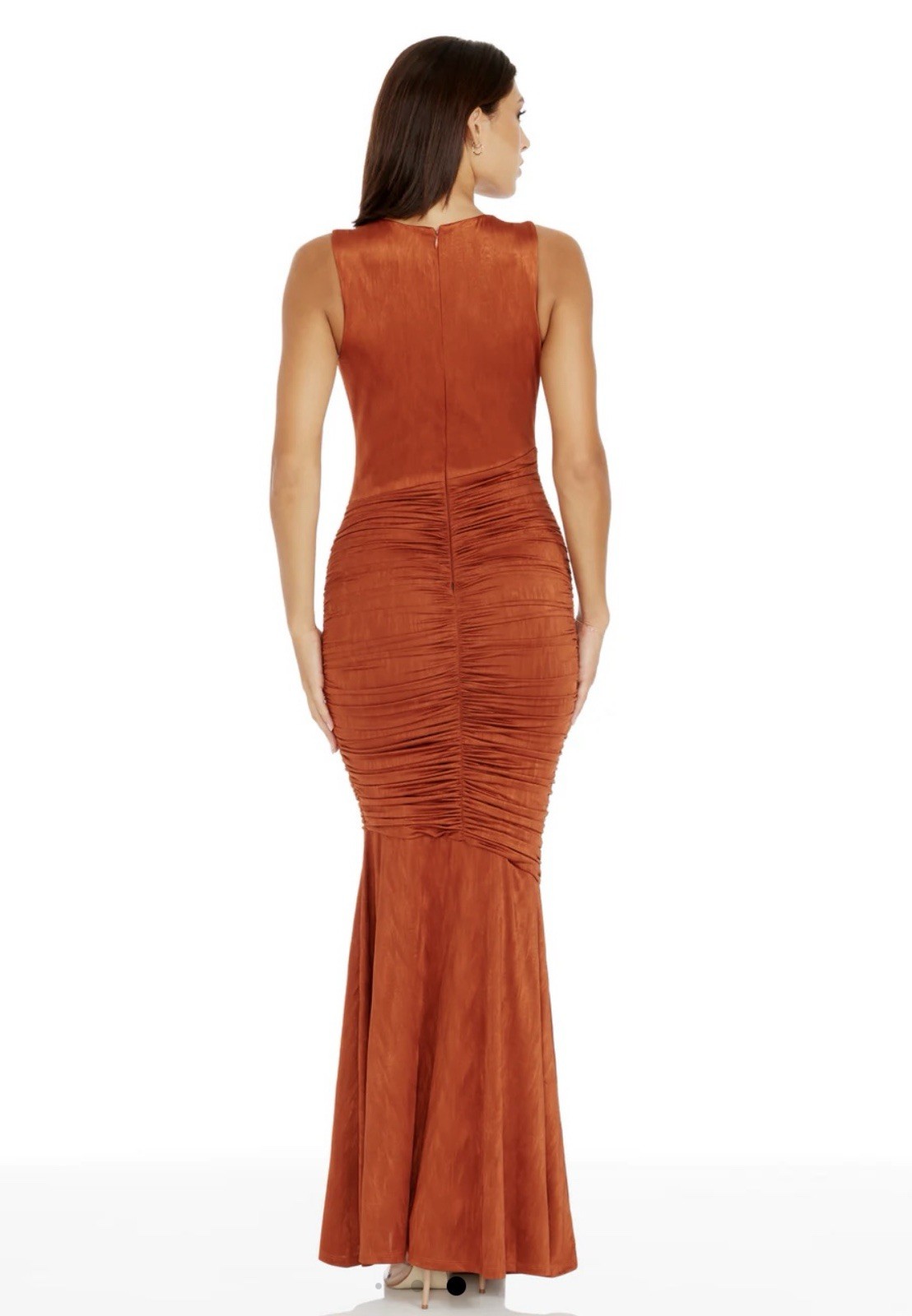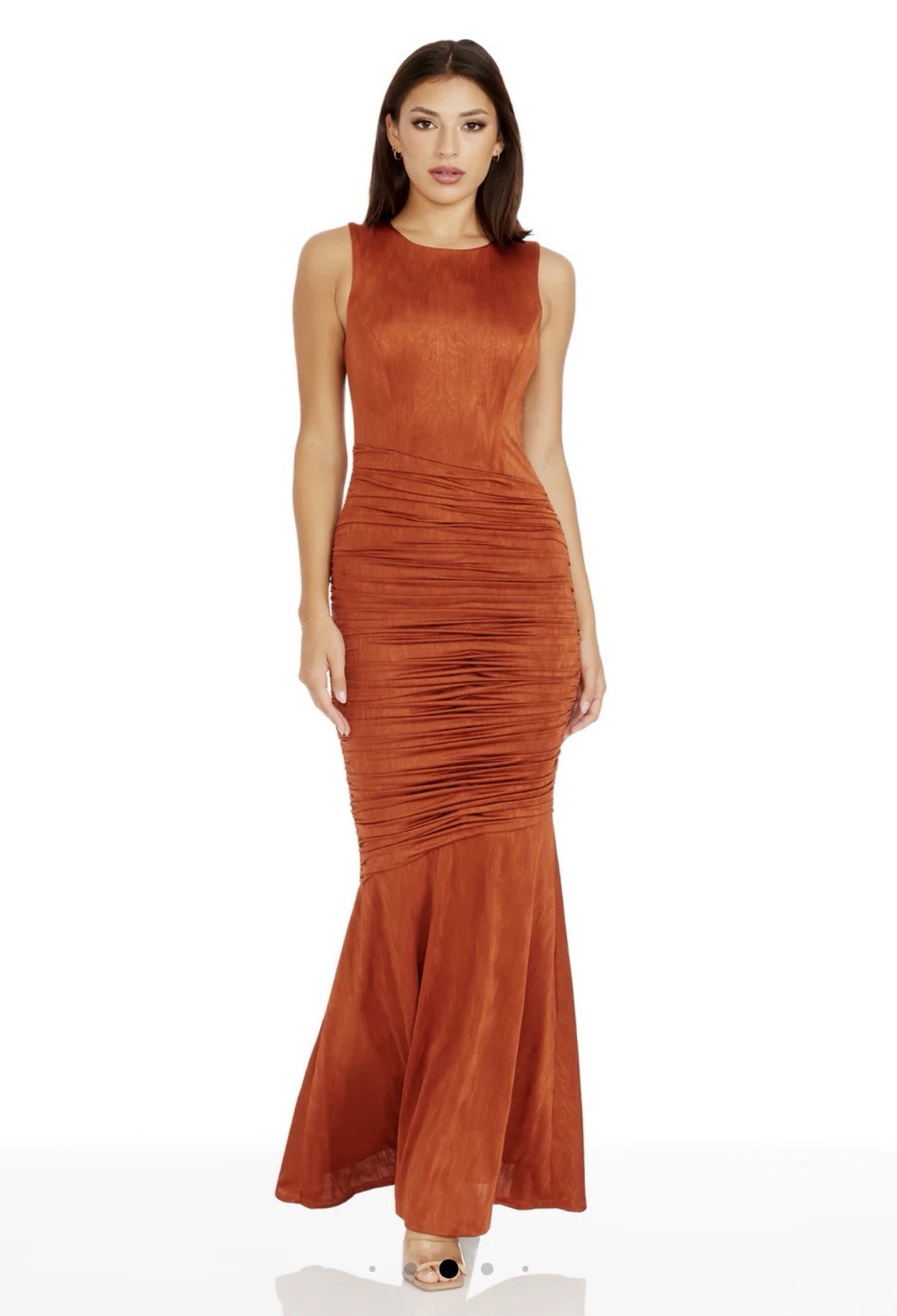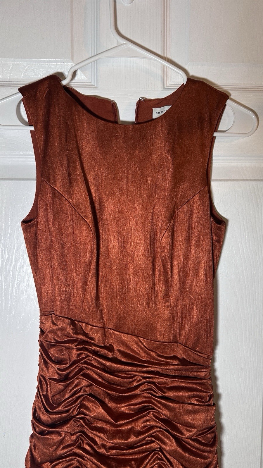 The Dress The Population Violetta Mermaid Gown is a stunning ball gown designed for women in size small. Featuring a solid orange color with ruched detailing, this sleeveless dress has a long length that is perfect for formal occasions. The gown offers a mermaid silhouette, adding an elegant touch to the overall design. With an original retail price of $298, this dress is a stylish and sophisticated choice for any woman looking to make a statement at her next event.