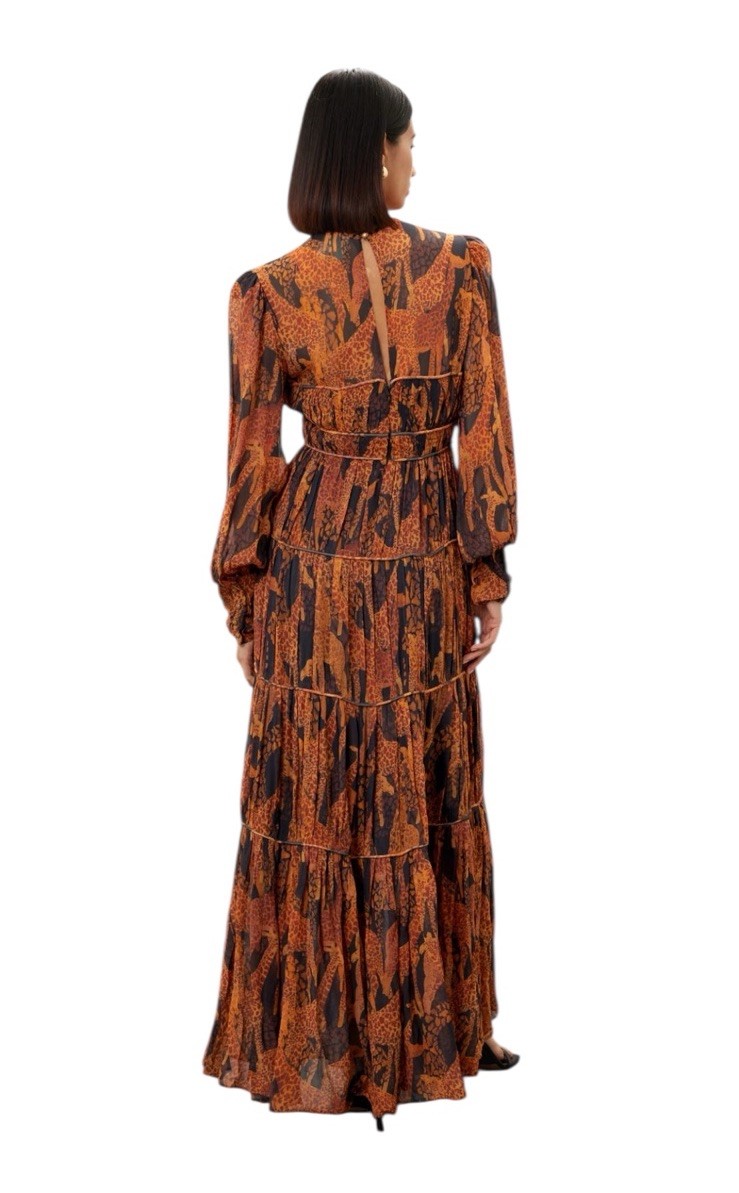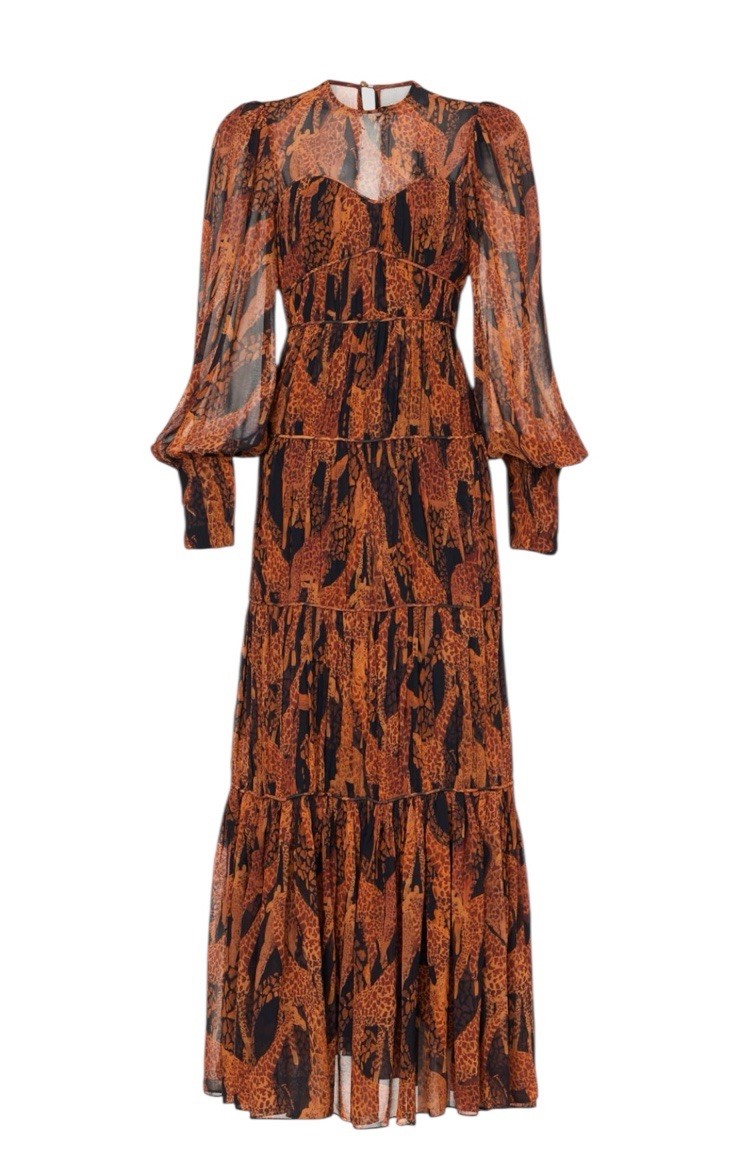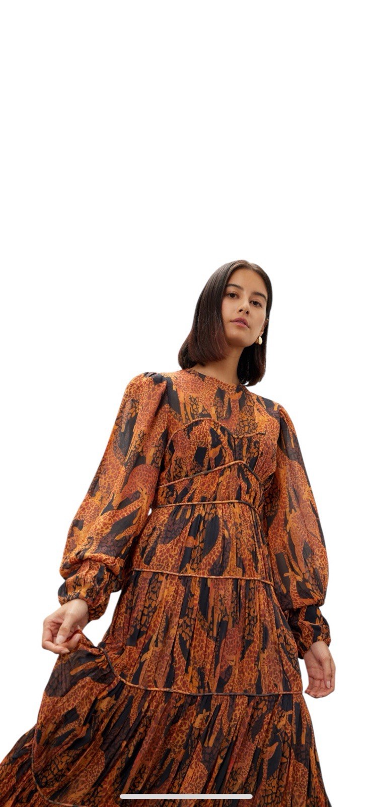 The Farm Rio Giraffe Puff Sleeve Dress in size small is a vibrant orange maxi dress with puff sleeves. This long dress is perfect for women looking for a stylish and colorful addition to their wardrobe. Made by the brand Farm Rio, known for their trendy designs, this dress is sure to make a statement with its fashionable features and eye-catching color.