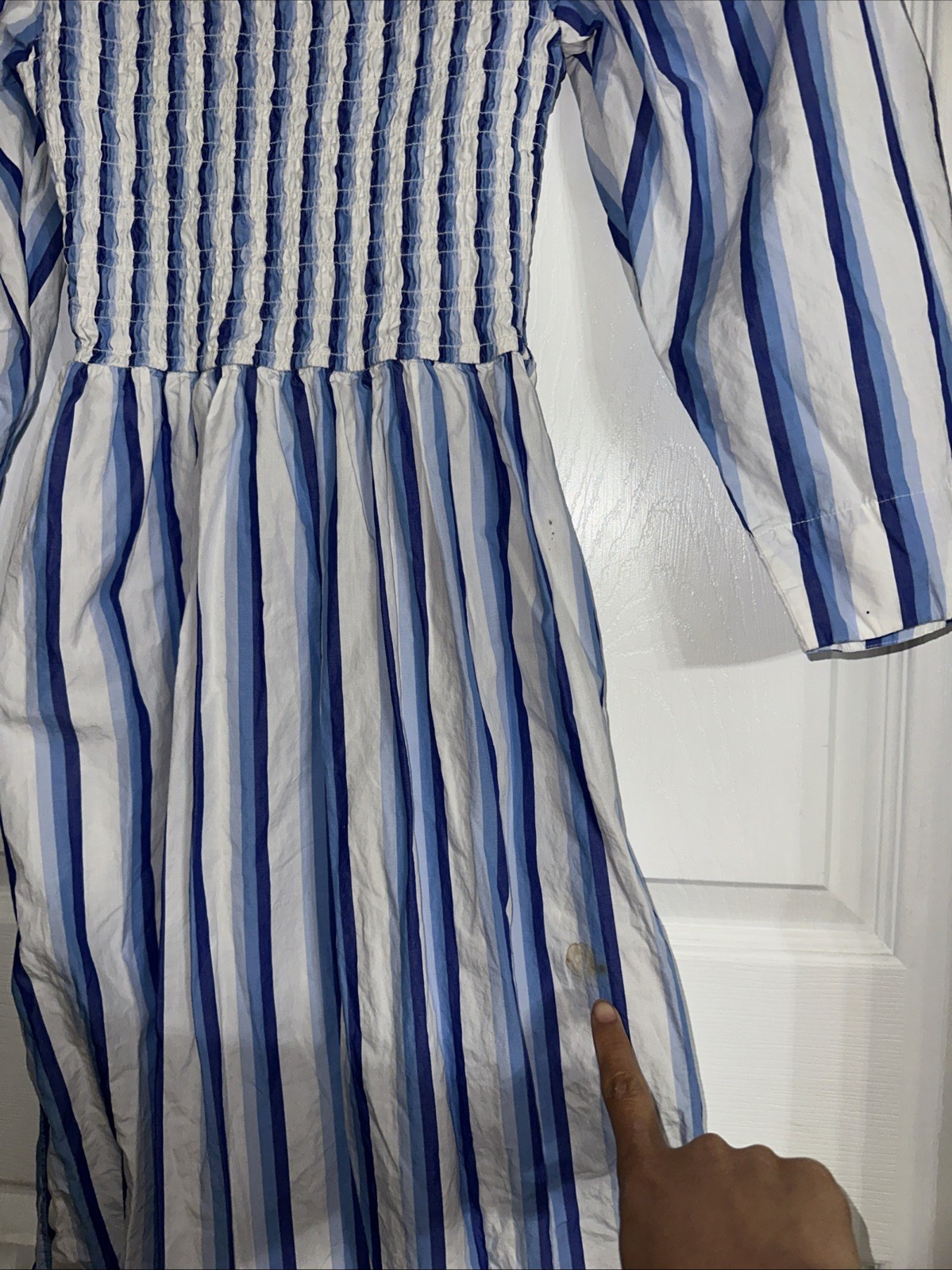 The GANNI Blue Striped Cotton Smock Midi Dress in size 32 features a flattering fit & flare style with 3/4 sleeves and a midi length. Made from cotton, this dress showcases a charming smocked detail and a colorful striped pattern, perfect for a stylish and comfortable look for any occasion. The brand Ganni is known for its high-quality and trendy designs, making this dress a must-have for any fashion-forward woman's wardrobe.