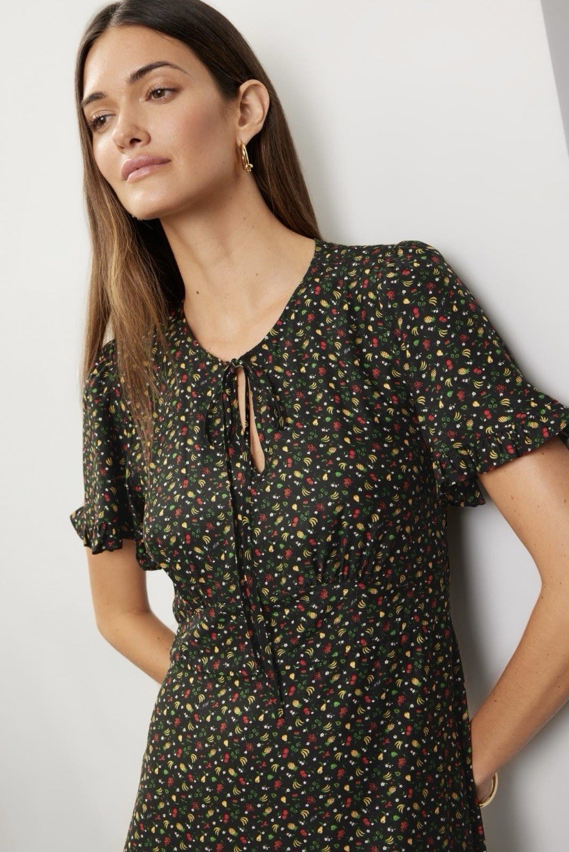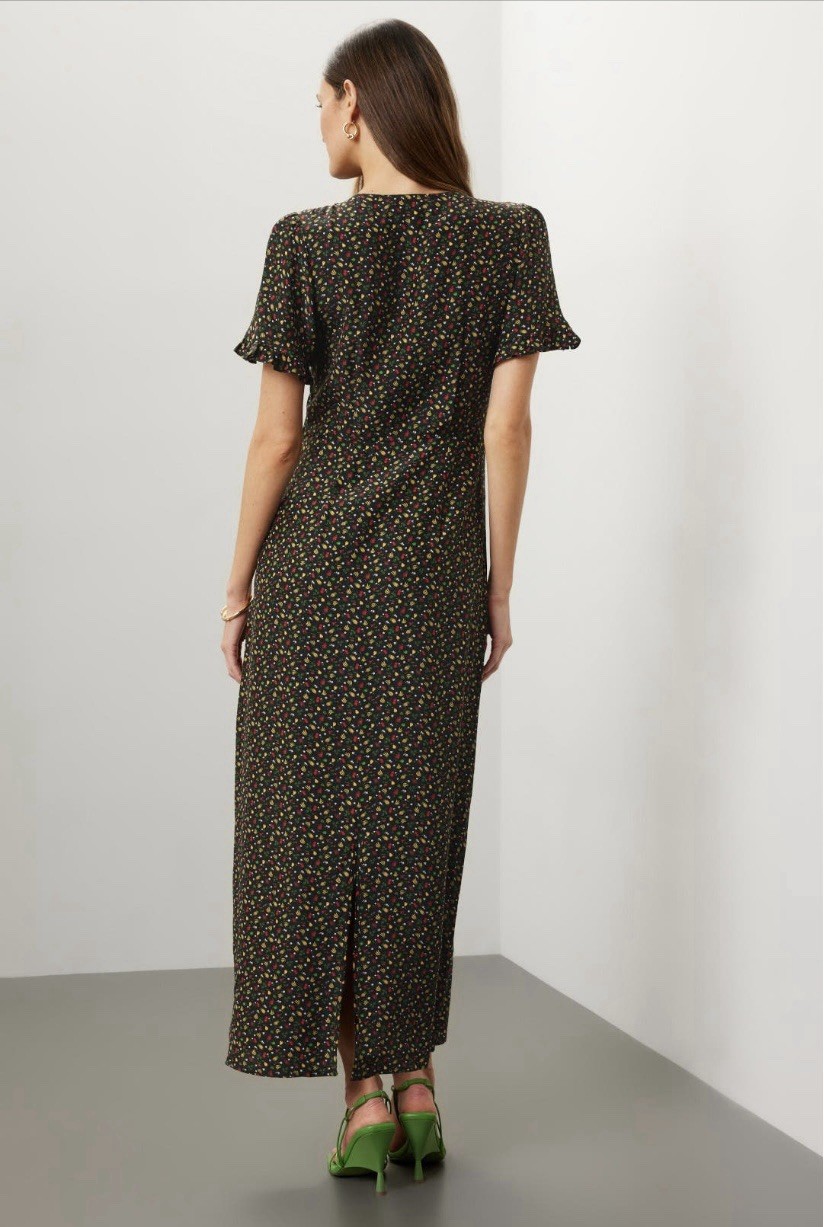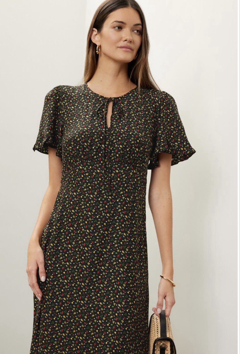 The HVN 100% Silk Dress in size 12 features a stylish star prints pattern in black with multiple color stars, making it a perfect choice for any woman looking for a long dress with a touch of love and elegance. With short sleeves and a midi dress length, this luxurious silk dress from HVN is sure to make a statement at any occasion. Perfect for those who appreciate high-quality materials and unique designs.