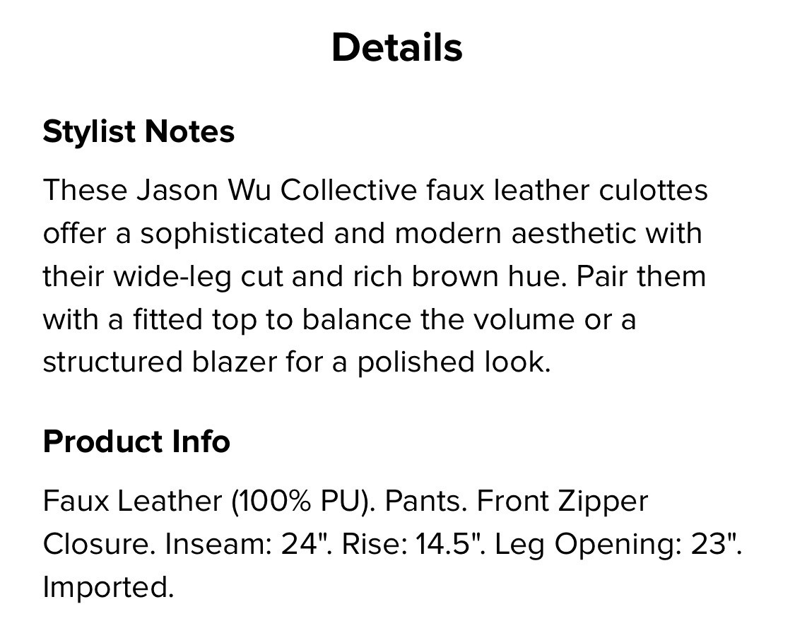 Jason Wu X RTR Faux Wide Leg Pants Msrp $300 Size- 0