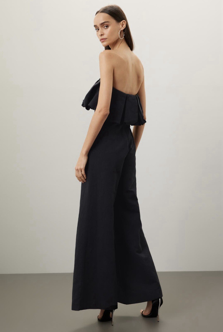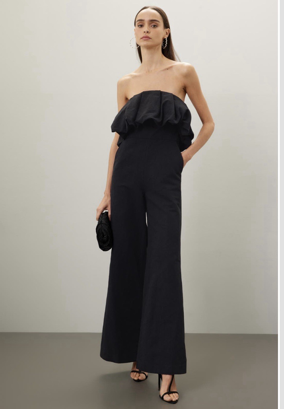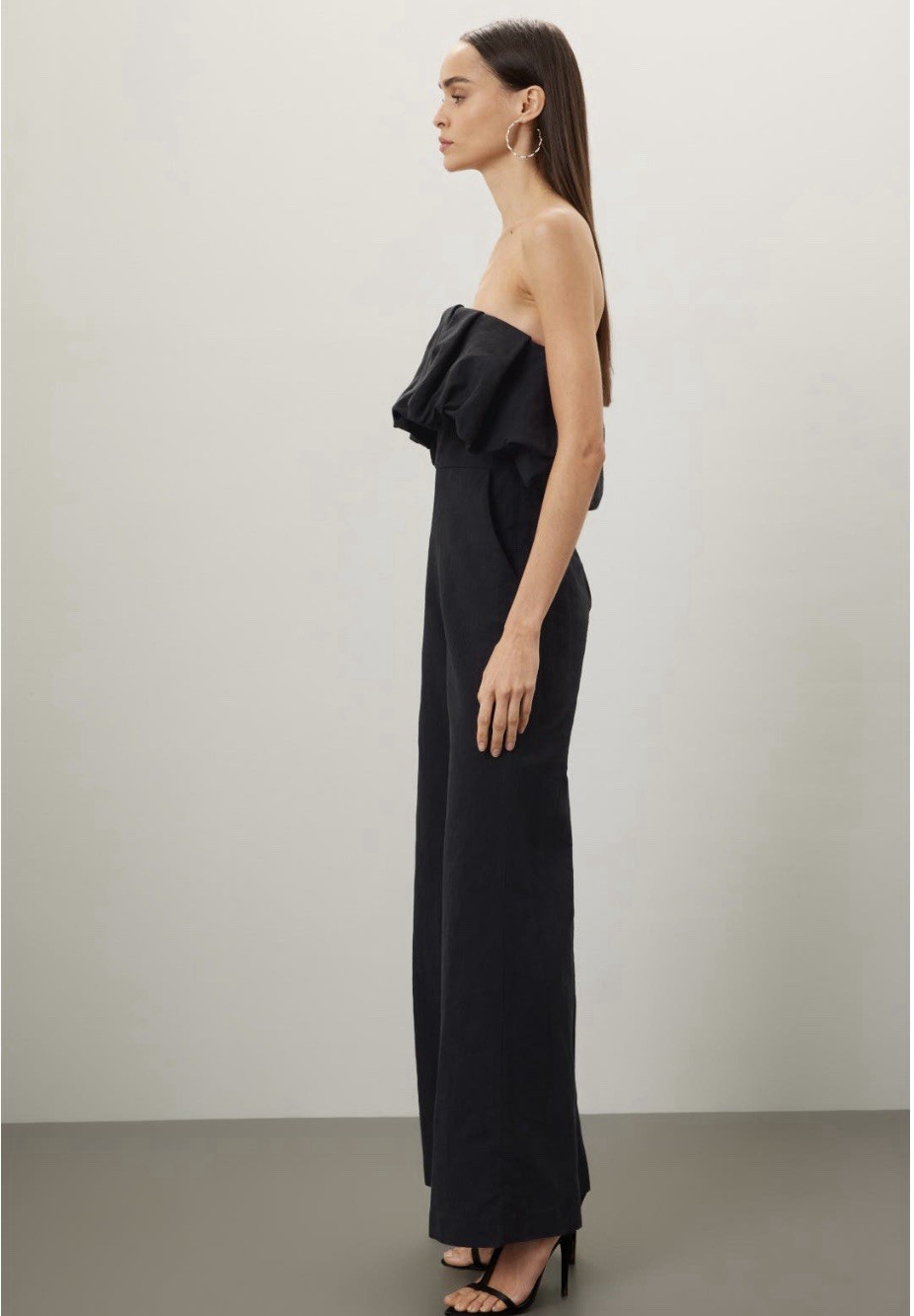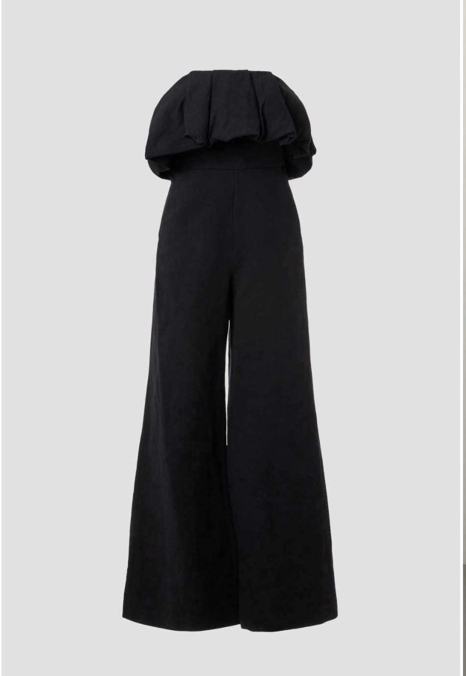 The Jonathan Simkhai Jumpsuit in size 0 features an off-the-shoulder neckline and puff sleeves, perfect for formal occasions like weddings, parties, or cocktails. Made from a luxurious blend of polyester, linen, and cotton, the jumpsuit is designed with a backless style, built-in bra, and collarless construction. The black jumpsuit also includes shaping and asymmetrical details, with a bubble hem for added flair. With its wide-leg silhouette and elegant design, this one-piece outfit is a versatile choice for all seasons and embodies a combination of designer, bohemian, and classic themes.