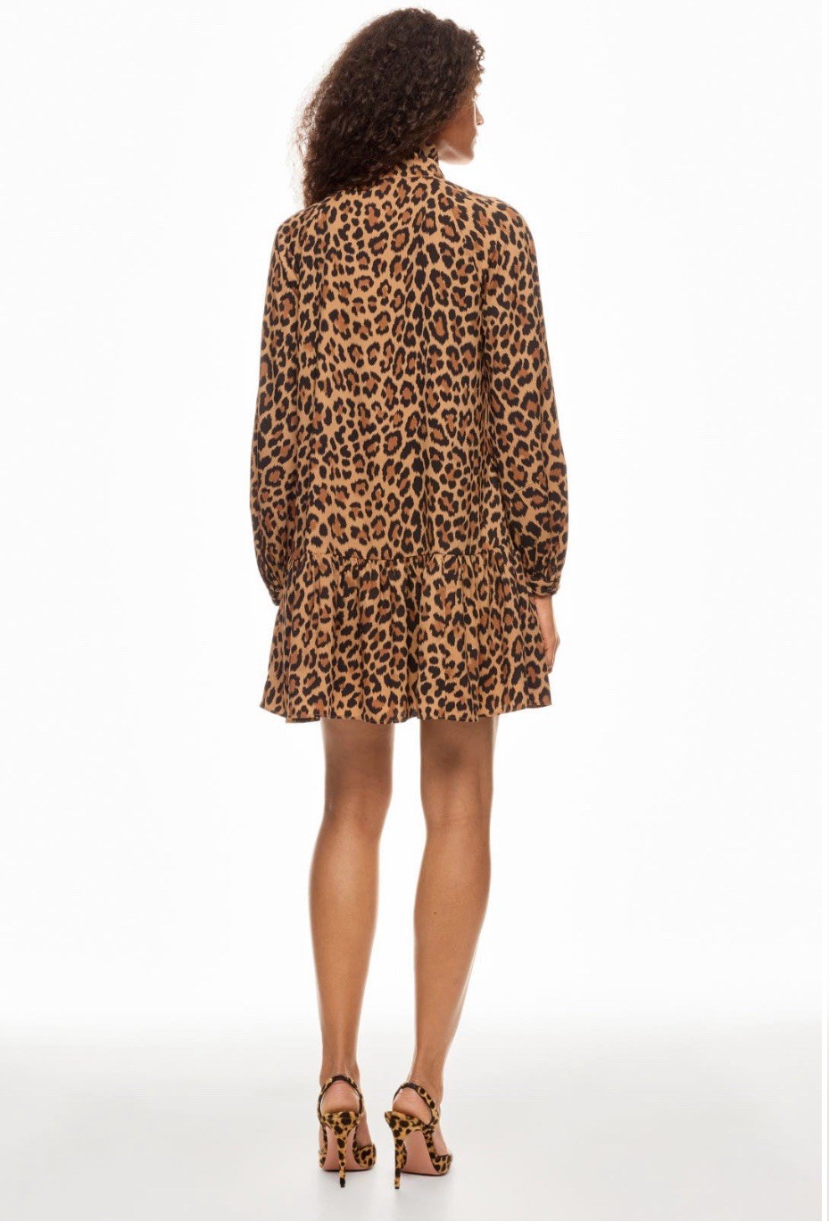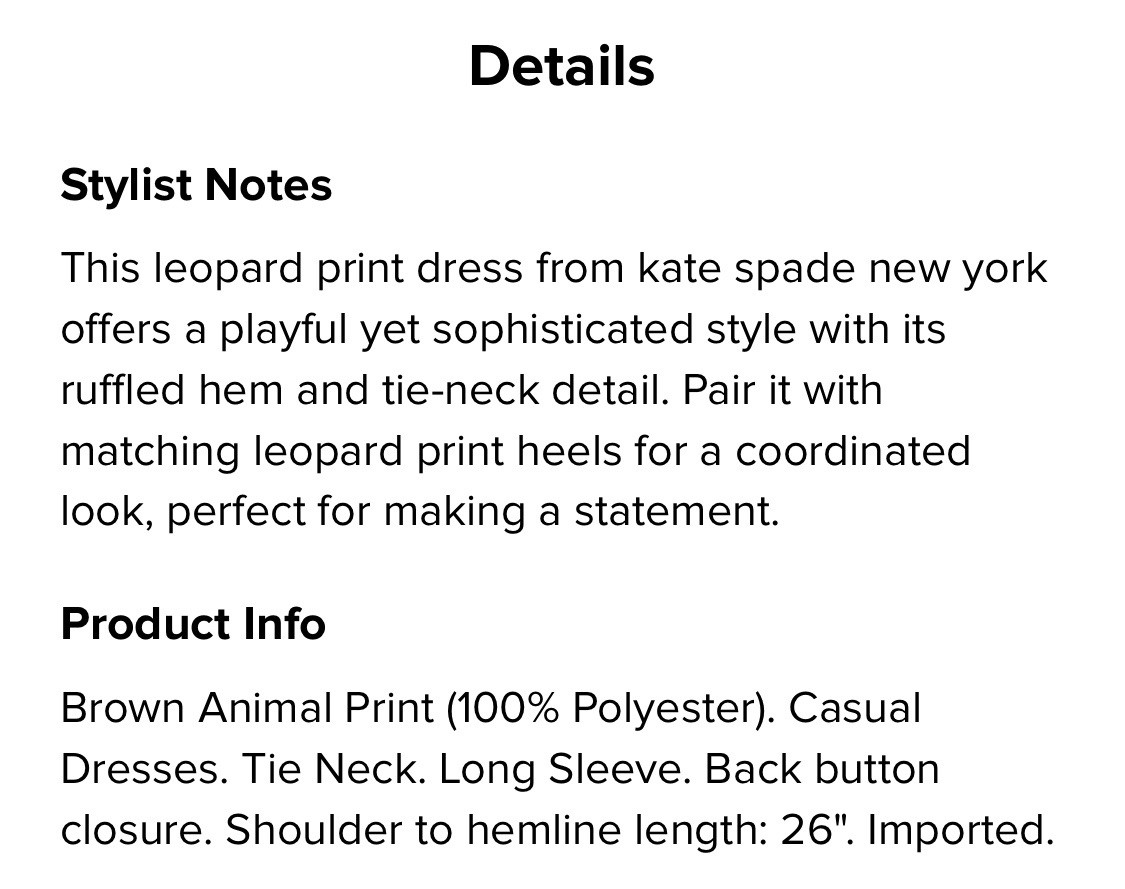 The Kate Spade New York Leopard Print Tie Neck dress in size Medium is a stylish and trendy choice for women. With its knee-length design and mini style, this dress is perfect for making a statement with its bold leopard print. The tie closure adds a unique touch to the overall look, making it a fashionable and eye-catching option for any wardrobe.
