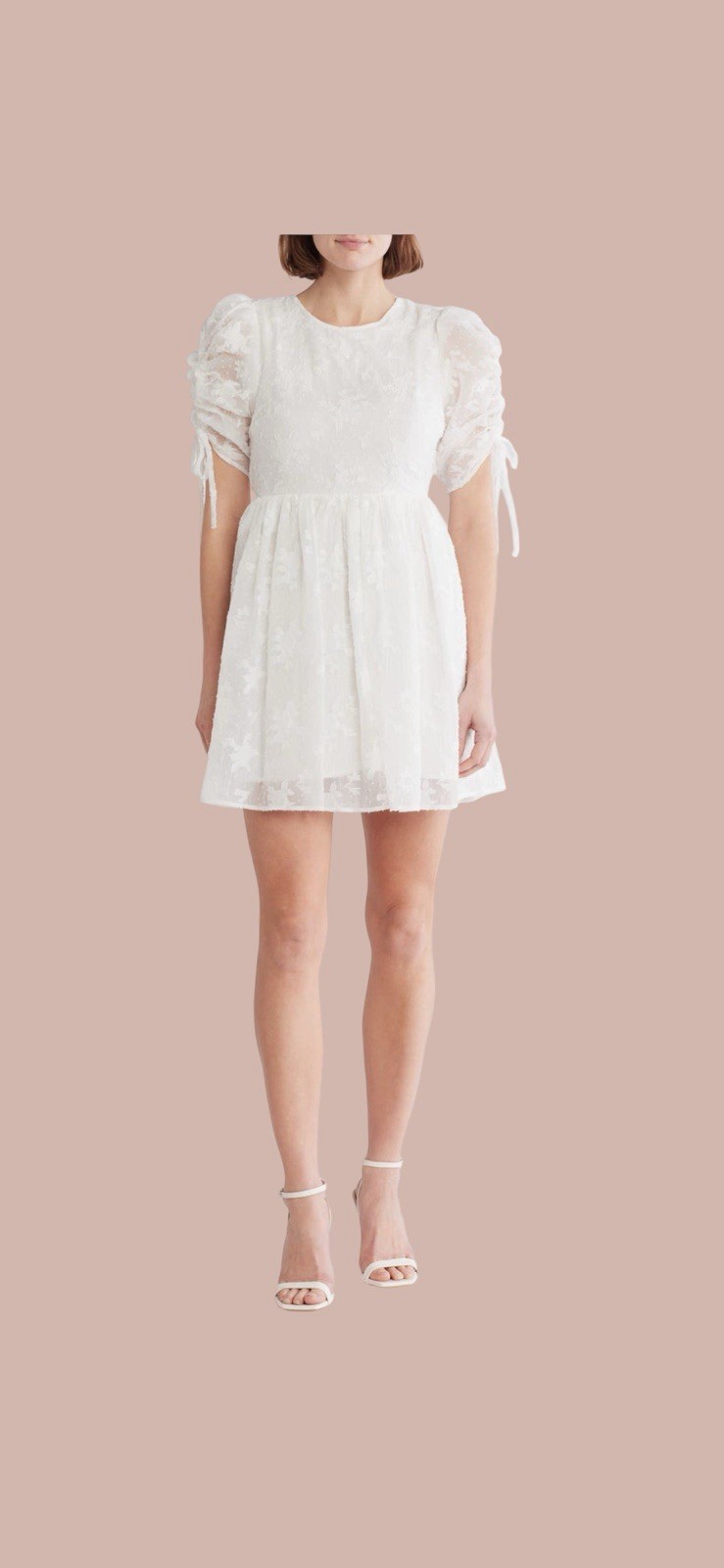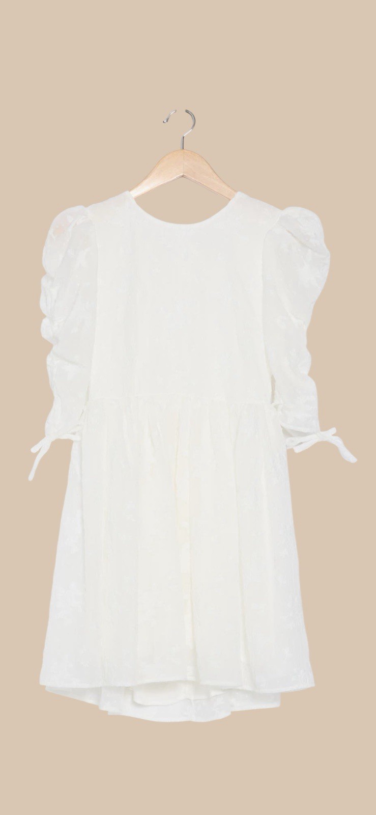 Dainty jacquard blooms add charming texture to this fit-and-flare minidress framed by bow-trimmed puffy sleeves, perfect for effortlessly stylish warm-weather days.