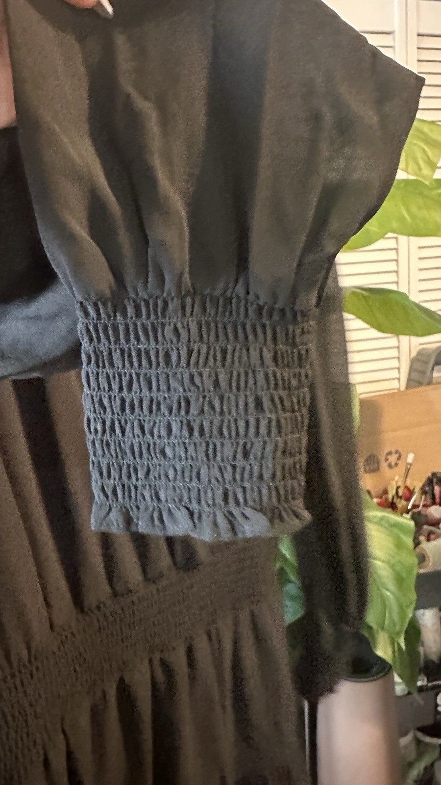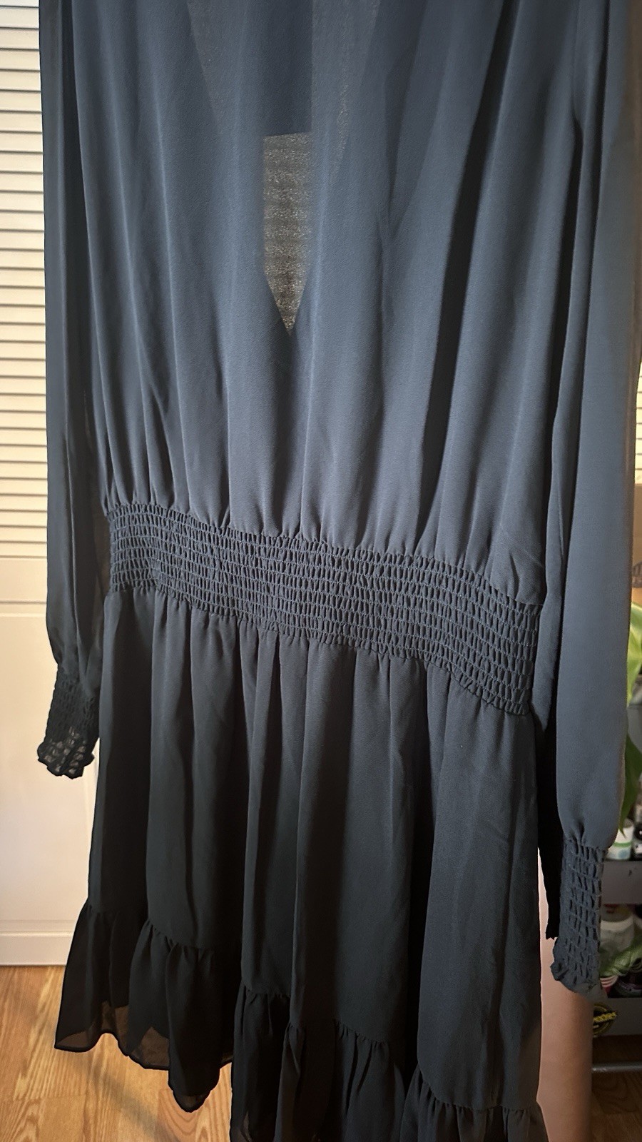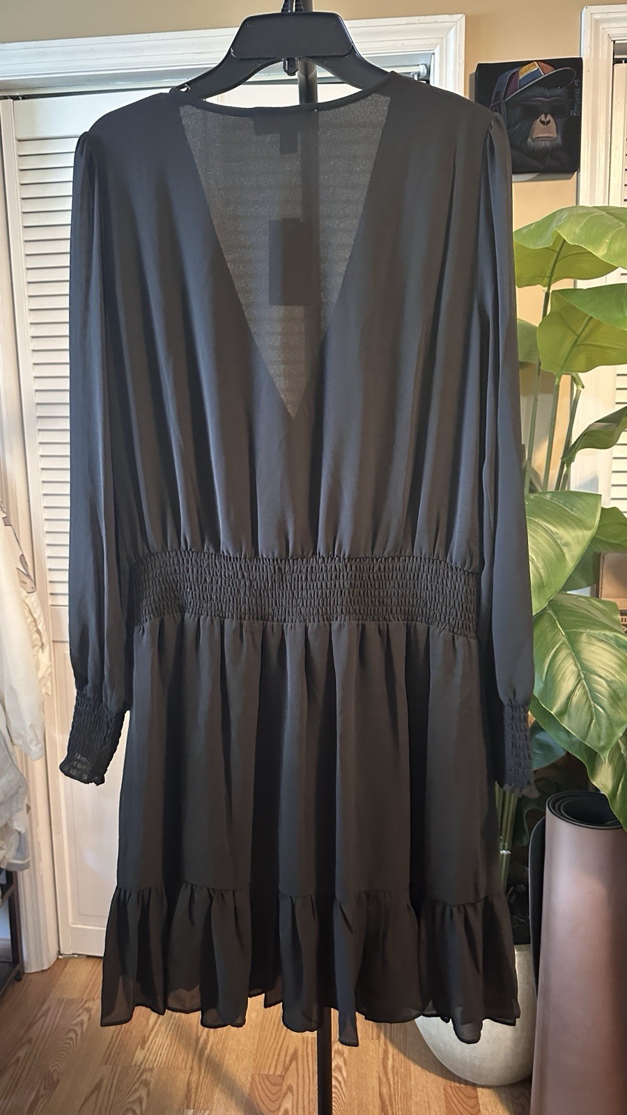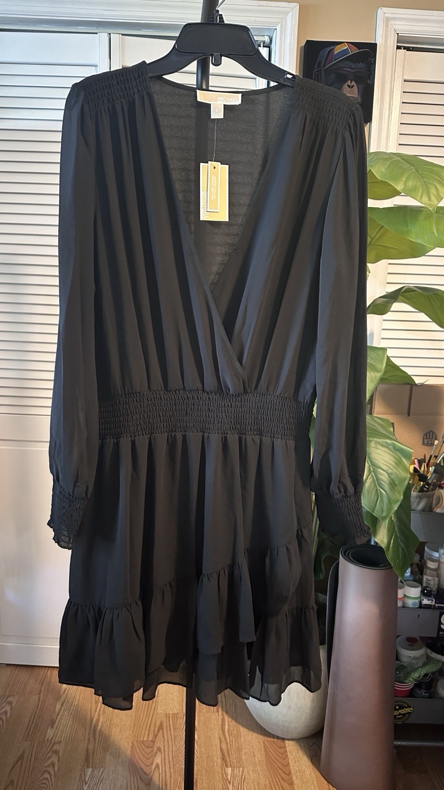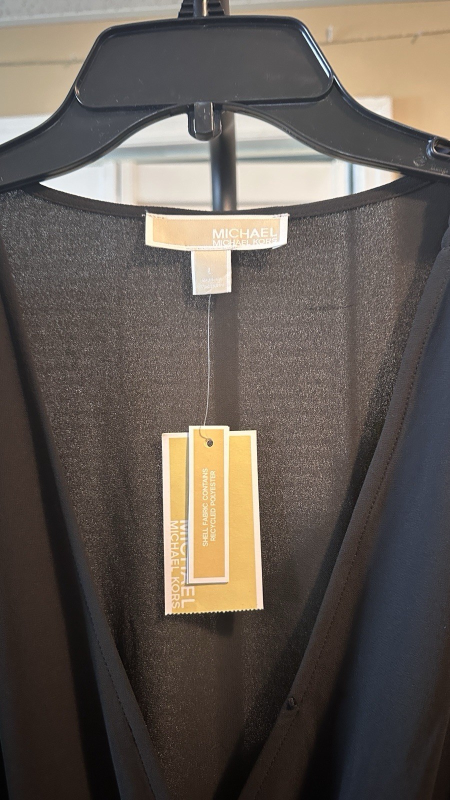 The product is a brand new Michael Kors black dress in size large. This knee-length wrap dress is designed for women and is in a sleek black color. Perfect for a stylish and sophisticated look, this dress is a versatile addition to any wardrobe, suitable for various occasions.