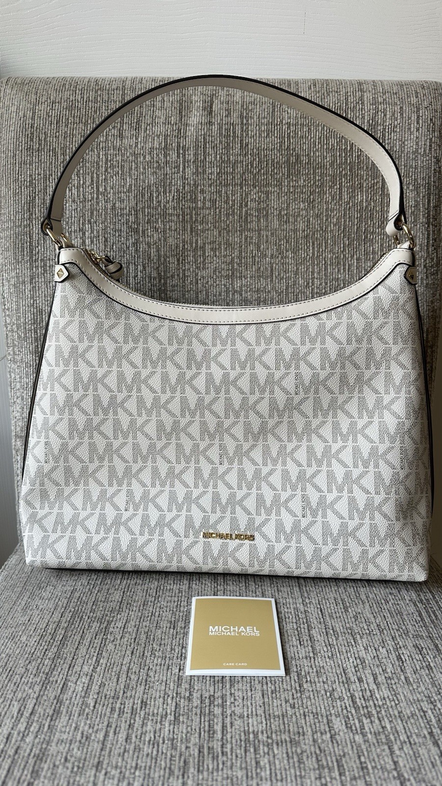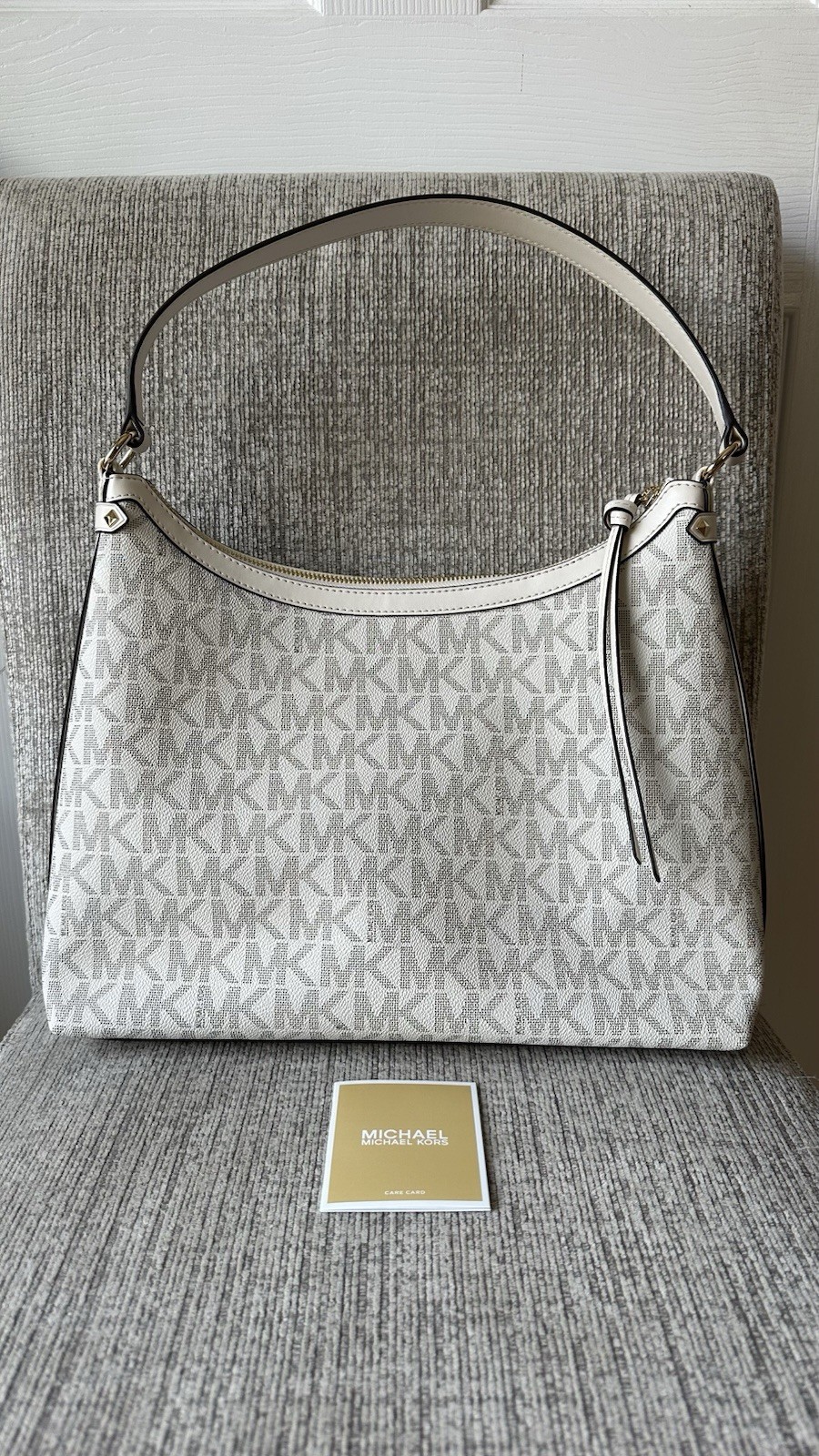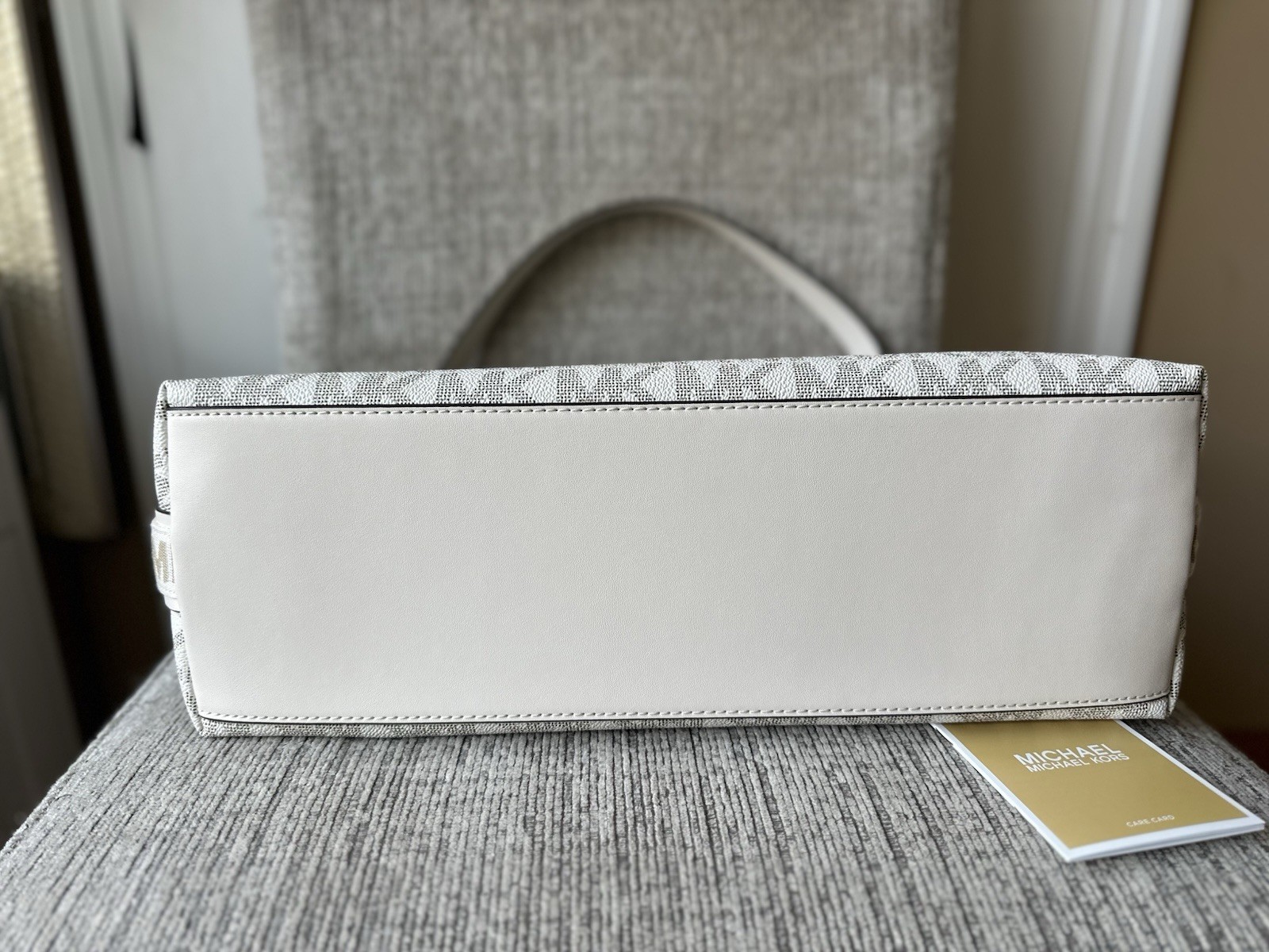This Michael Kors Shoulder Bag is a stylish and versatile accessory for women. Made of leather with a fabric lining, this medium-sized bag features a zip closure and a white leather handle/strap. The natural white exterior color and white lining give it a clean and classic look, while the inner pockets provide functionality. The bag also includes a brand card and is part of the Michael Kors Signature Bag product line, making it a designer piece with a touch of luxury. Ideal for everyday use or special occasions, this shoulder bag is a must-have for any fashion-forward woman.