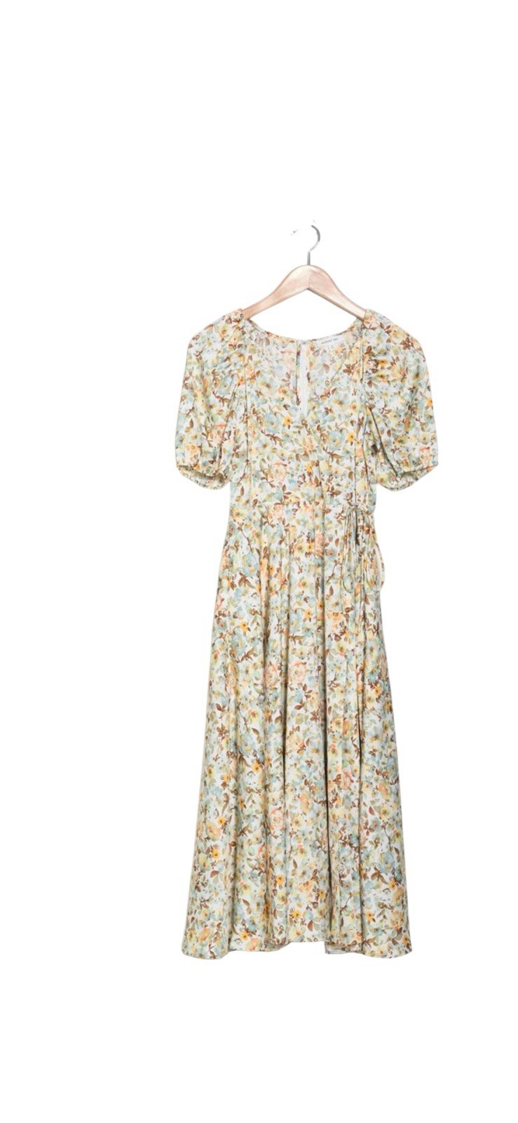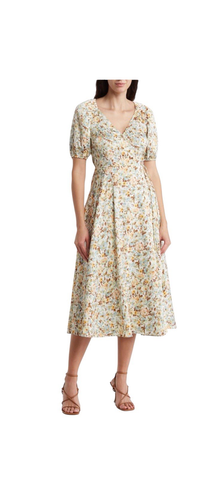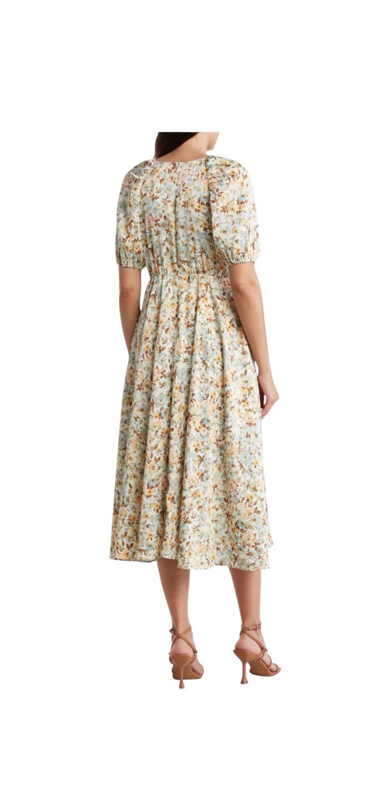 Puffy sleeves and blossoming flowers add a dose of sweetness to an ankle-grazing midi with a waist-defining tie.