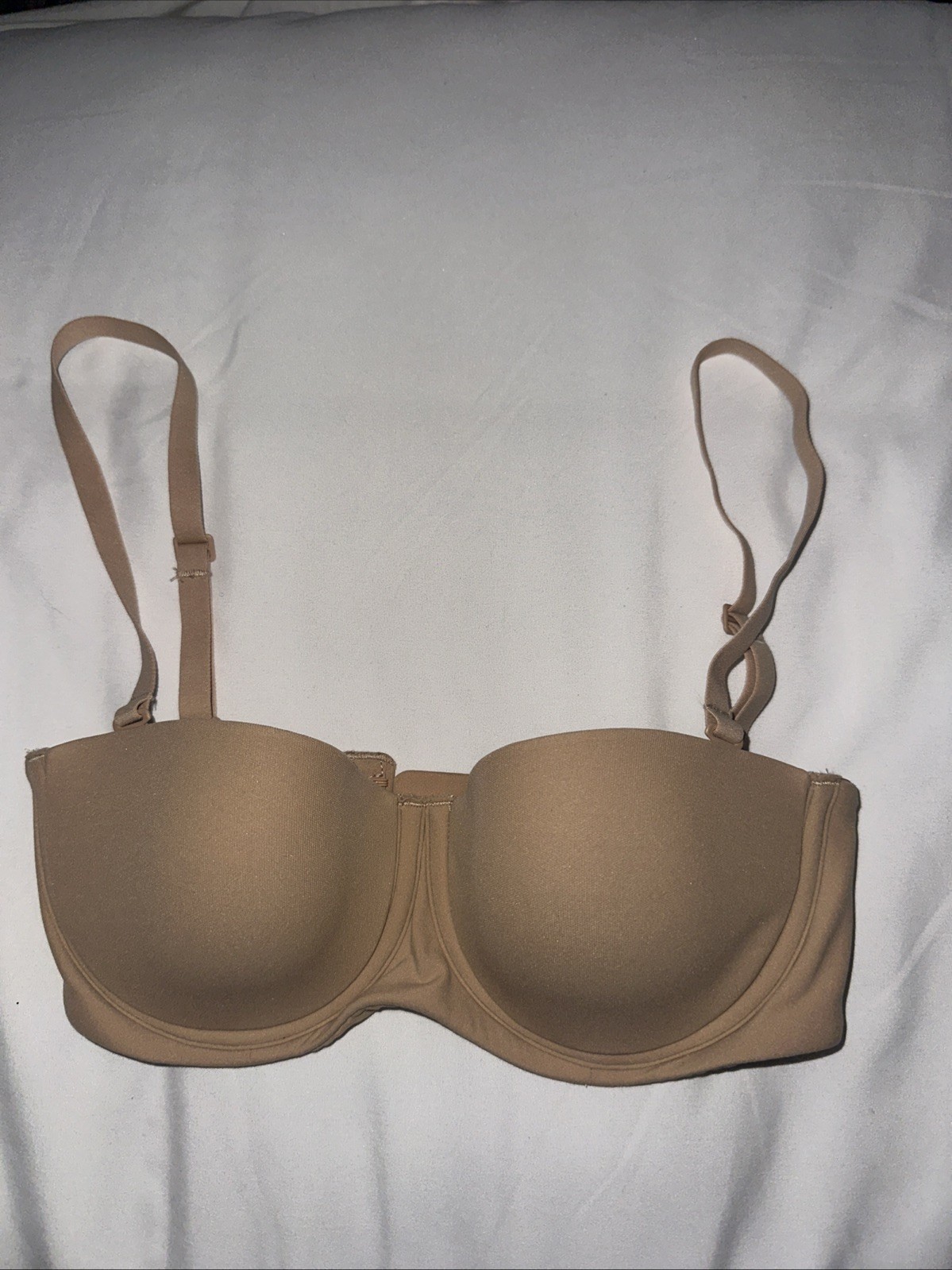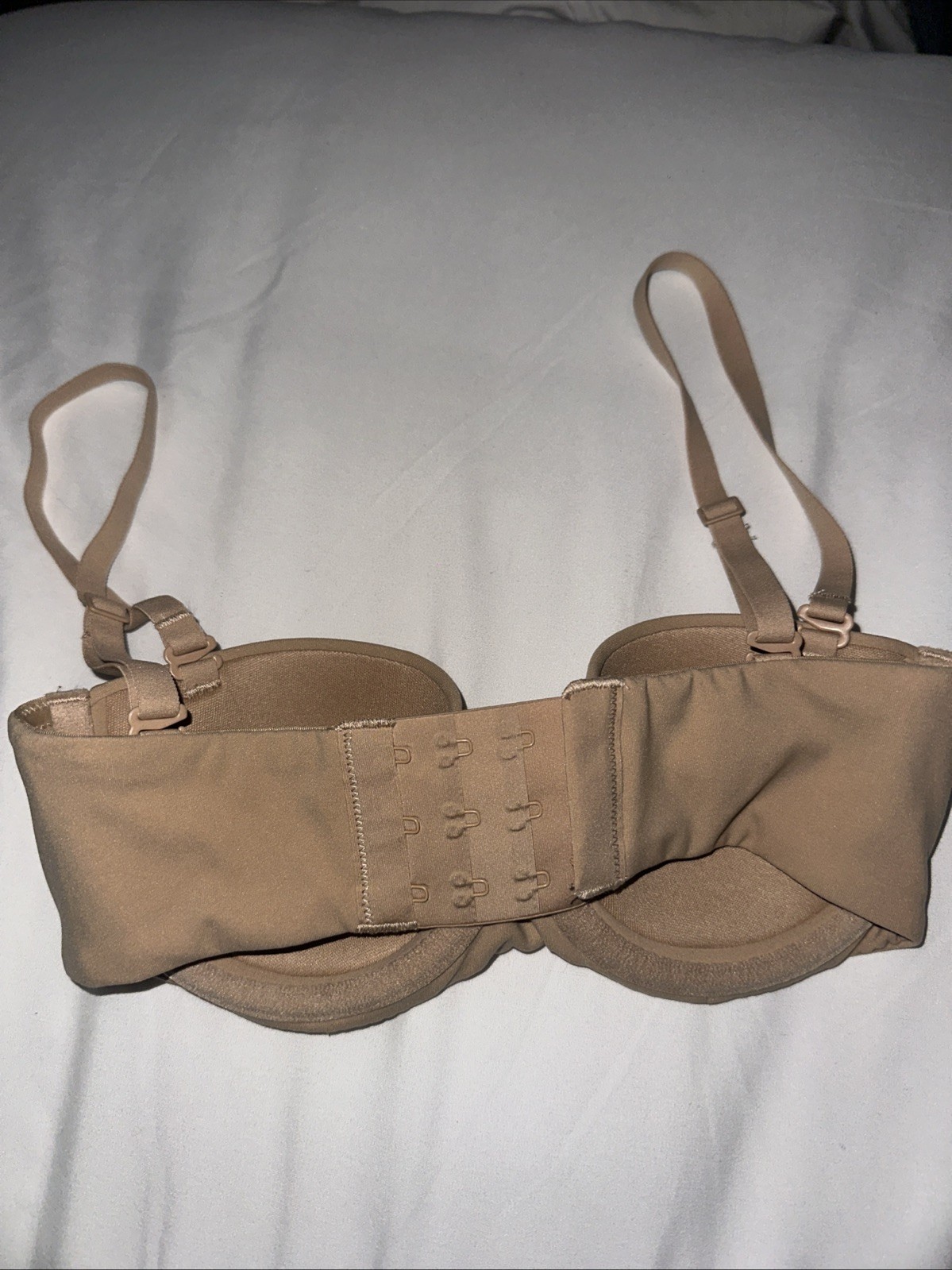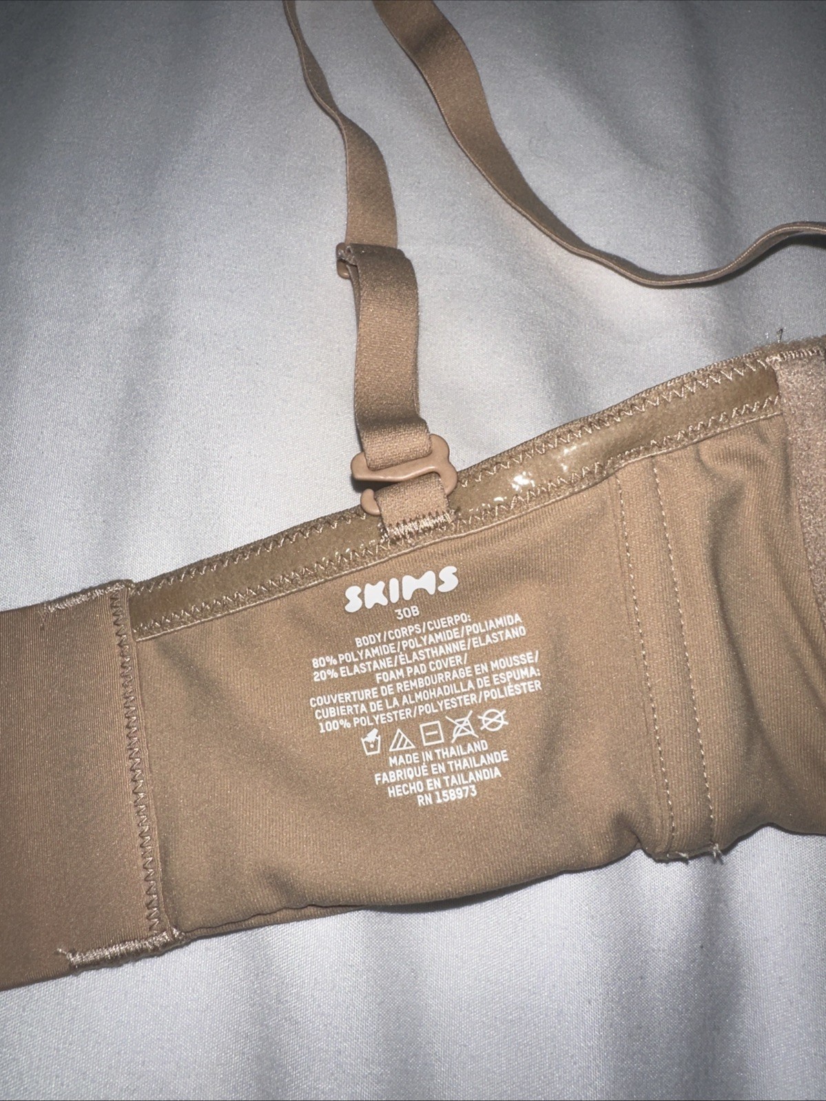 The NWOT SKIMS Push Up Bra in size 30B is a classic beige bra with underwired support and a hook & eye closure. Made of polyamide blended fabric, this bra is designed to provide a push up effect for a flattering fit. Hand wash only, this opaque bra from the Skims brand is perfect for everyday wear, offering both comfort and style for women looking for a solid and dependable undergarment.