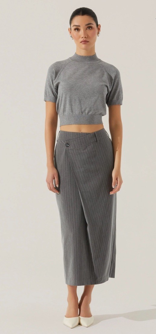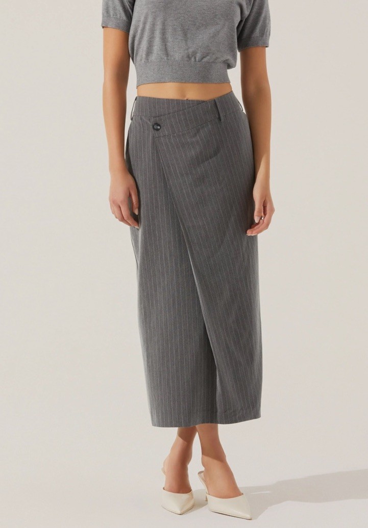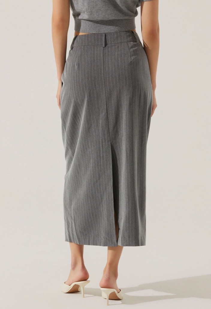 The NWT Astr The Label Pinstripe Asymmetrical Waist Skirt in size L is a stylish and versatile addition to any woman's wardrobe. This long, straight and pencil style skirt in a sleek gray color features an asymmetric design, adding a modern and unique touch to the classic silhouette. Perfect for a night out or a more formal occasion, this skirt from ASTR The Label is sure to make a statement and elevate any outfit.