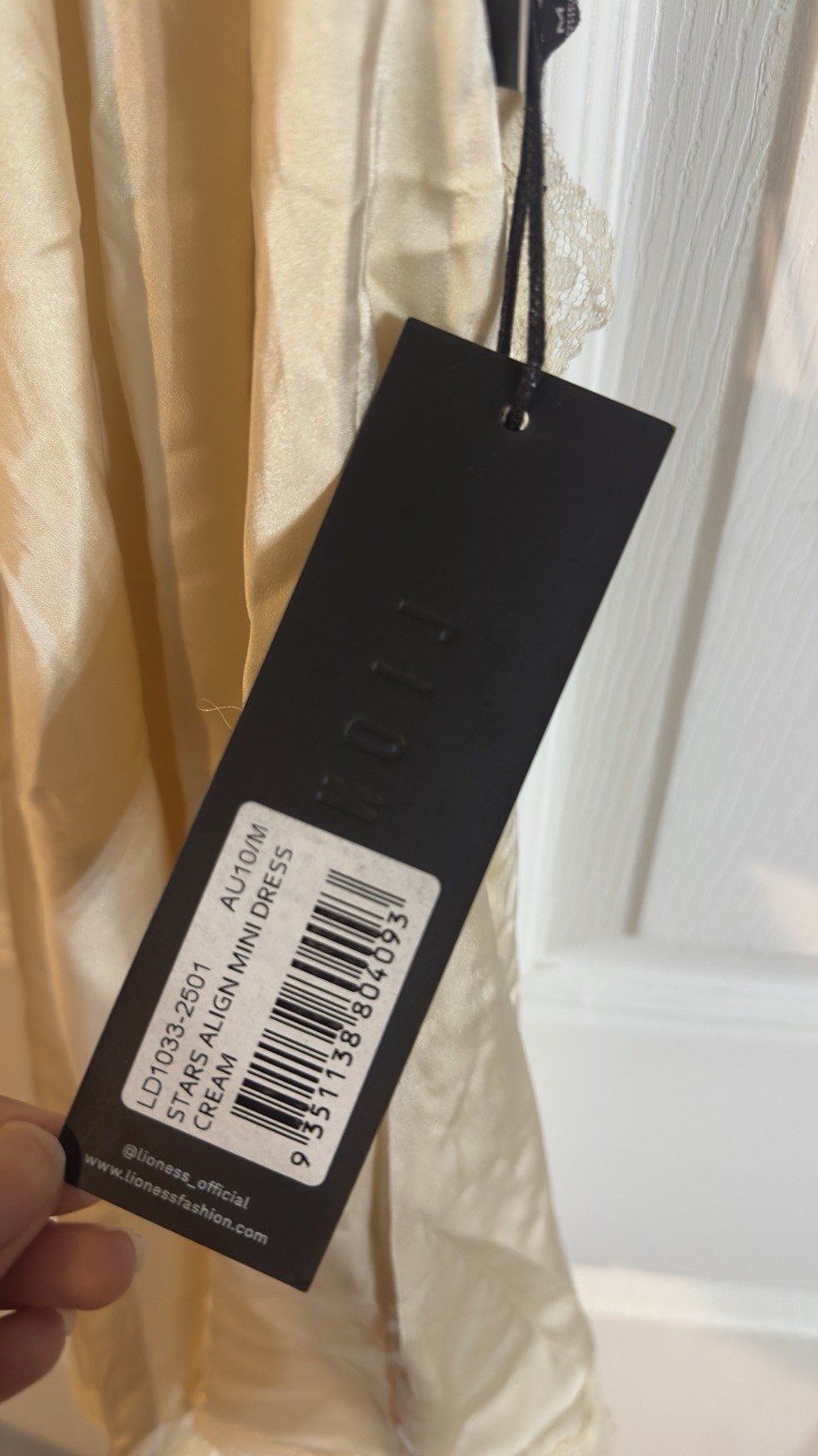 The NWT Lioness Star Align Mini Dress in Cream is a stylish and trendy option for women looking for a short dress with a touch of elegance. The ivory color and star theme add a touch of whimsy to the outfit, making it perfect for a special occasion or a night out. This mini dress is designed for regular fit and comes in size M, catering to women who want a flattering and comfortable silhouette. The brand, Lioness, is known for its high-quality and fashionable pieces, making this dress a great addition to any wardrobe.