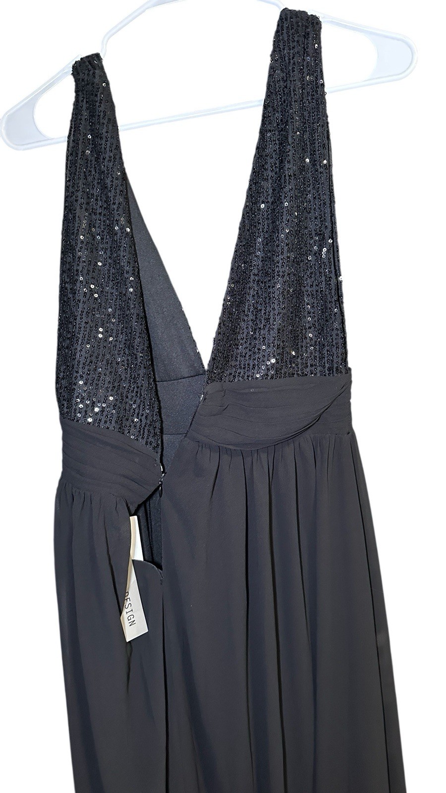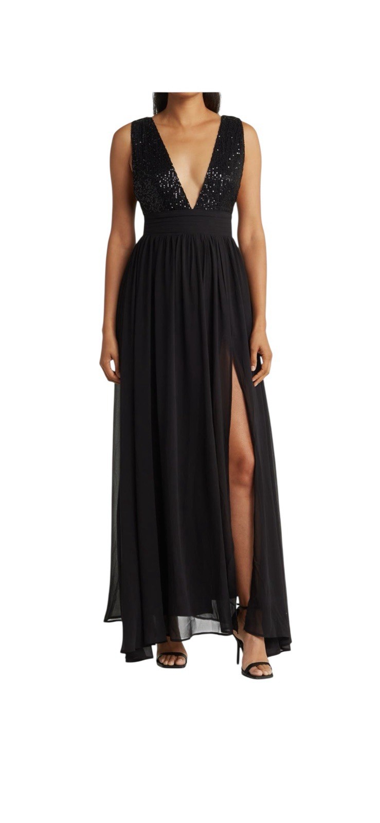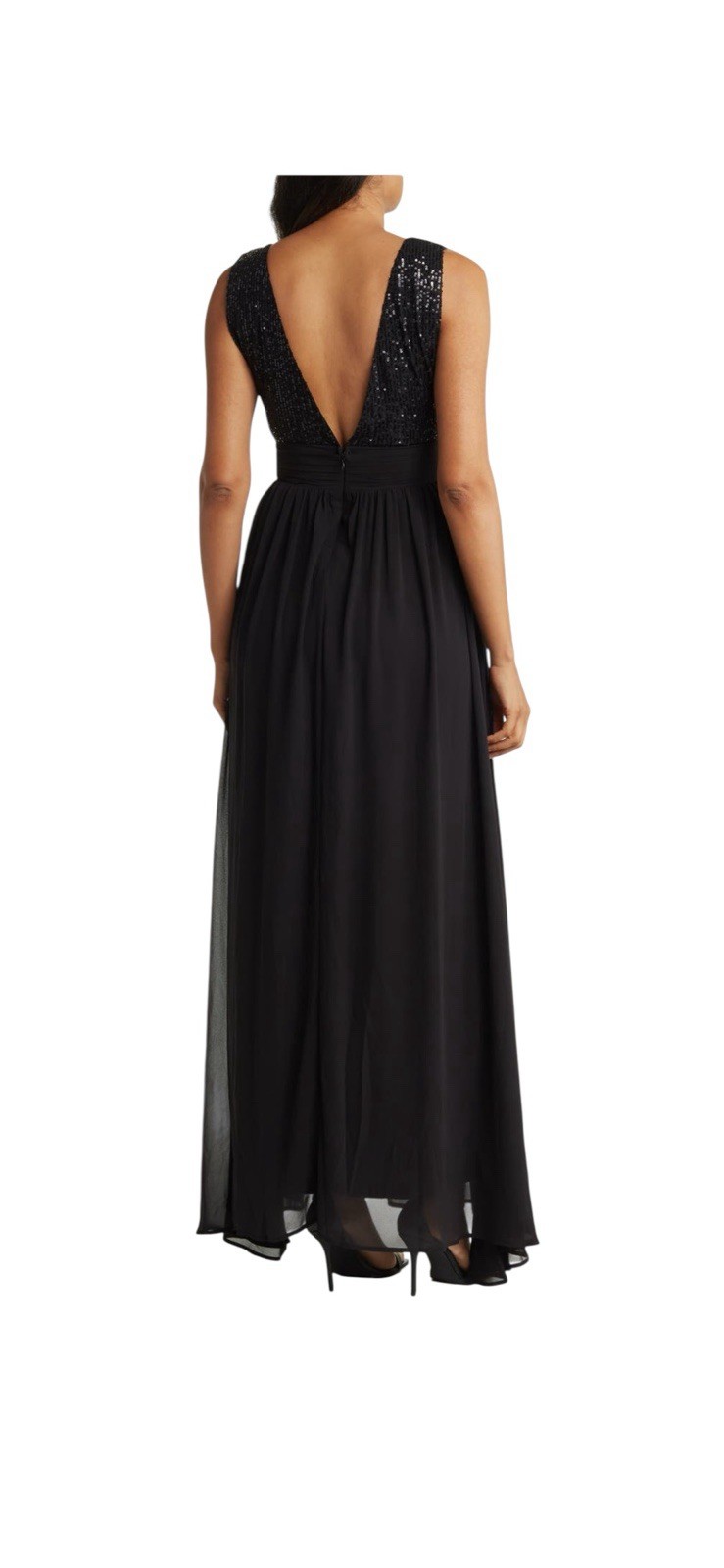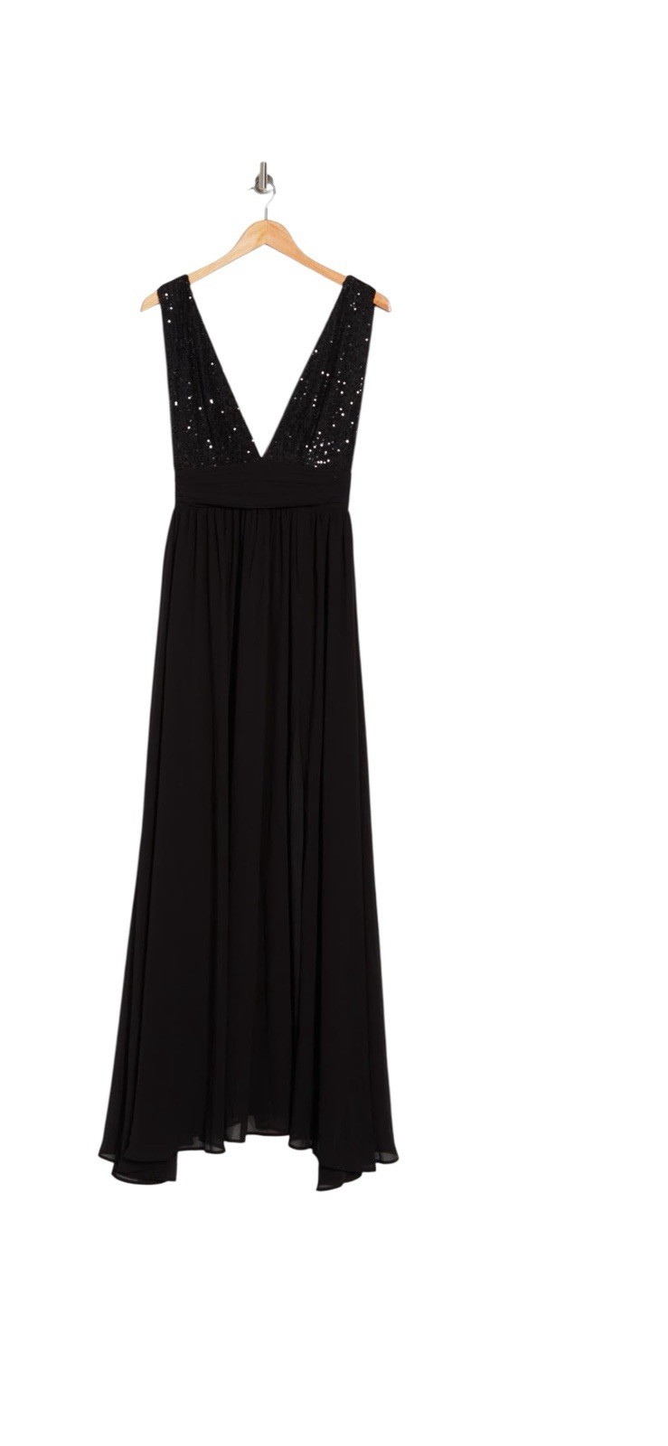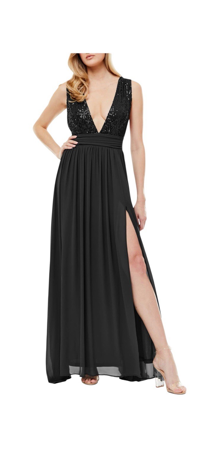 Sparkling sequins bring dazzling allure to a plunging v-neck maxi dress that is styled with a swishy skirt.