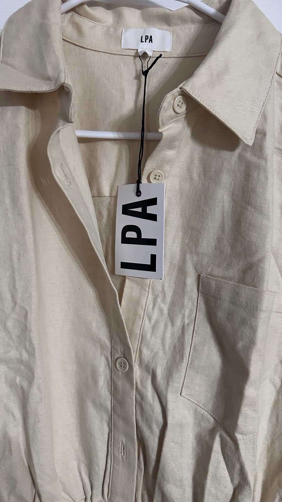 The NWT LPA Karolina Romper in Oatmeal is a stylish one-piece outfit designed for women. With a beige color and a size small, this romper offers a versatile and trendy option for everyday wear. The LPA brand is known for its quality and attention to detail, making this romper a chic addition to any wardrobe.