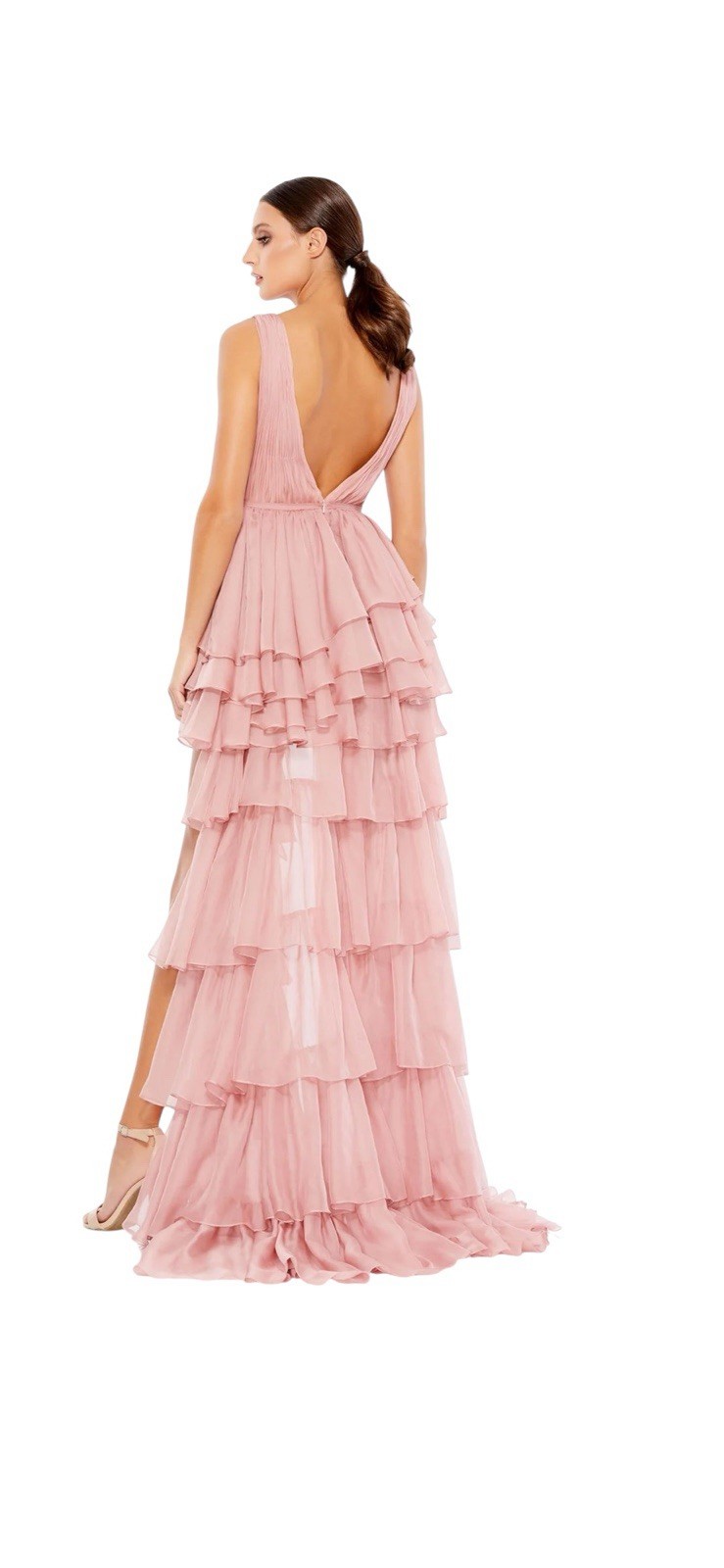 A gorgeous pink high low gown with dramatic tiered ruffled layers and a daring v-back. Perfect for evening events, formal occasions, or special celebrations, embrace modern elegance in this stunning gown.