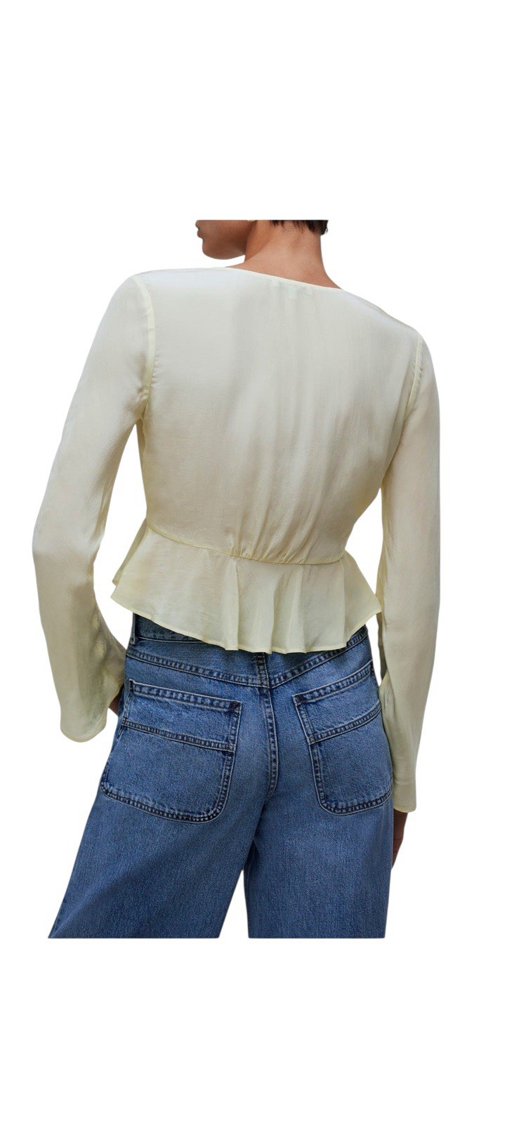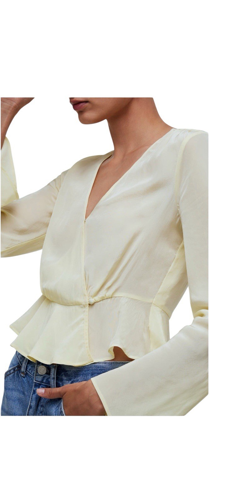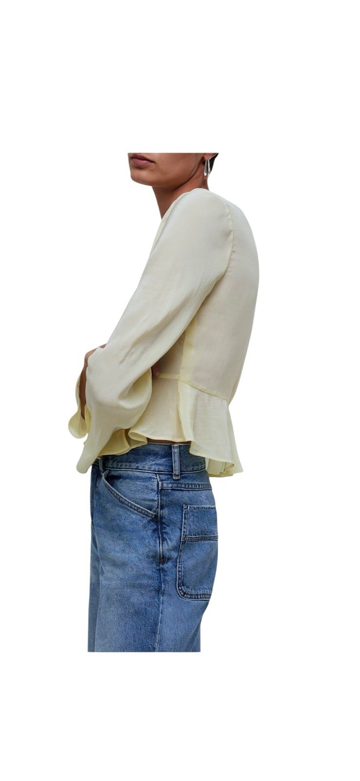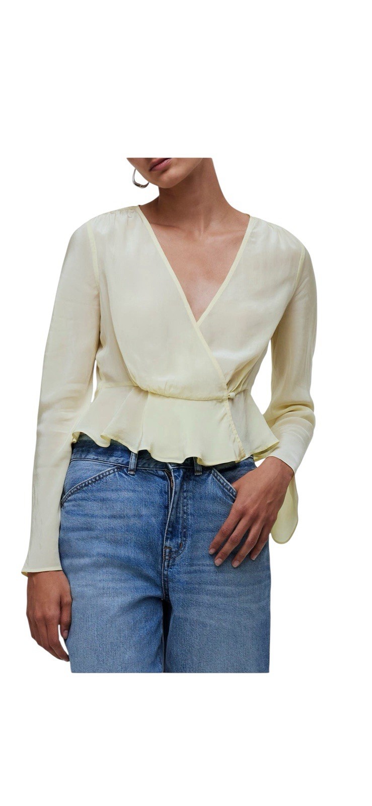 Perfectly drapey in sustainably made crêpe de Chine, this true wrap top has flowy bell sleeves and a romantic ruffled hem.