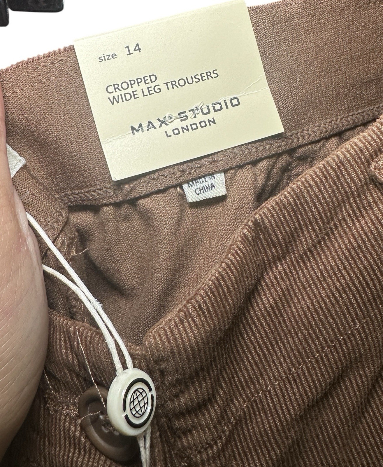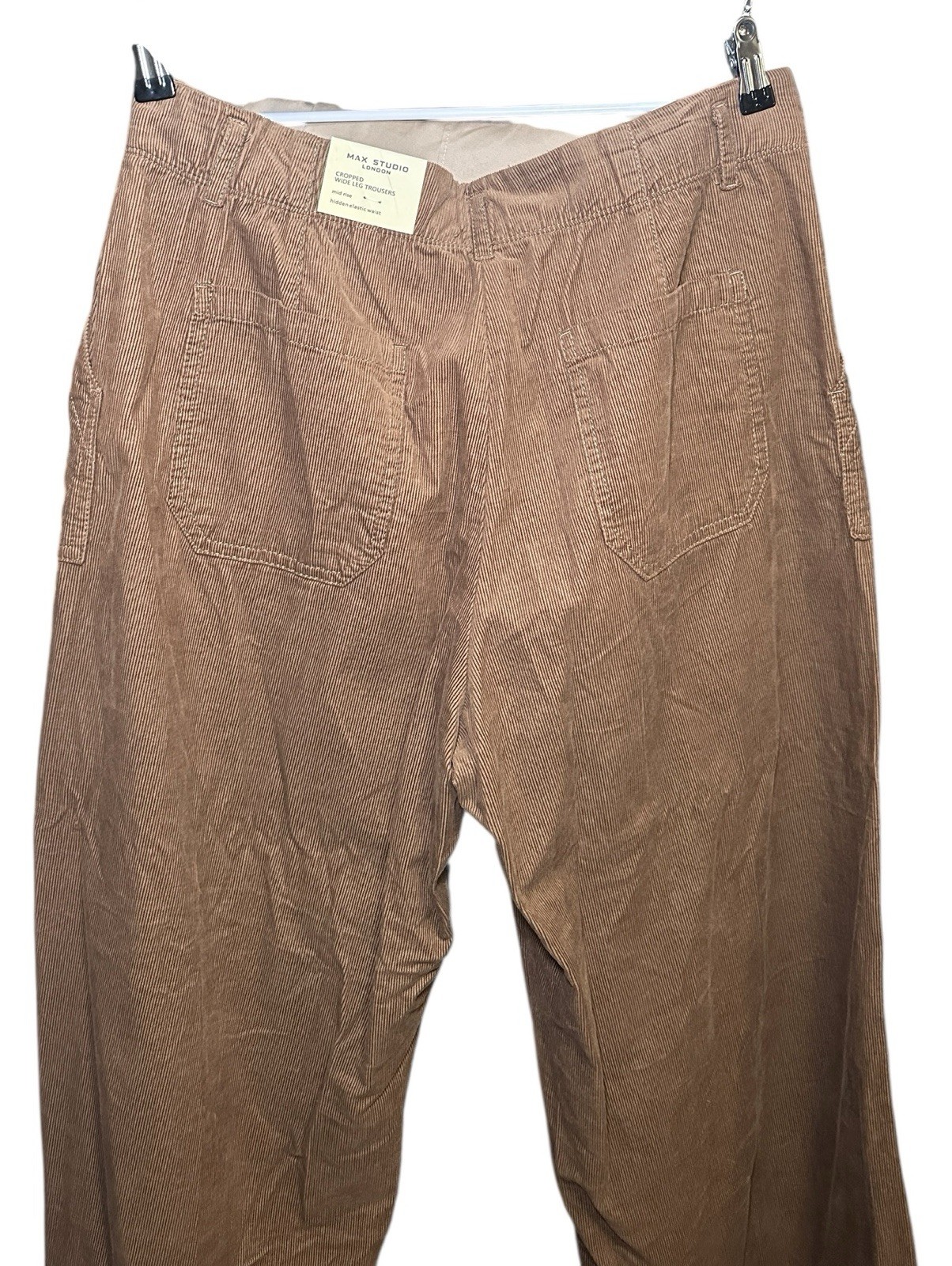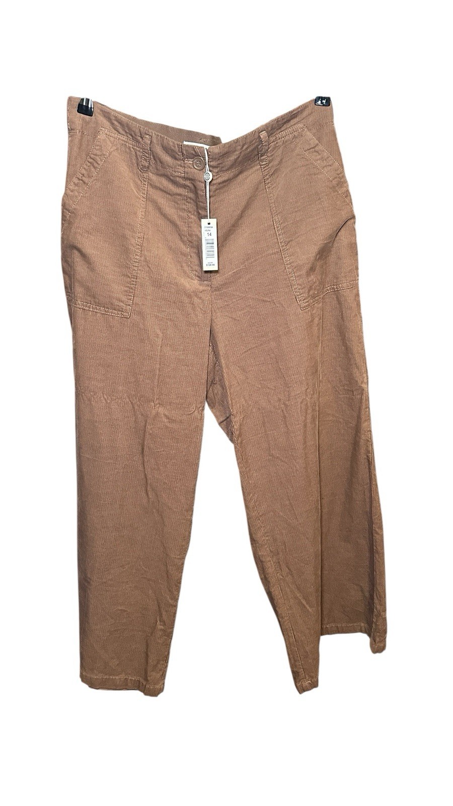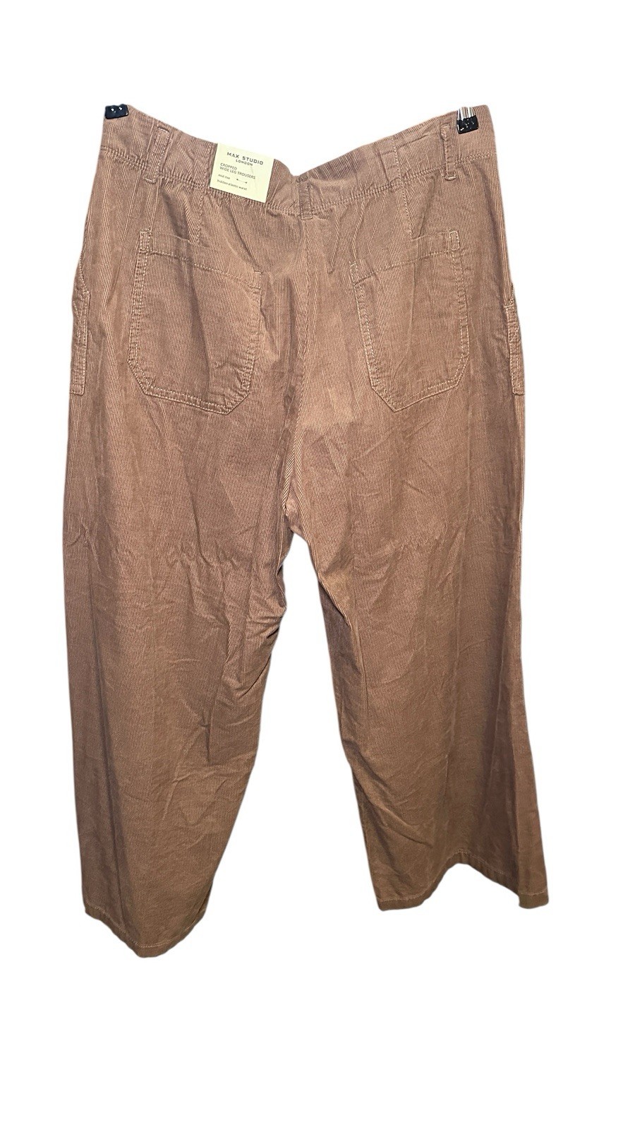 The NWT Max Studio London wide leg trouser is a stylish and comfortable pant designed for casual occasions. Made from polyester fabric in a rayon weave, this brown trouser features a high rise and a flat front waist. The wide-leg silhouette is perfect for the summer, fall, and spring seasons, and the pull-on closure makes it easy to wear. With a size 14 waist and a regular size type, this trouser is a versatile addition to any woman’s wardrobe, adding a touch of London-inspired style to her outfit.