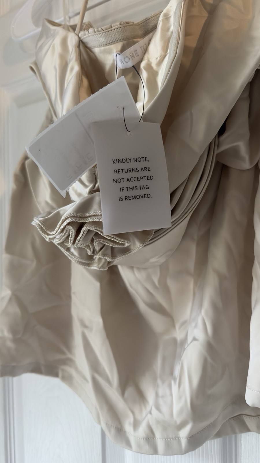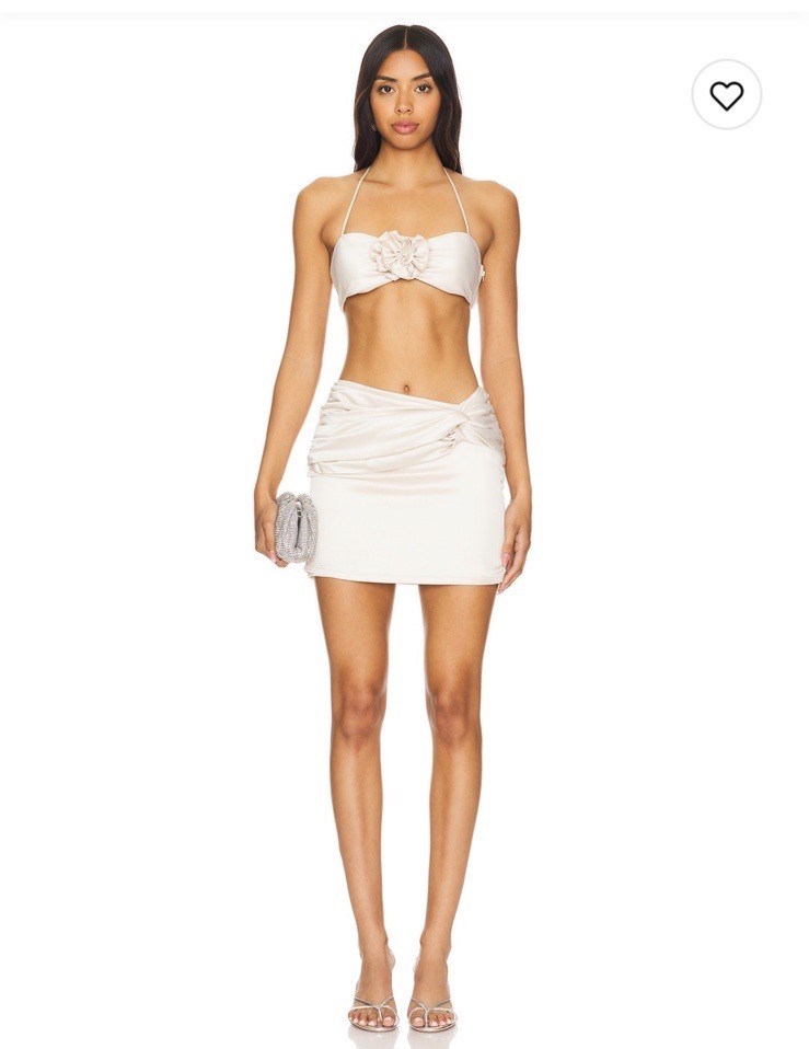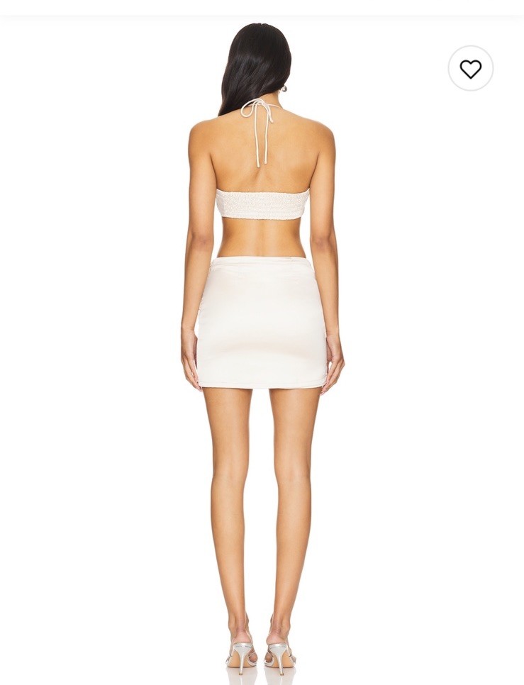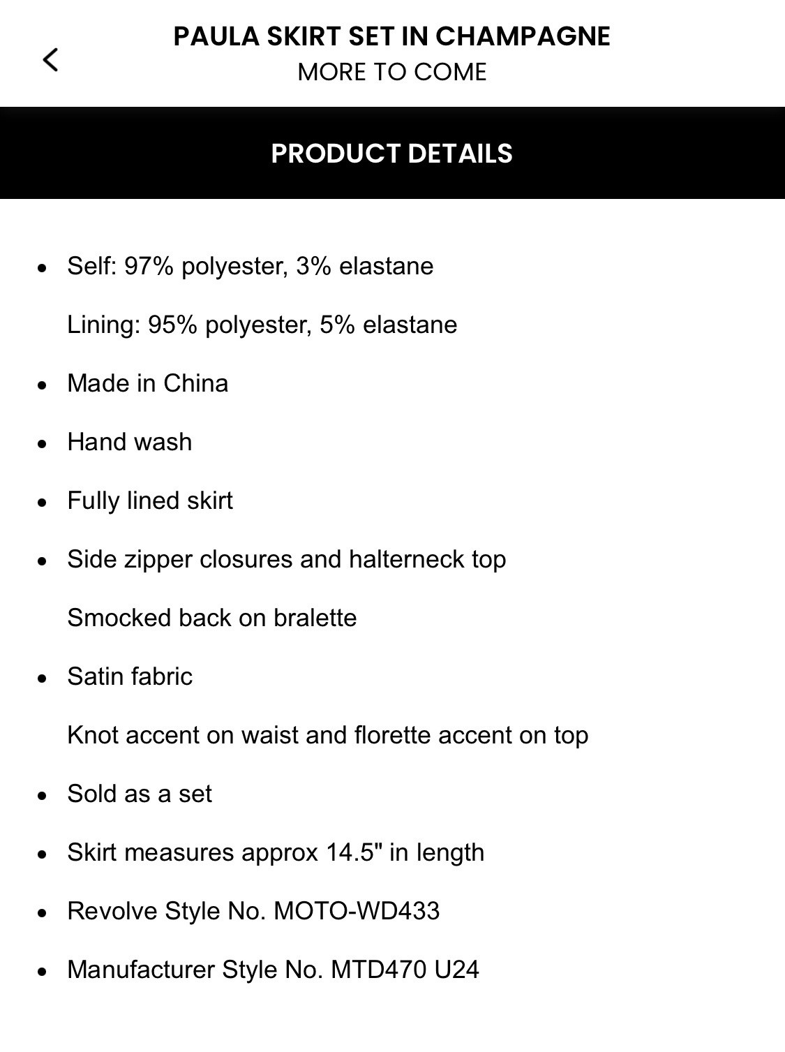 The NWT More To Come Paula Skirt Set in size L is a stylish and trendy outfit for women. This champagne-colored skirt set includes a mini skirt with a short length, perfect for those looking for a fashionable and comfortable option. The set is designed with a regular fit and is ideal for casual or dressy occasions, making it a versatile addition to any wardrobe.