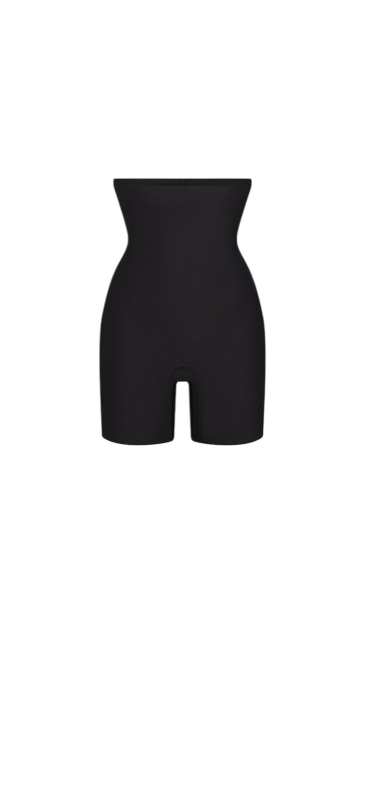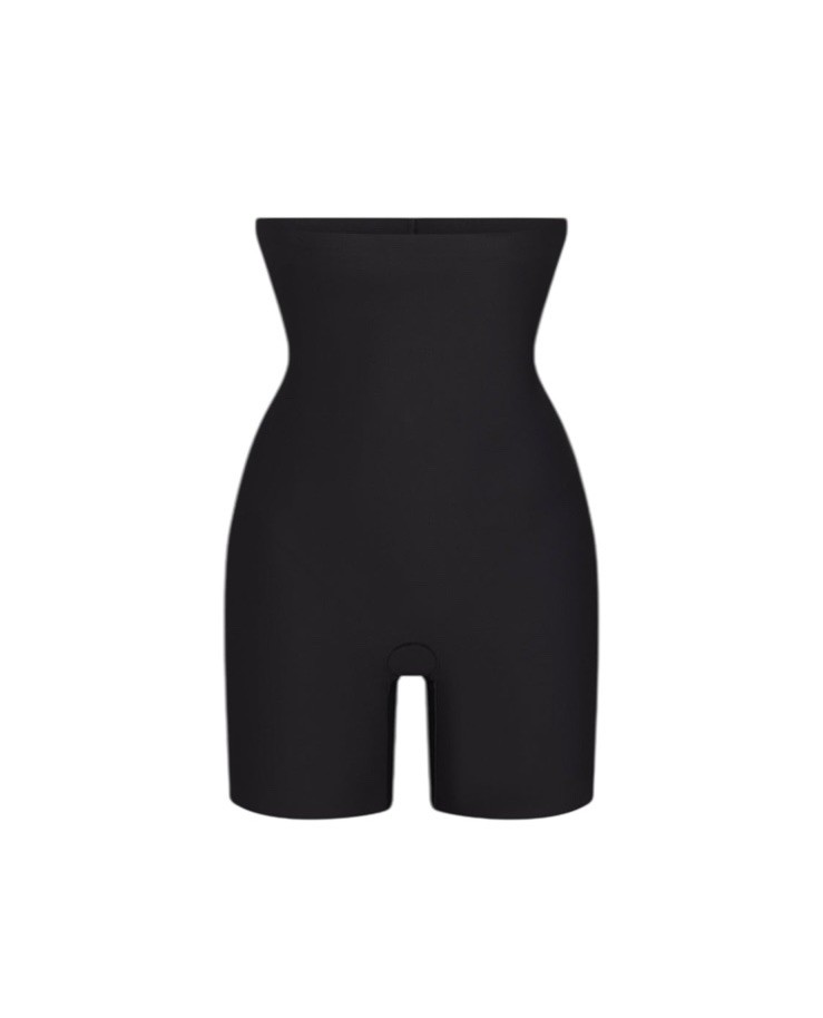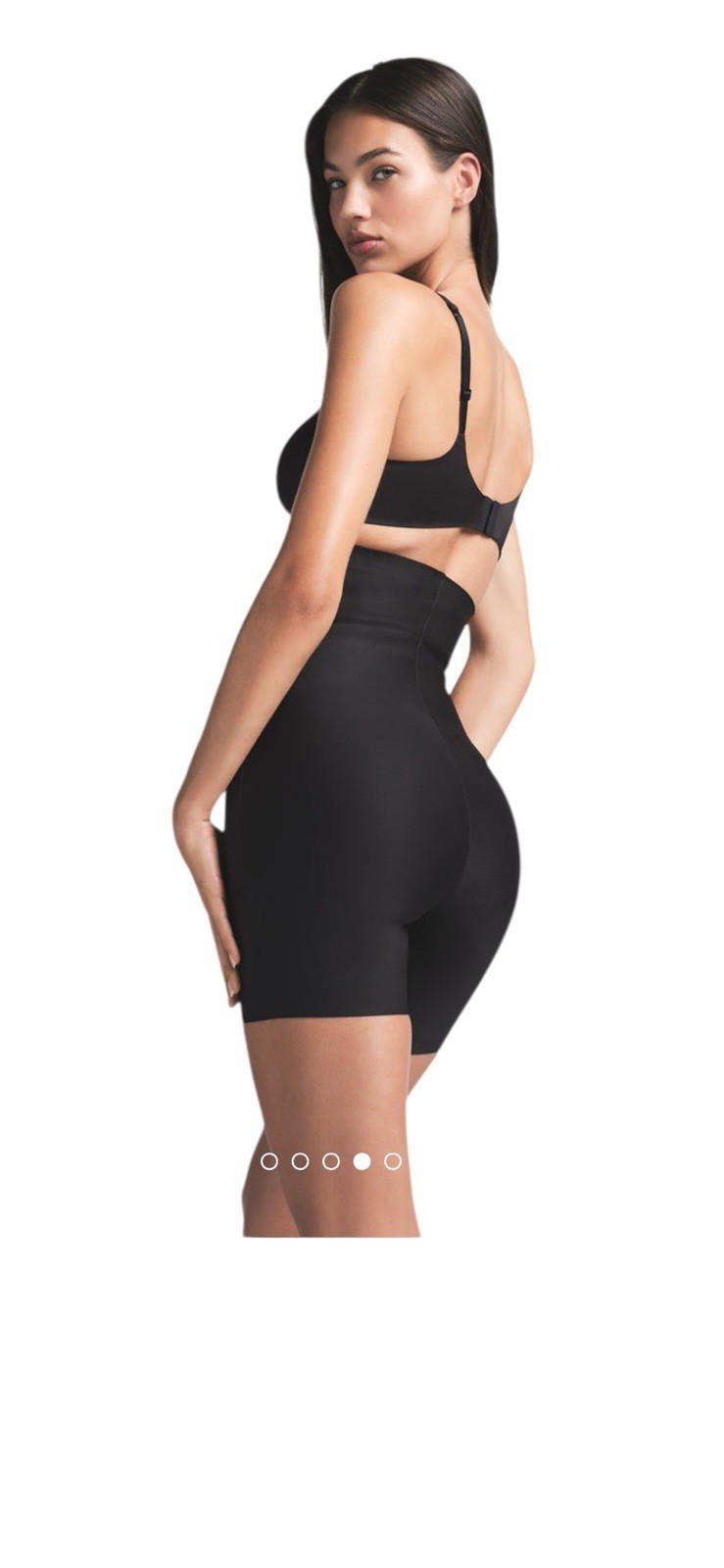 High waisted, Interior bonded elastic along waist, Targeted core compression, Hits at mid thigh, Open gusset, Raw cut leg opening