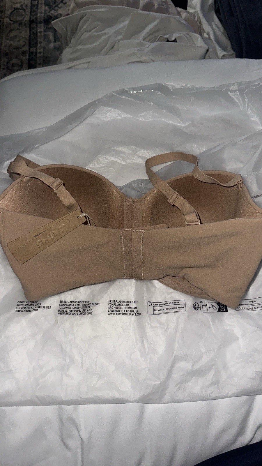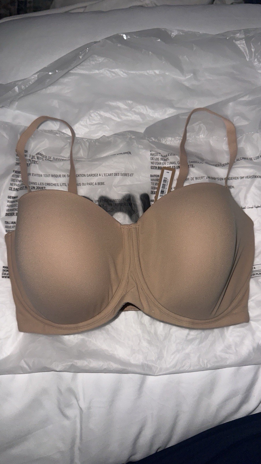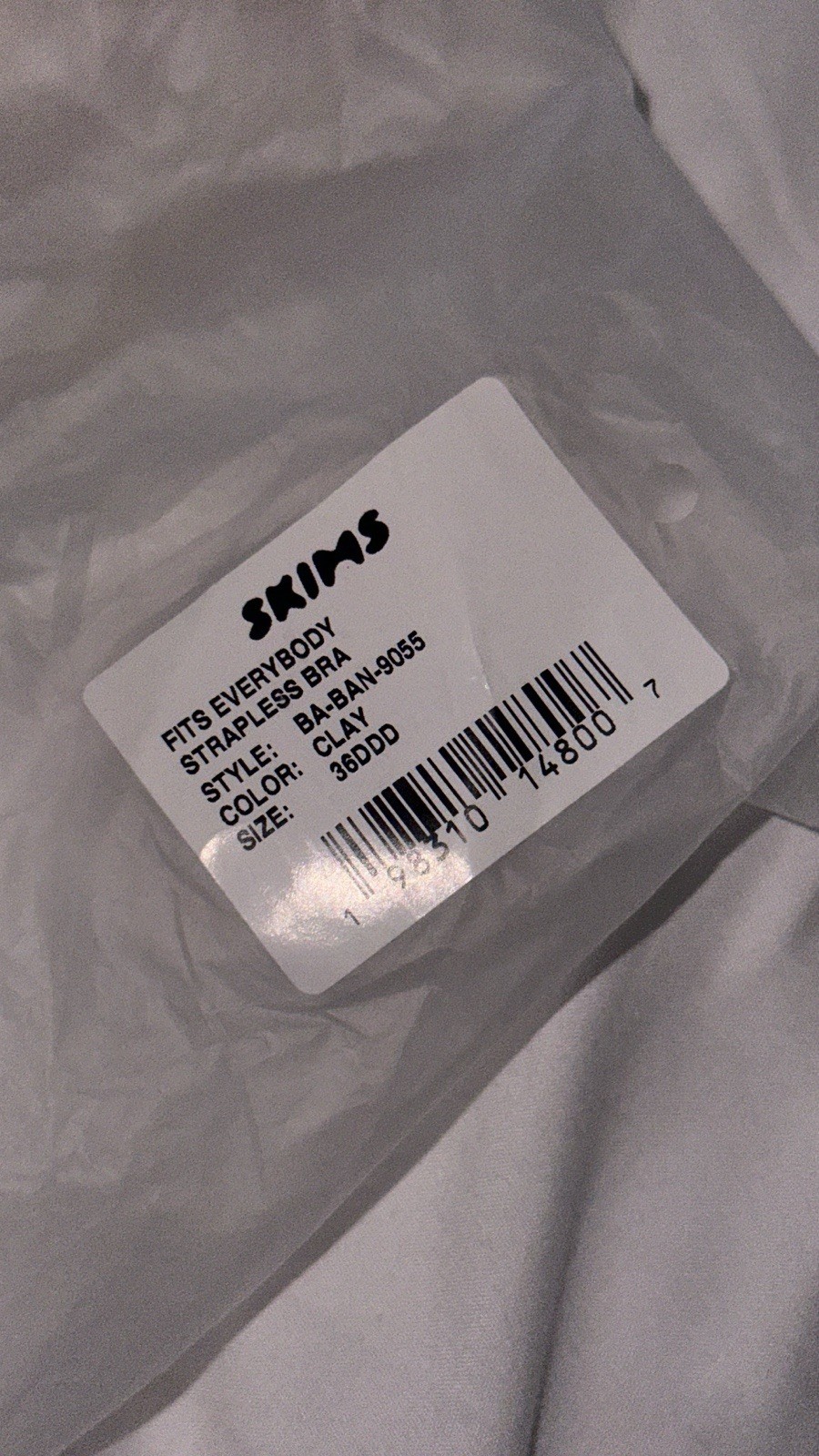 The NWT SKIMS Fits Everybody Strapless Bra in size 36DDD is a stylish and supportive undergarment designed for women. Made from polyamide blended fabric, this beige bra features a solid pattern and a wireless underwire type for added comfort. With a fitted style and opaque fabric, this strapless bra by Skims is perfect for everyday wear and offers a flattering silhouette. Ideal for those looking for a comfortable and versatile option in their lingerie collection.