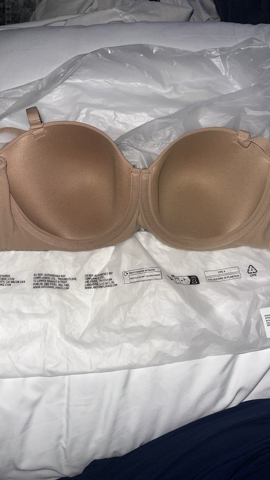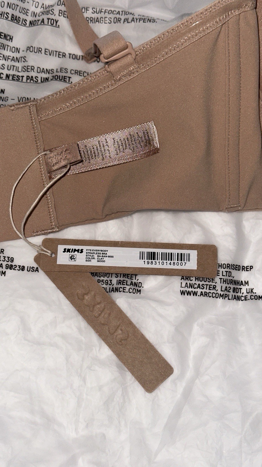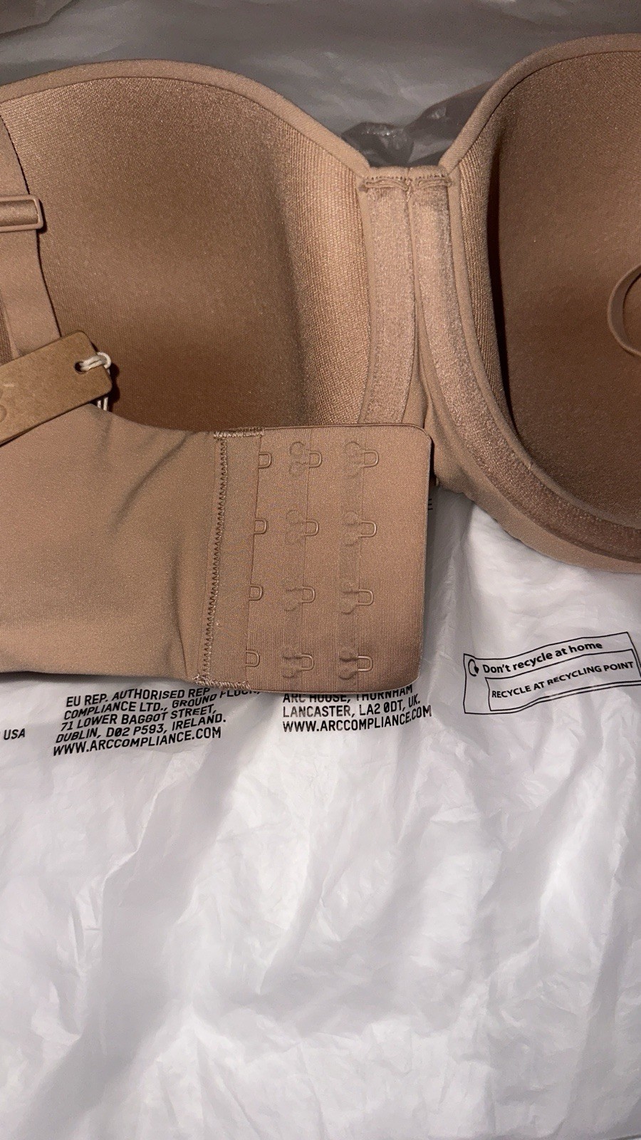 The NWT SKIMS Fits Everybody Strapless Bra in size 36DDD is a stylish and supportive undergarment designed for women. Made from polyamide blended fabric, this beige bra features a solid pattern and a wireless underwire type for added comfort. With a fitted style and opaque fabric, this strapless bra by Skims is perfect for everyday wear and offers a flattering silhouette. Ideal for those looking for a comfortable and versatile option in their lingerie collection.