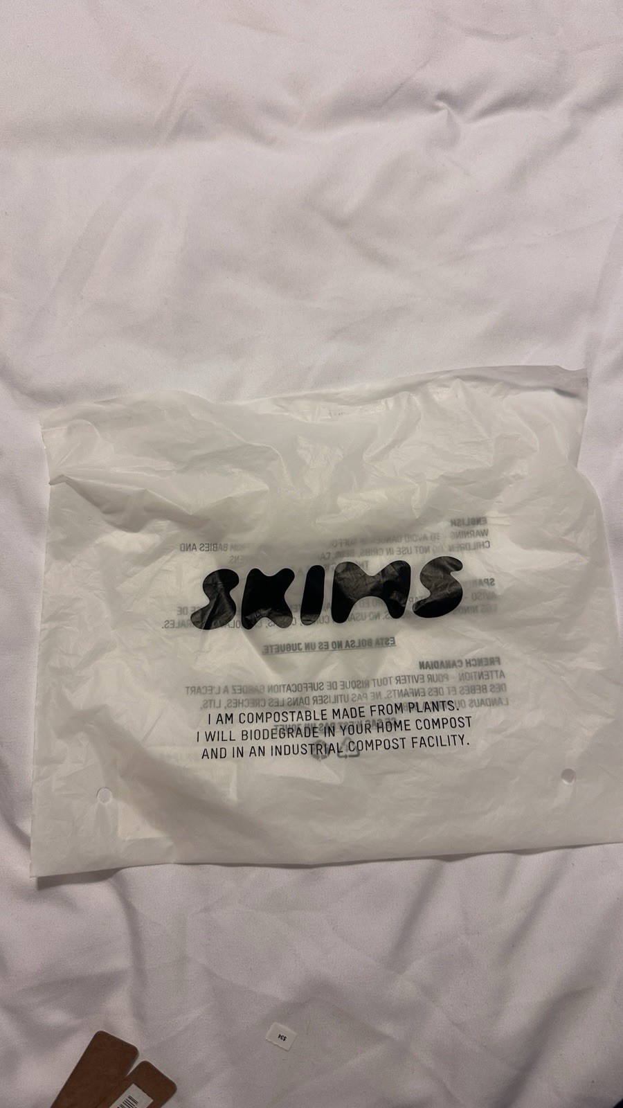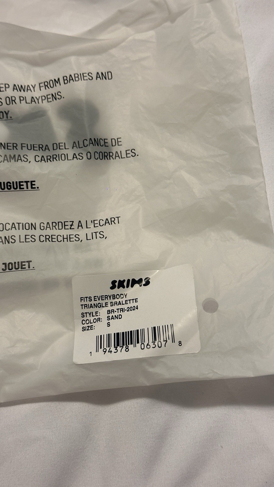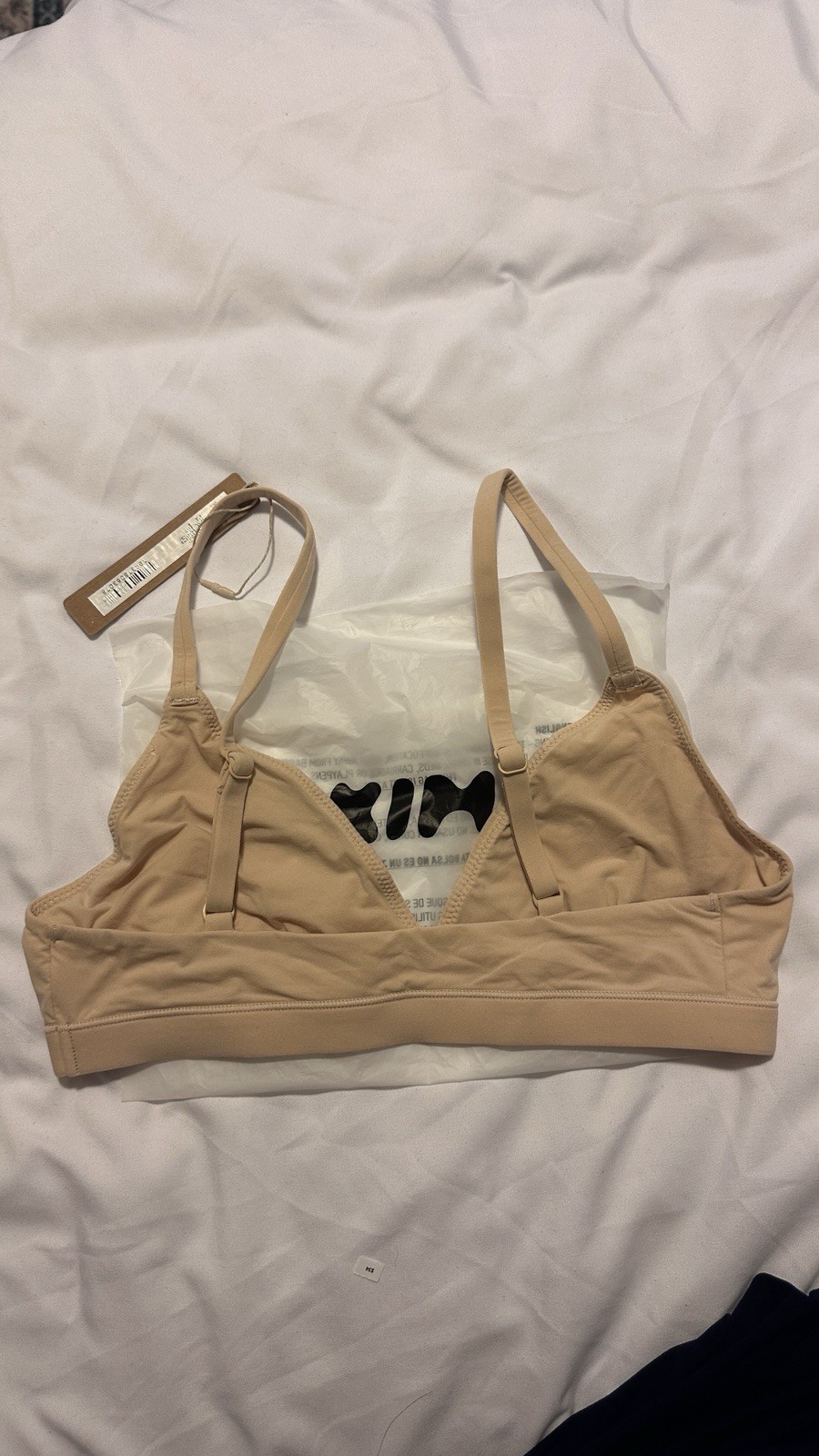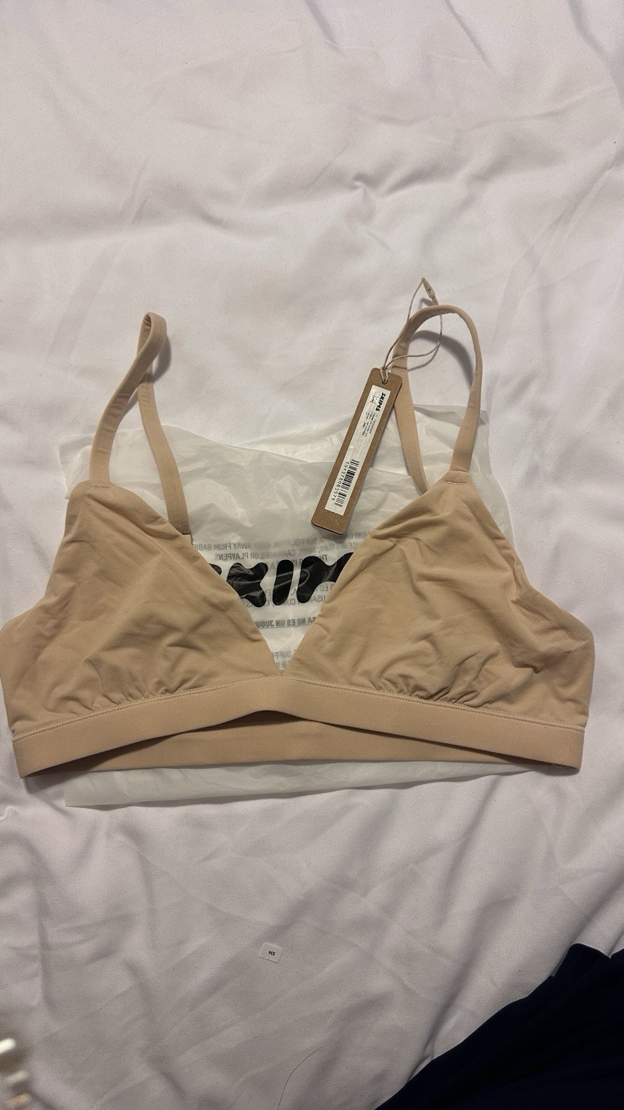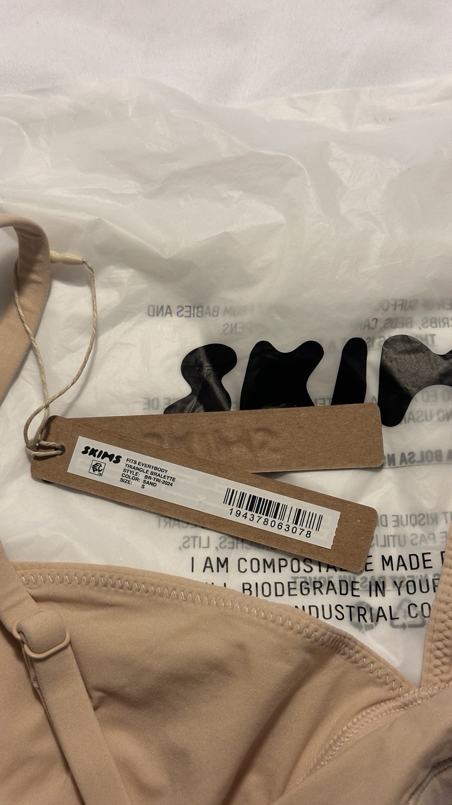 The NWT SKIMS Fits Everybody Triangle Bralette is a stylish and comfortable bra designed for women. Made from polyamide with a blended fabric type, this bralette features a solid beige color and a fitted style. With a wireless underwire type and bra strap strap type, this machine washable garment is perfect for everyday wear. The one size cup size and regular size type make it a versatile choice for women looking for a supportive yet fashionable bra option.