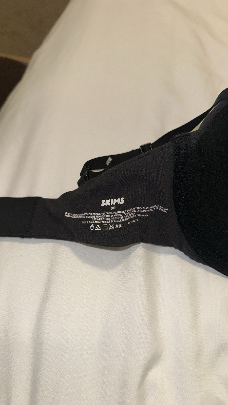 The NWT Skims Push Up Bra is a solid black underwired bra with bra strap closures. Made of polyamide blended fabric, it features push up accents and should be hand washed for care. This size 30D bra is designed for women and offers a push up style, ideal for those looking to enhance and support. The Skims brand is known for its high-quality and stylish intimates, making this bra a great addition to any lingerie collection.