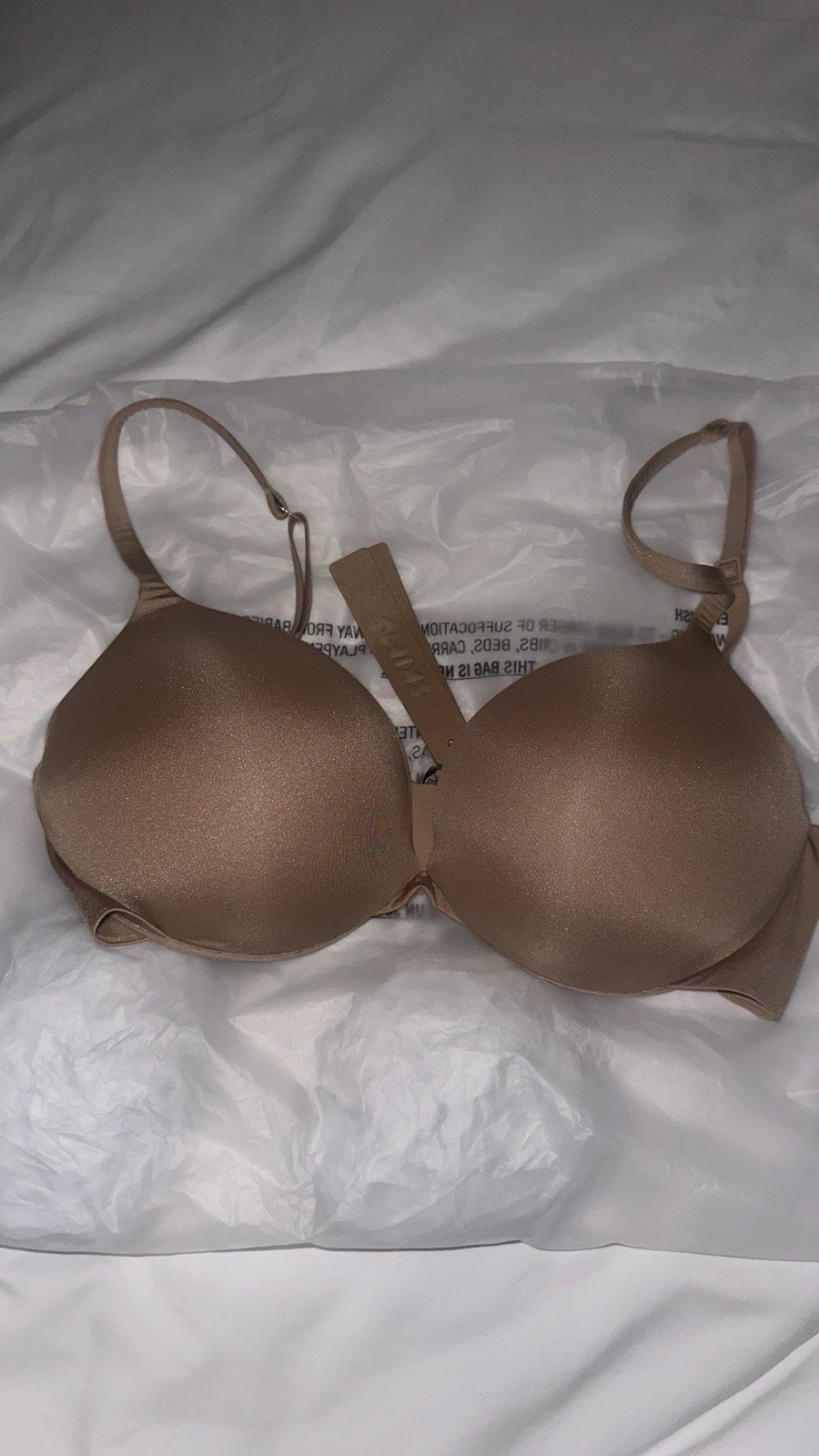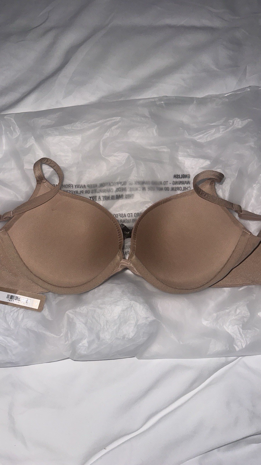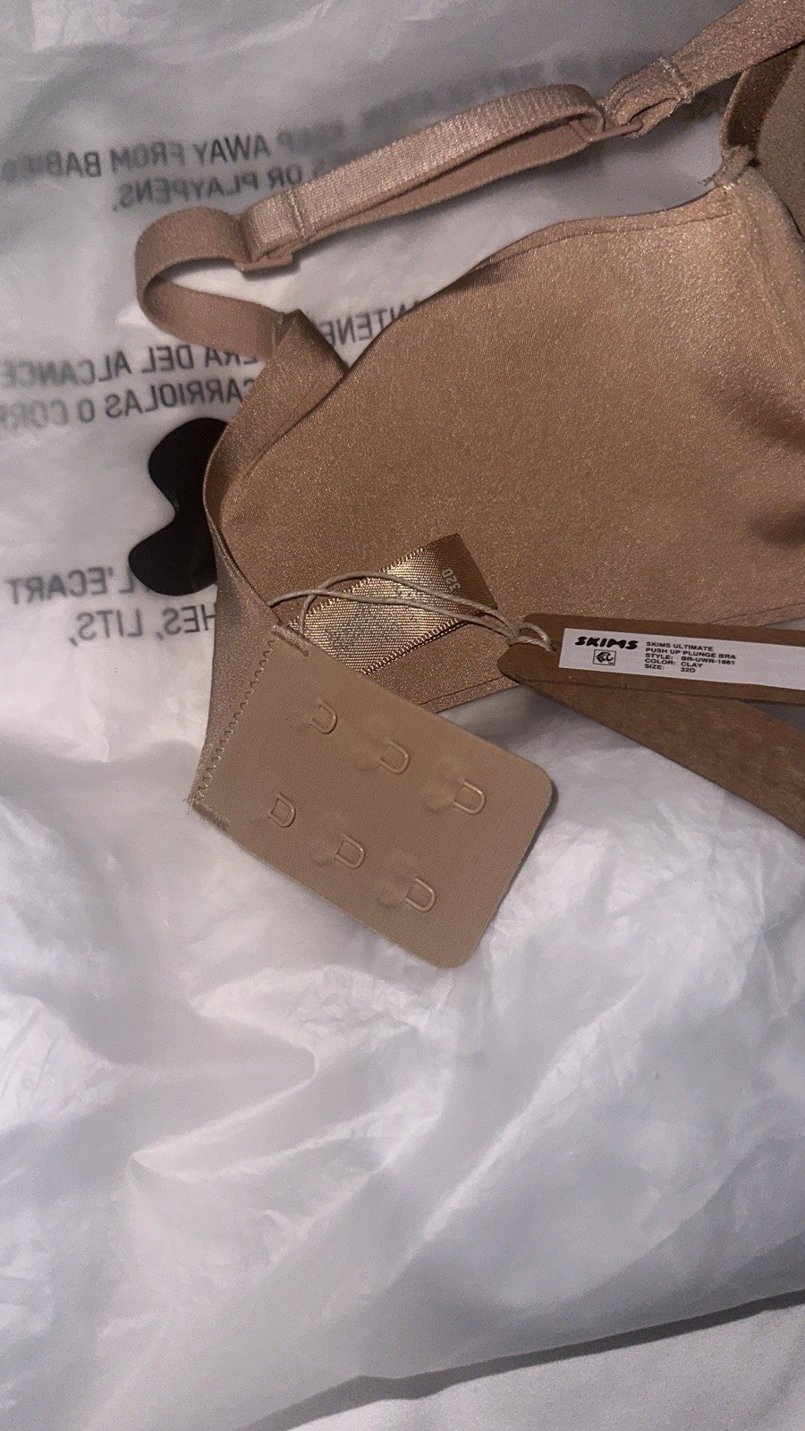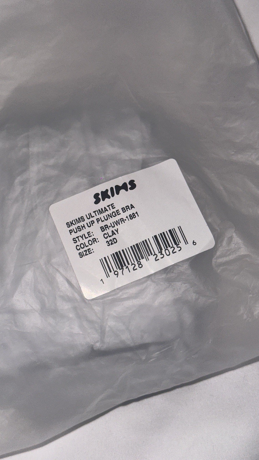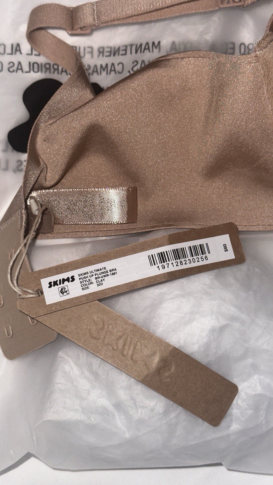 The NWT Skims Ultimate Push Up Plunge Bra is a stylish and comfortable undergarment designed for women. Made of polyamide, this bra features a solid beige color, underwired support, and a plunge accent. It has bra strap closures and is designed for a regular fit in size 32D. The push up style and opaque fabric make it a versatile and flattering choice for daily wear. Hand wash only to maintain its quality, this bra from the brand Skims is a great addition to any lingerie collection.