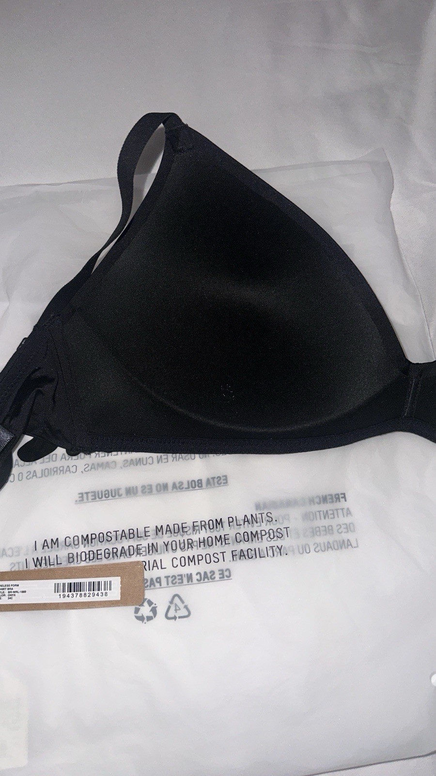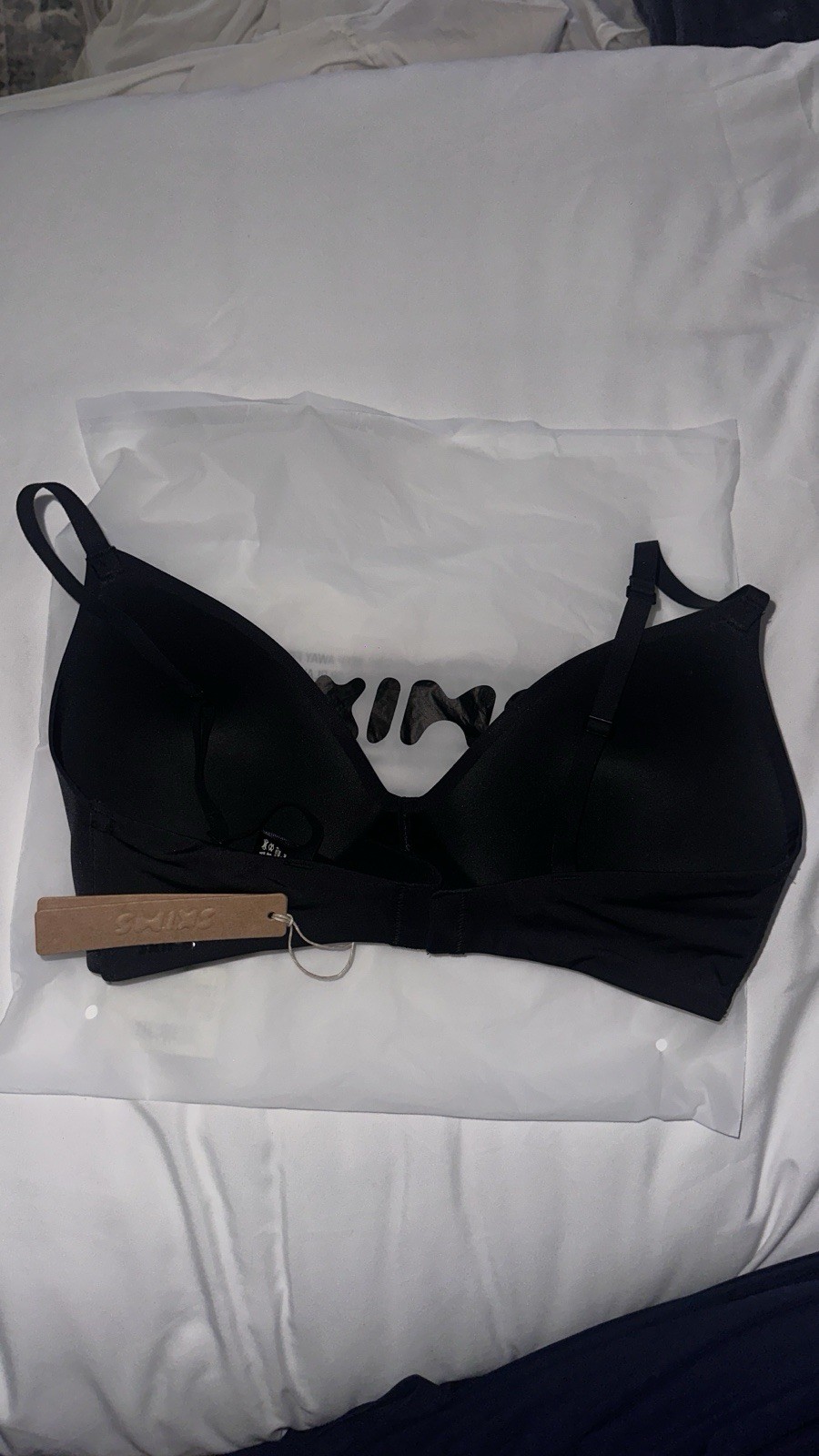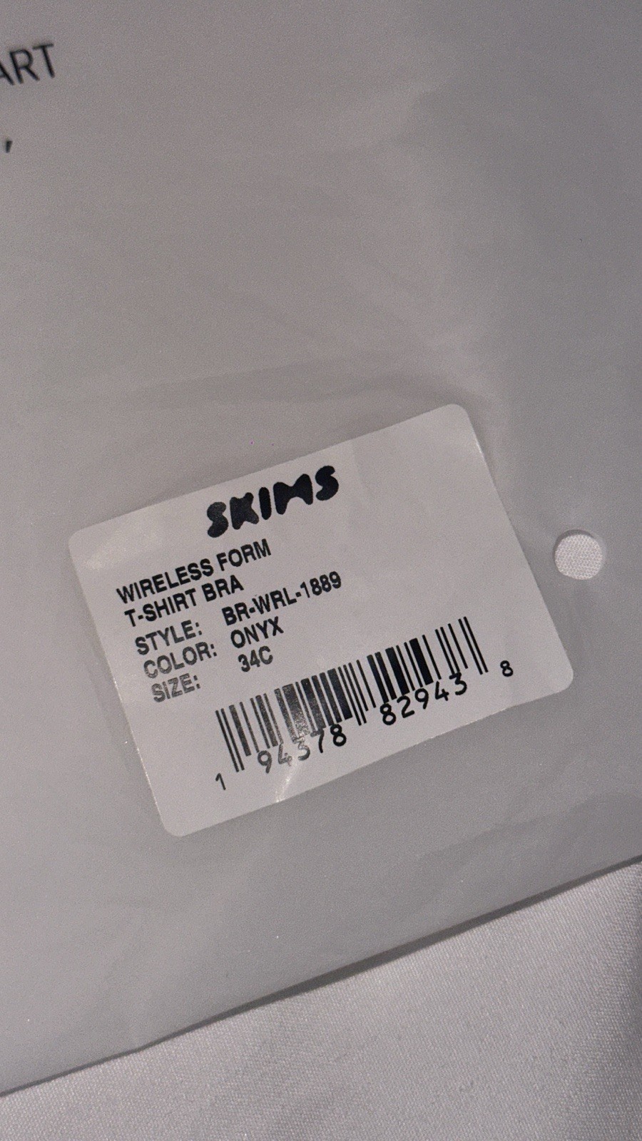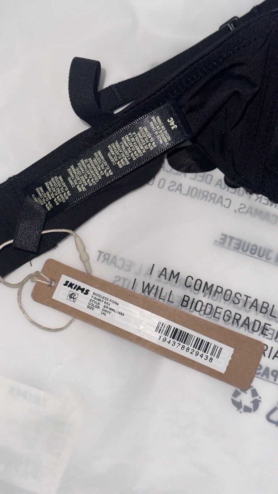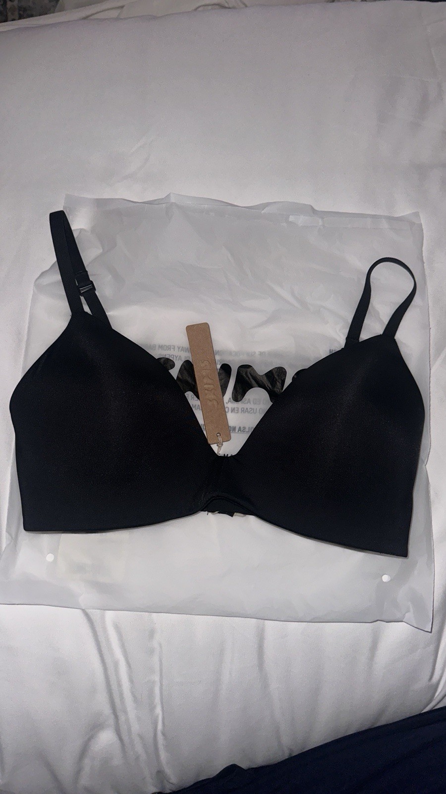 The NWT Skims Wireless Form T-Shirt Bra is a sleek and supportive undergarment designed for women. This black bra features a solid pattern, bra strap style, and a hook & eye closure for a secure fit. Made from a blend of polyamide fabric, this T-shirt bra offers adjustable straps and a wireless design for comfort. Perfect for everyday wear, this bra by Skims is a stylish and practical choice for any wardrobe.