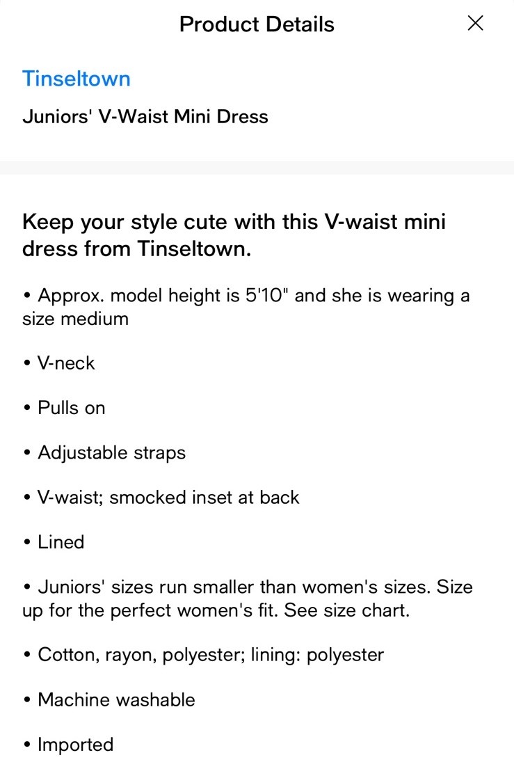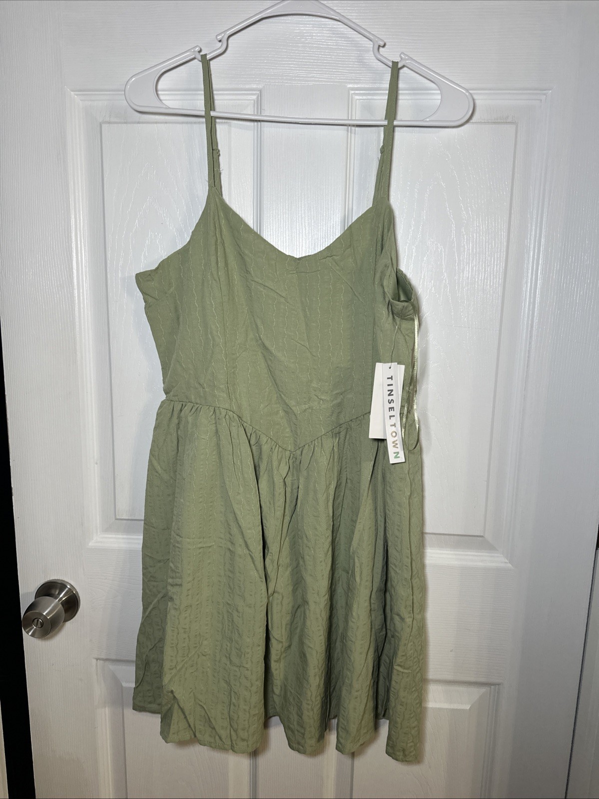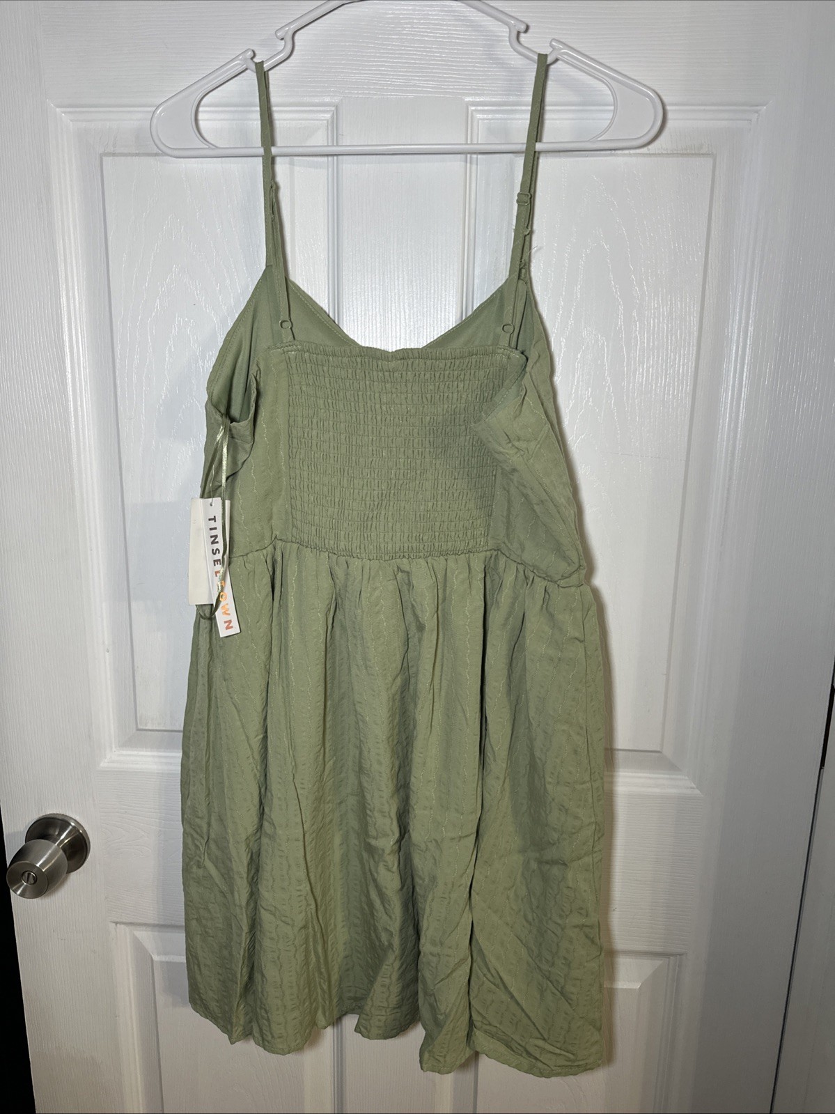 The NWT Tinseltown Junior V Waist Mini Dress in Size L is a stylish and trendy addition to any woman's wardrobe. This green short dress is designed specifically for juniors, featuring a flattering V waistline and a cute mini length. Perfect for a night out or special occasion, this dress from Tinseltown is sure to make a statement and turn heads wherever you go.
