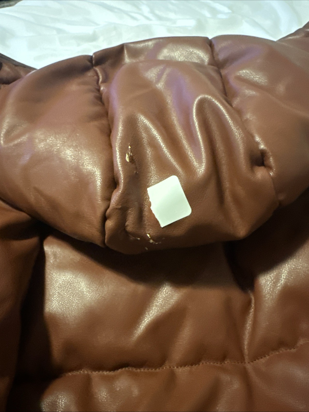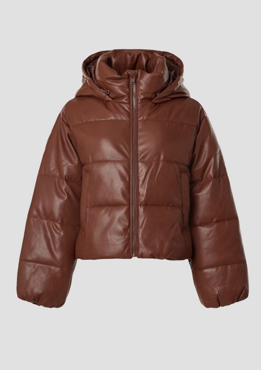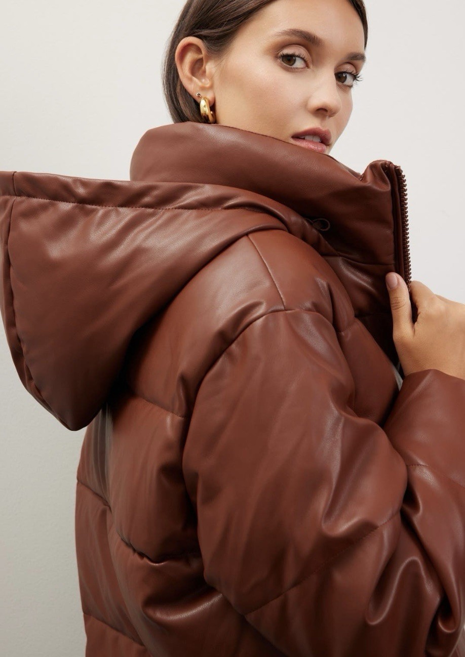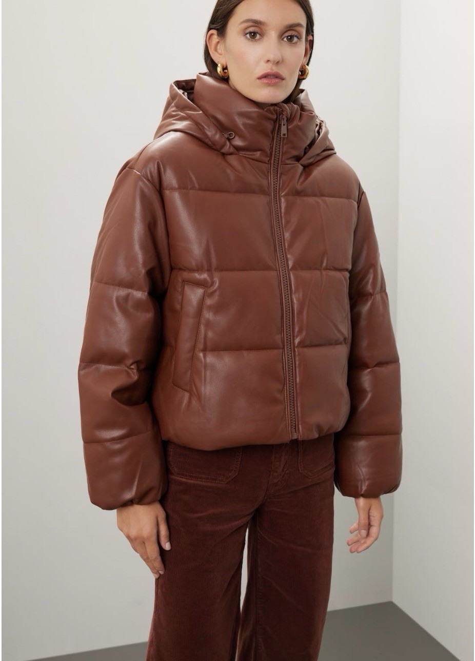The OOF Faux Leather Puffer Jacket in size 44 is a stylish and designer piece for women. Made from high-quality faux leather, this short jacket features a zip closure, hood, and a flattering puffer style. The brown color adds a versatile touch, making it a fashionable outerwear option for any casual or dressy occasion. With its trendy design and high-end construction, this jacket is sure to elevate any outfit.
