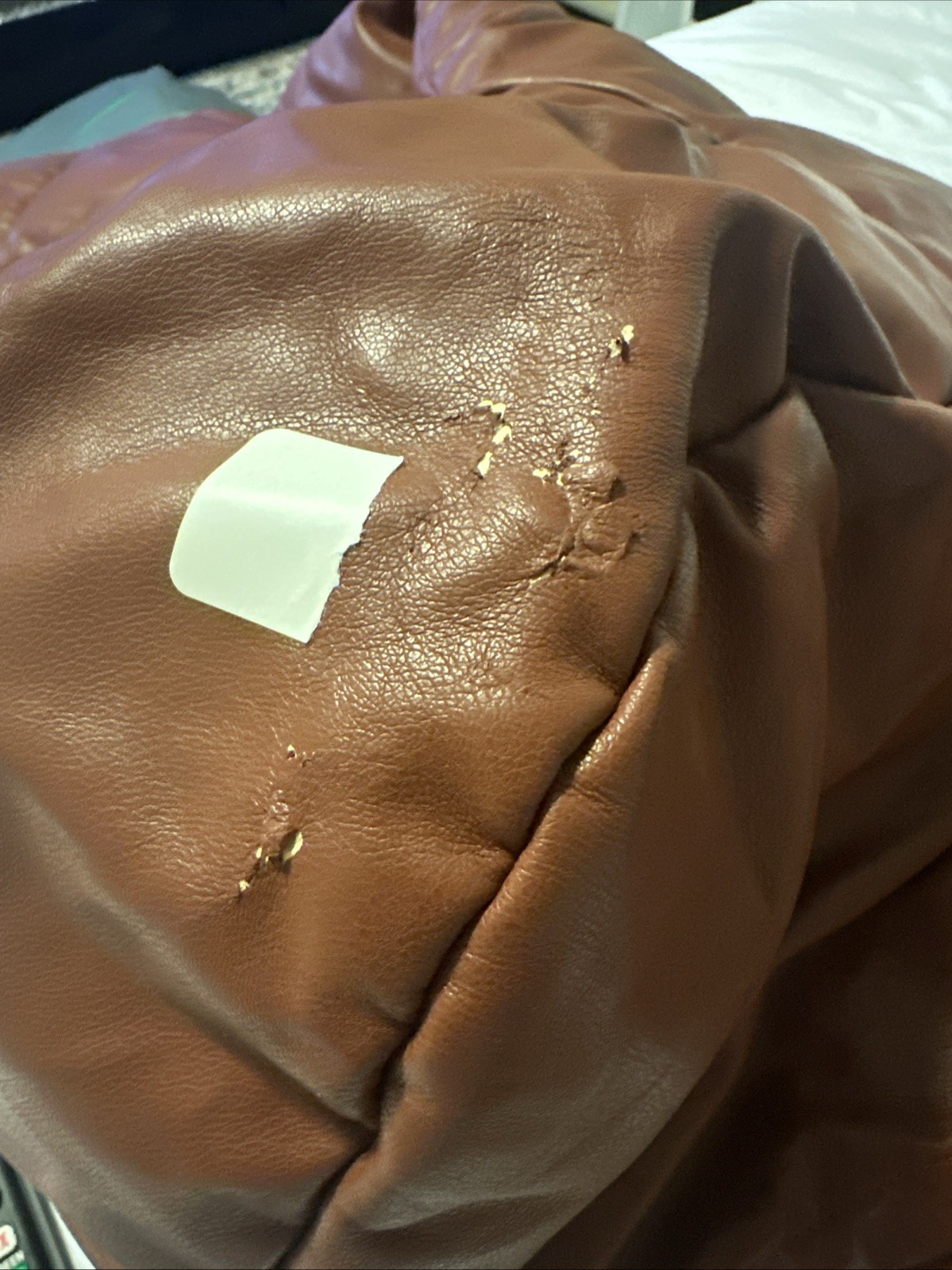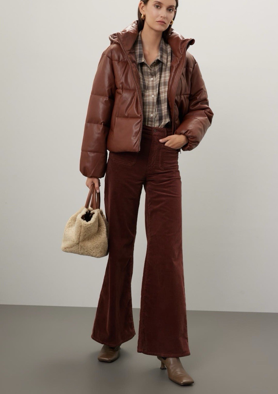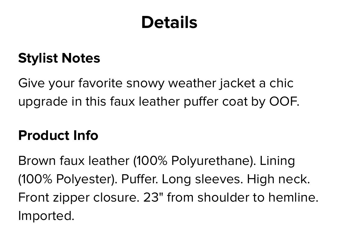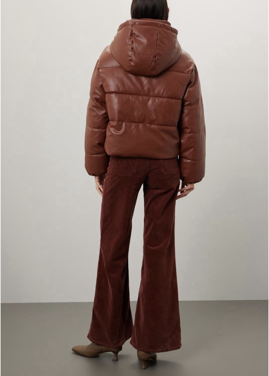 The OOF Faux Leather Puffer Jacket in size 44 is a stylish and designer piece for women. Made from high-quality faux leather, this short jacket features a zip closure, hood, and a flattering puffer style. The brown color adds a versatile touch, making it a fashionable outerwear option for any casual or dressy occasion. With its trendy design and high-end construction, this jacket is sure to elevate any outfit.