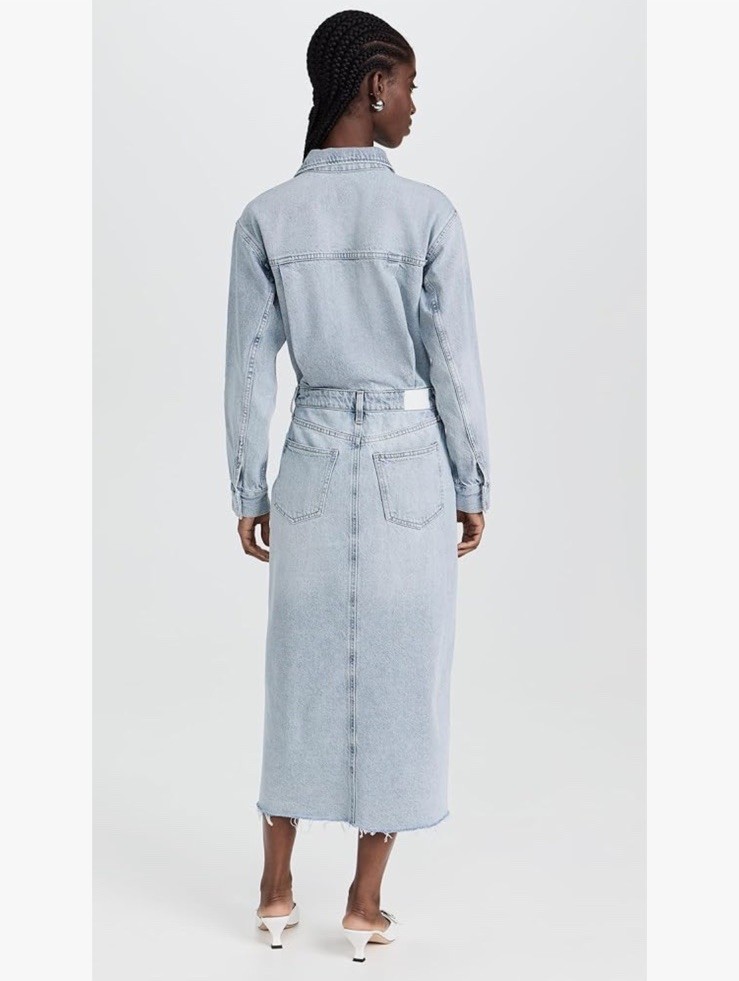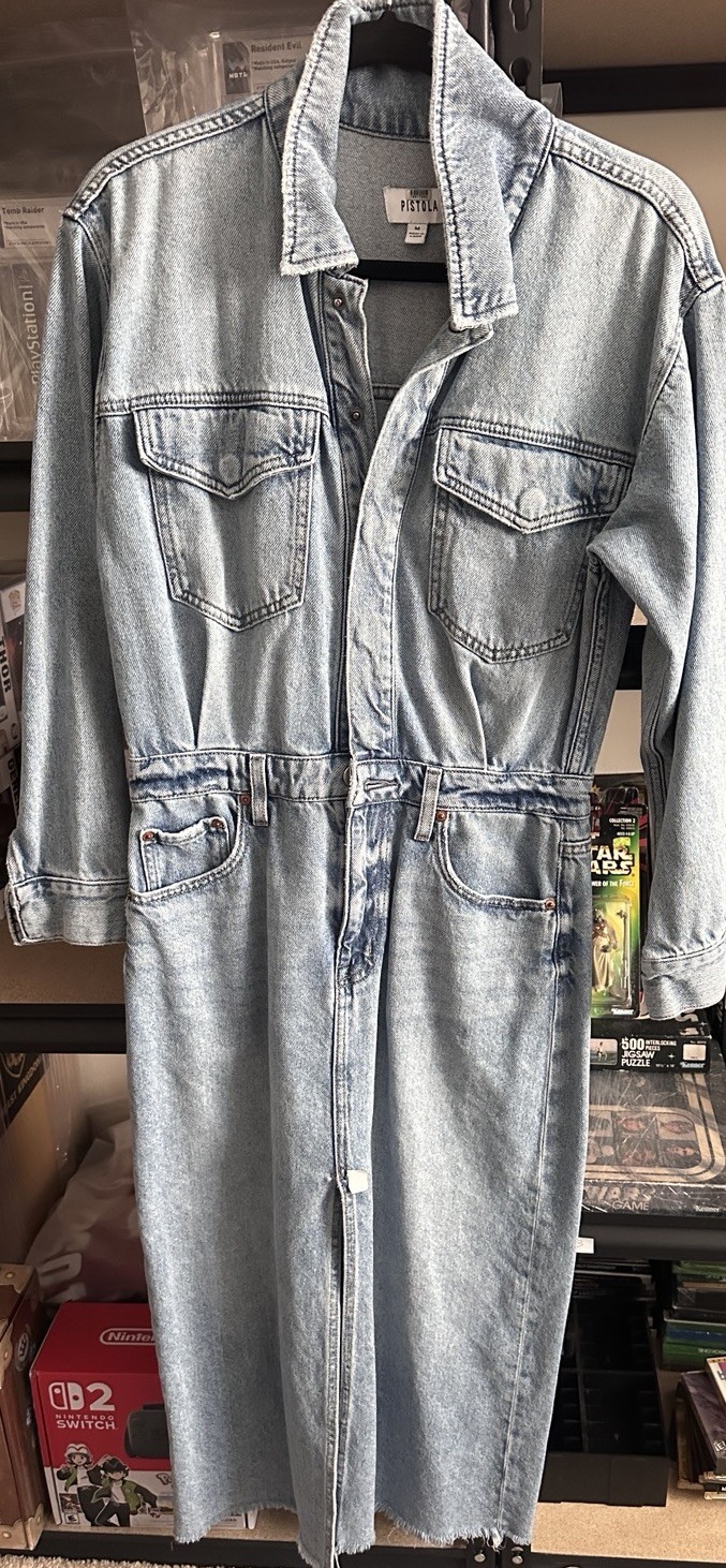 The Pistola Amira in Marcel Blue Heavyweight Denim Midi Shirt Dress is a stylish and versatile piece perfect for casual occasions. Made from 100% cotton denim, this long-sleeve dress features a collared neckline and snap closure. With a solid blue color and midi length, it offers a comfortable fit with measurements of 40" chest, 31" waist, and 50" length. The shirt dress also includes pockets for added functionality, making it a fashionable and practical choice for women looking for a chic and easy-to-care-for wardrobe staple.