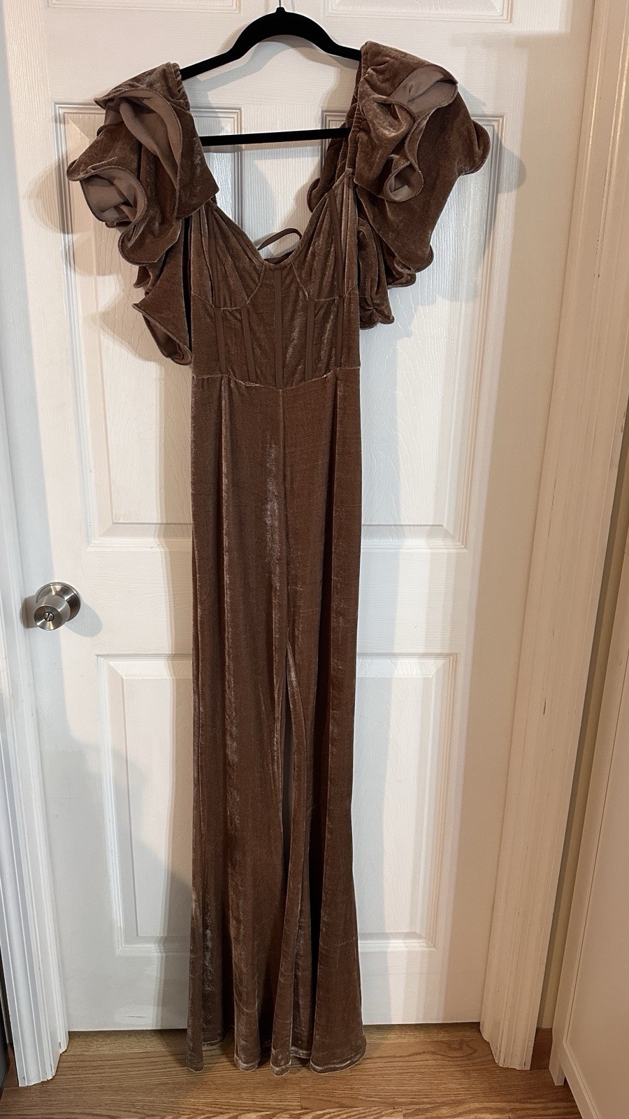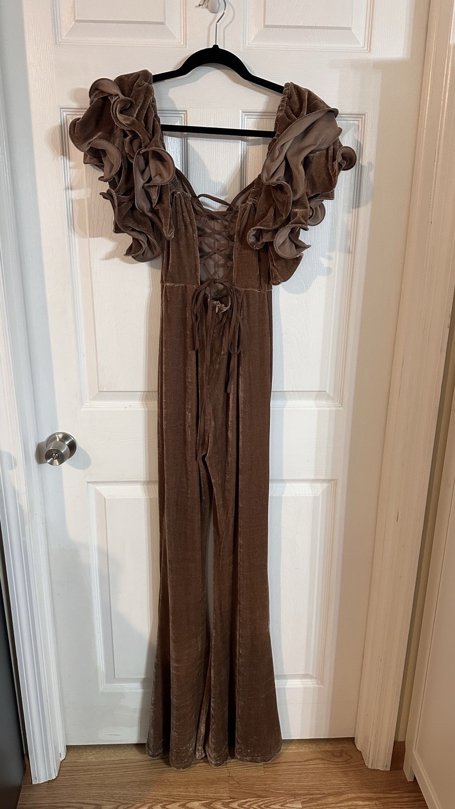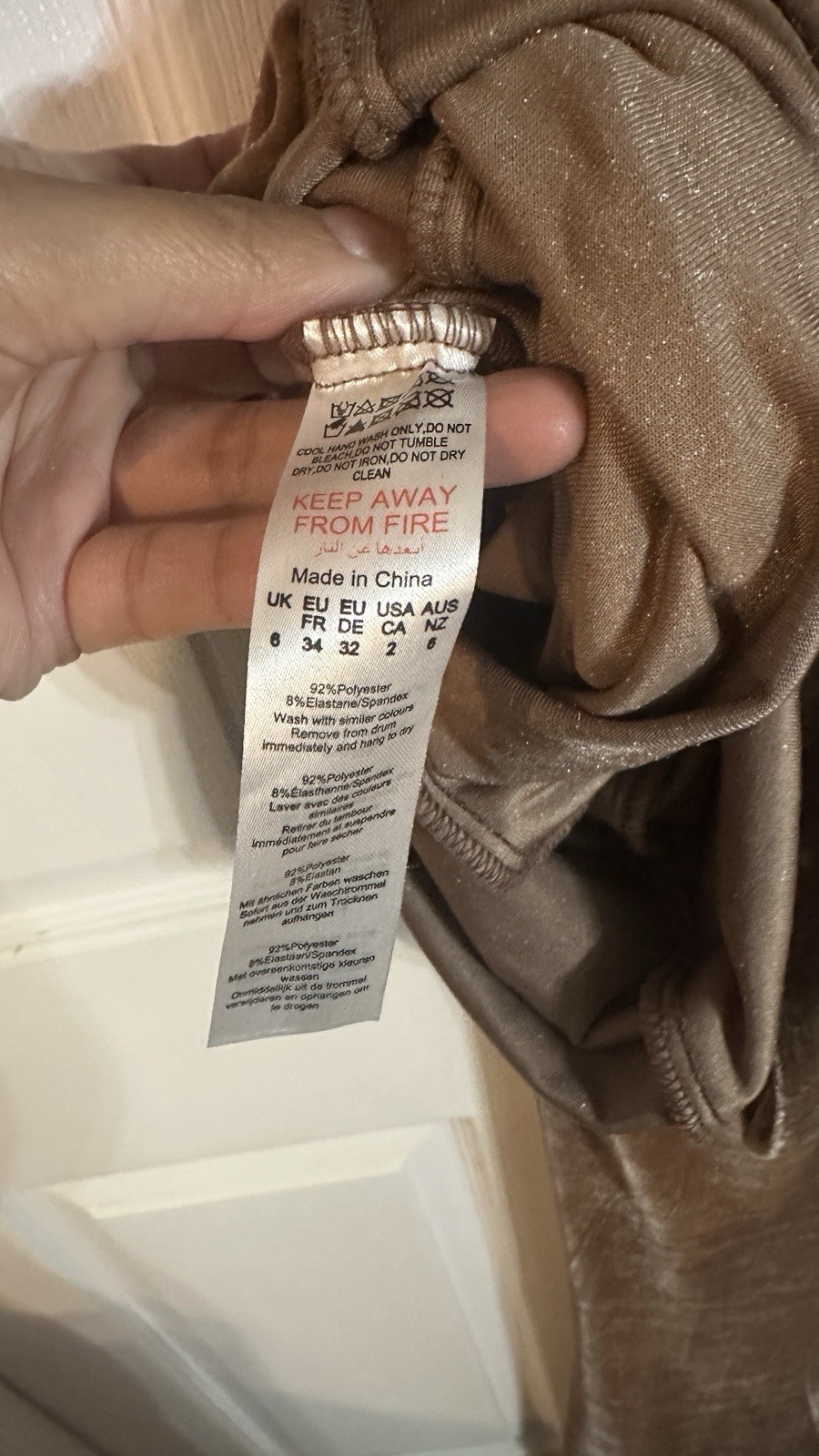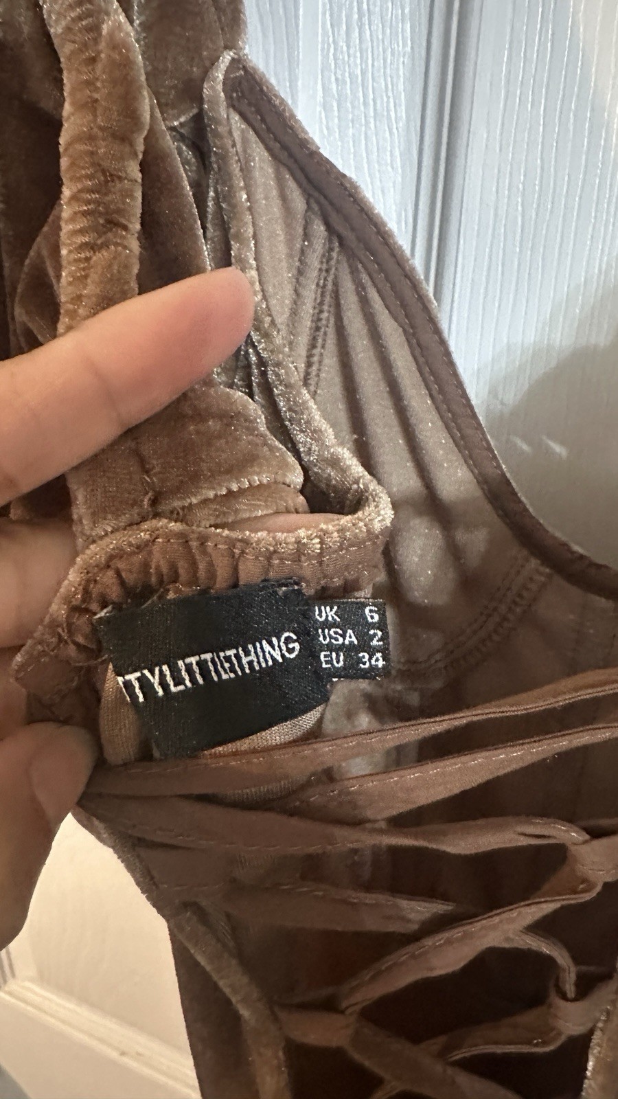 The Pretty Little Thing jumpsuit in size 2 is a stylish and trendy one-piece outfit designed for women. This wide-leg jumpsuit in a chic brown color features a flattering silhouette and comes with a pair of leggings included in the set. The jumpsuit embodies a fashionable and on-trend style, making it a versatile and perfect addition to any woman's wardrobe.