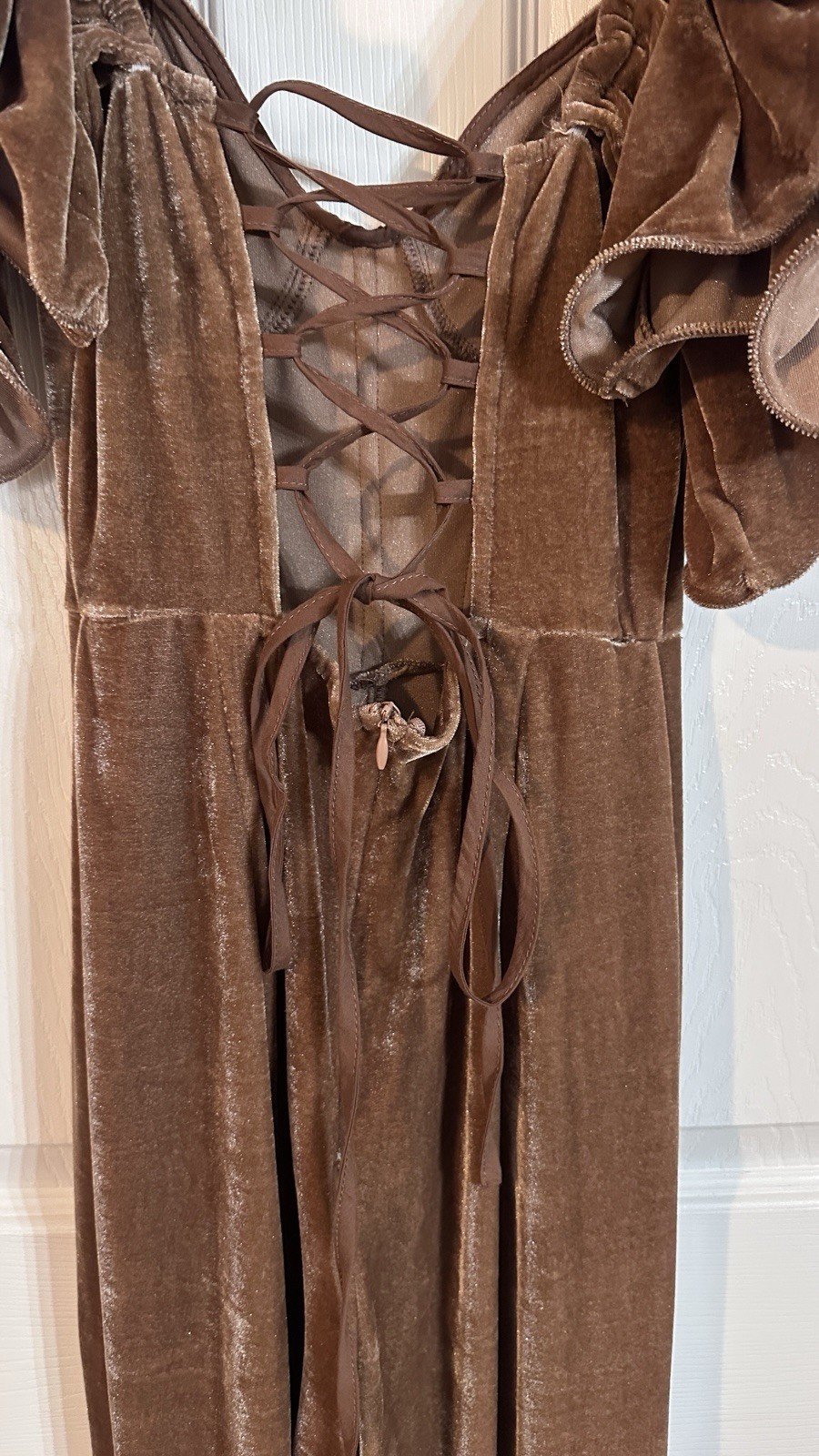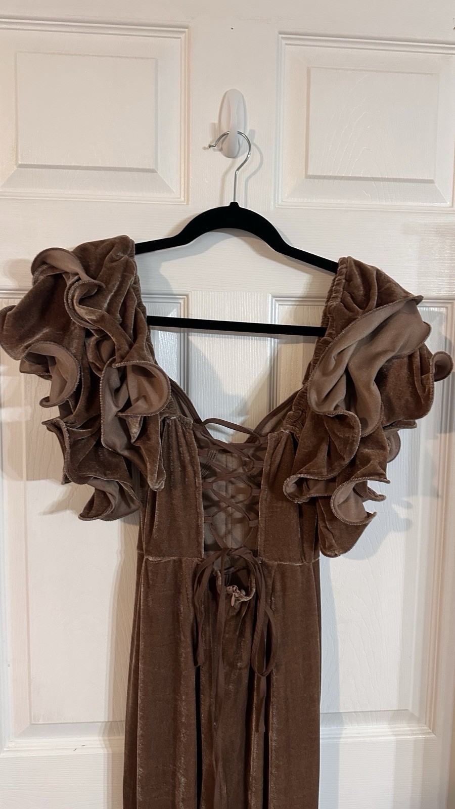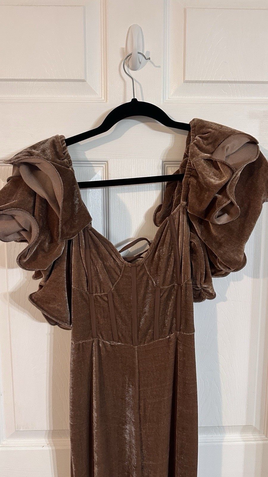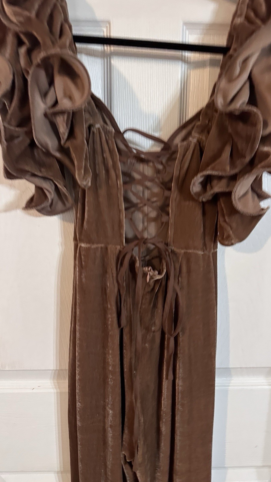 The Pretty Little Thing jumpsuit in size 2 is a stylish and trendy one-piece outfit designed for women. This wide-leg jumpsuit in a chic brown color features a flattering silhouette and comes with a pair of leggings included in the set. The jumpsuit embodies a fashionable and on-trend style, making it a versatile and perfect addition to any woman's wardrobe.