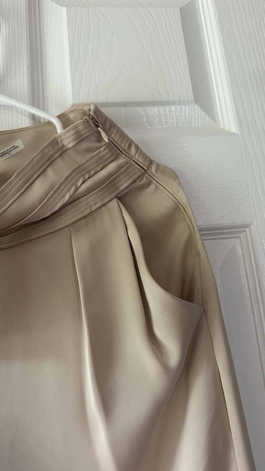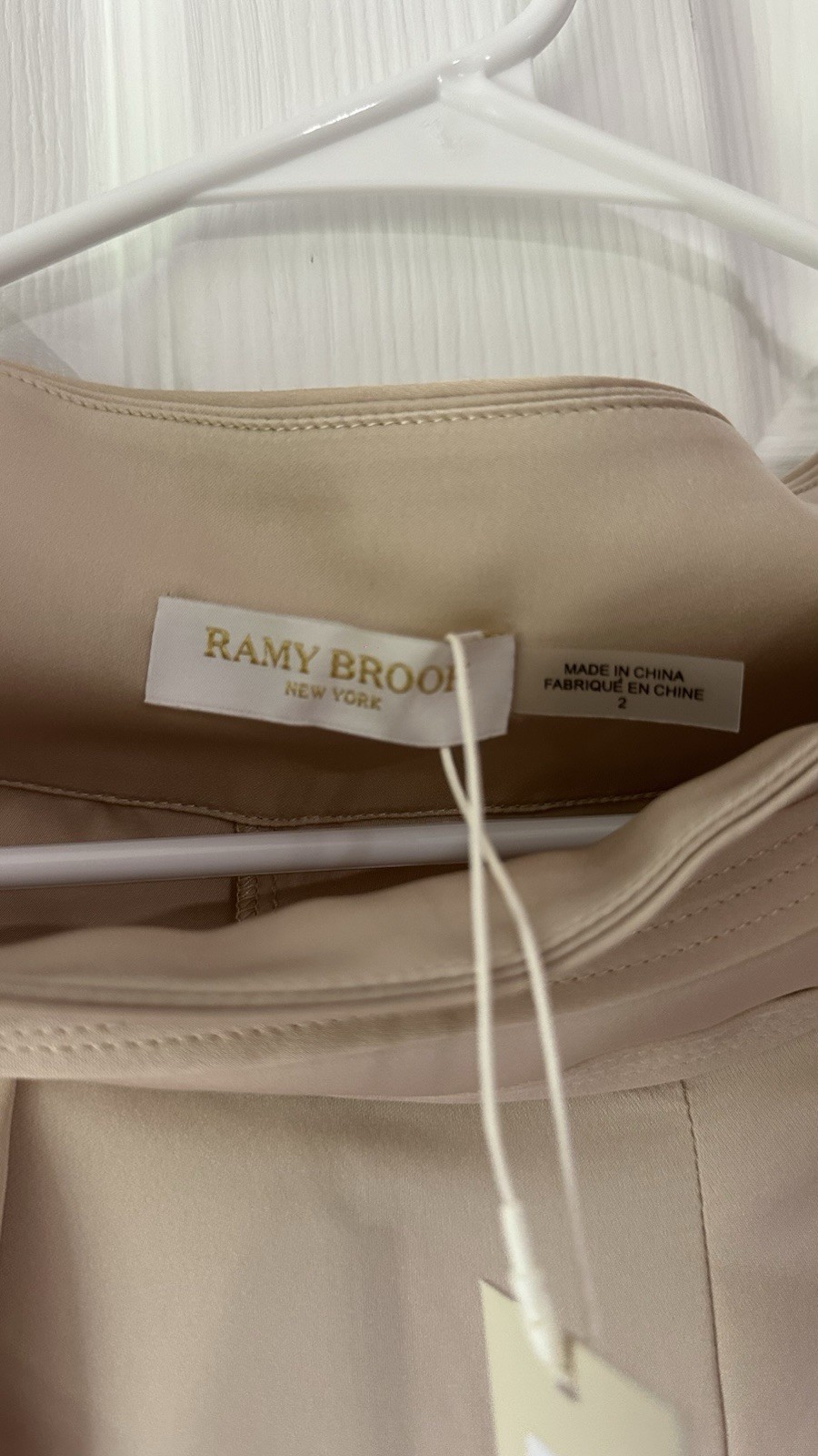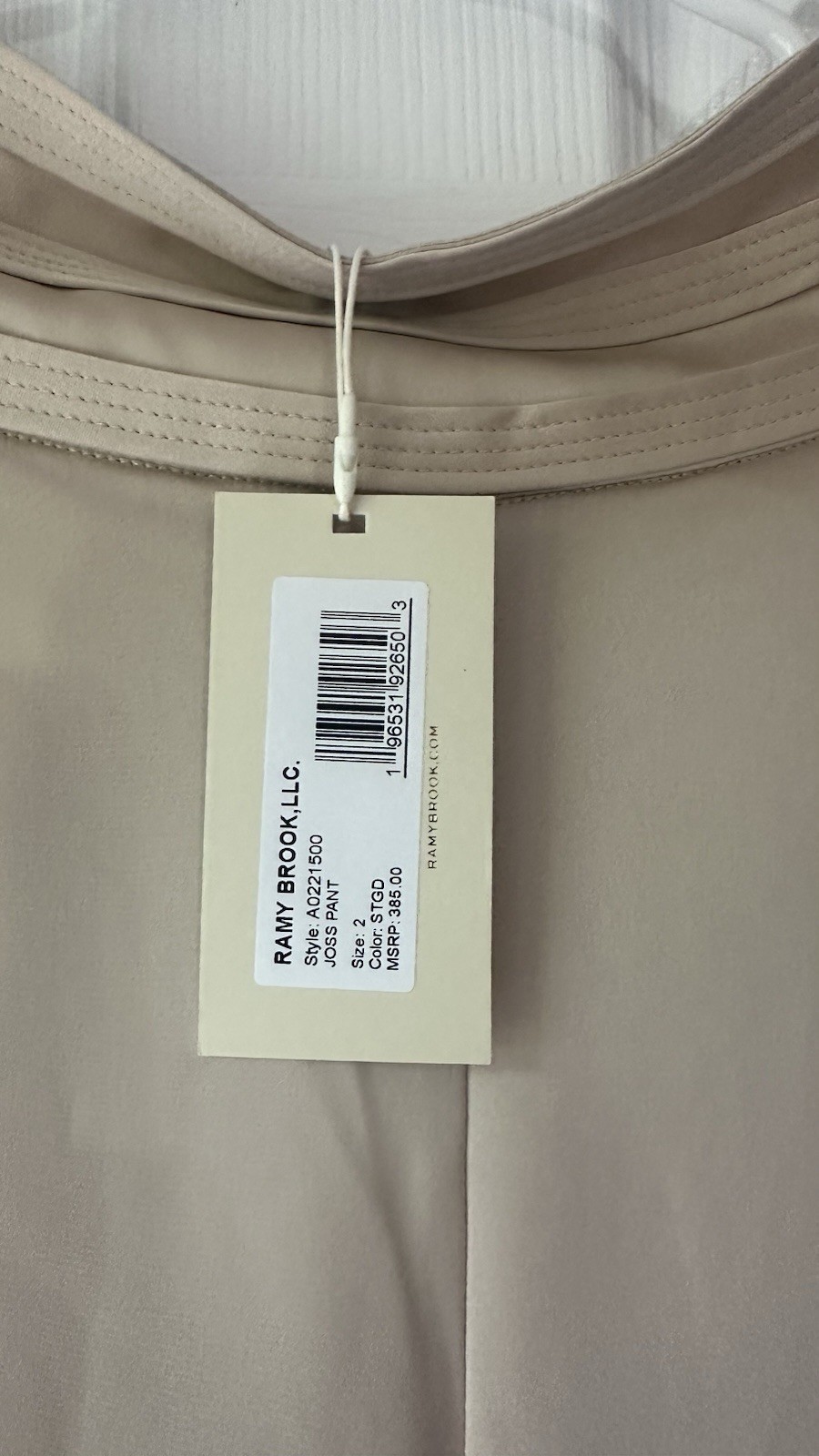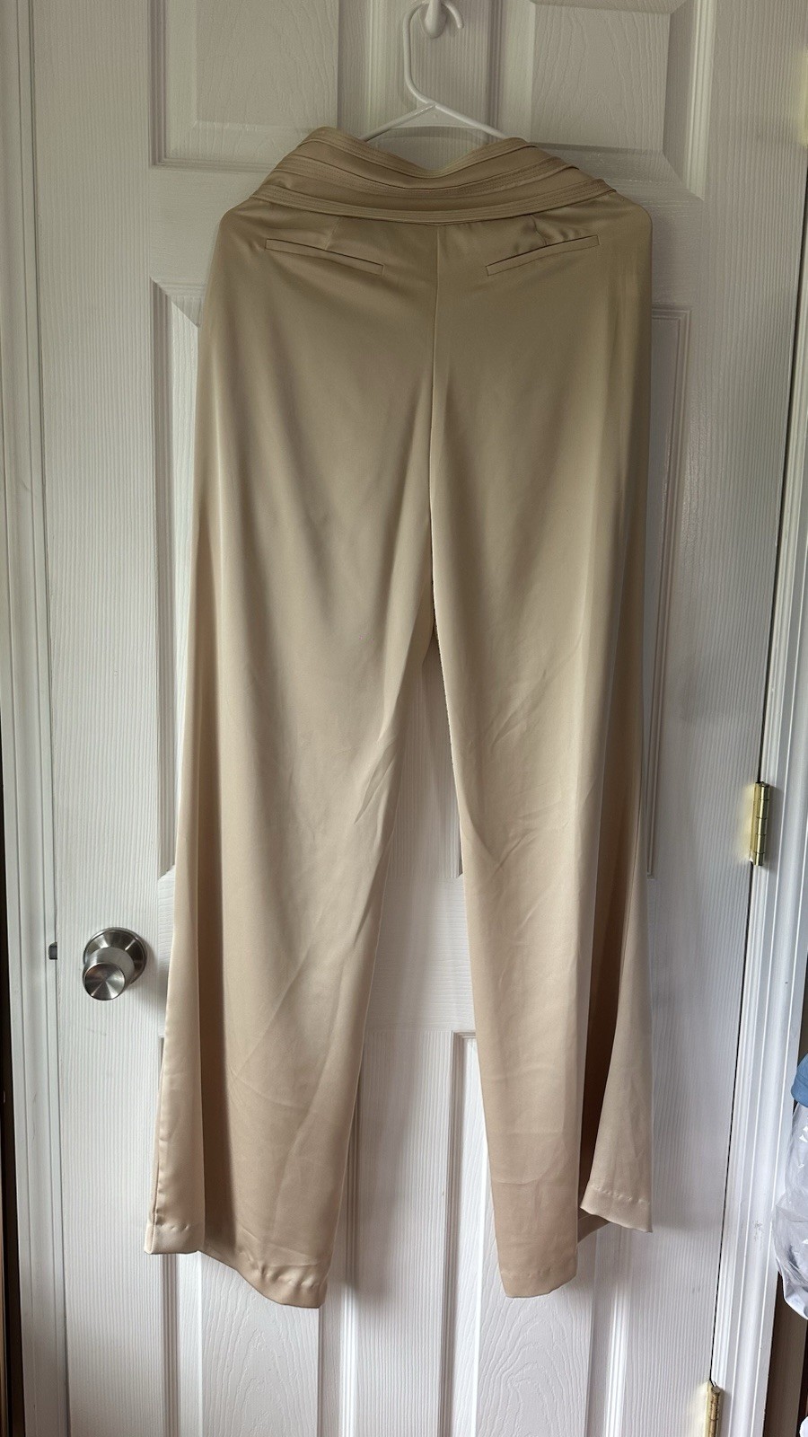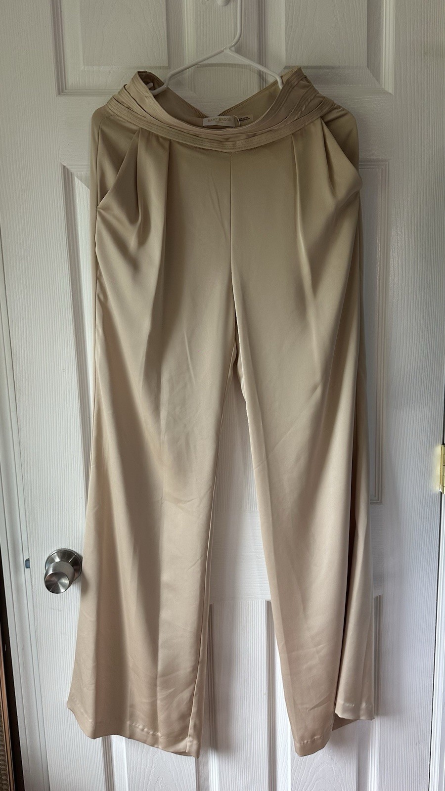 The product is a pair of Ramy Brook Iris Champagne Gold Satin Wide Leg Pants in size 2. These dress pants feature a solid color in a beige tone, with a wide-leg style that is perfect for a sophisticated and elegant look. Made from ramie material, the satin fabric adds a touch of luxury and glamour to the overall outfit. The metallic theme gives these pants a chic and modern vibe, ideal for a dressy occasion or a night out on the town.