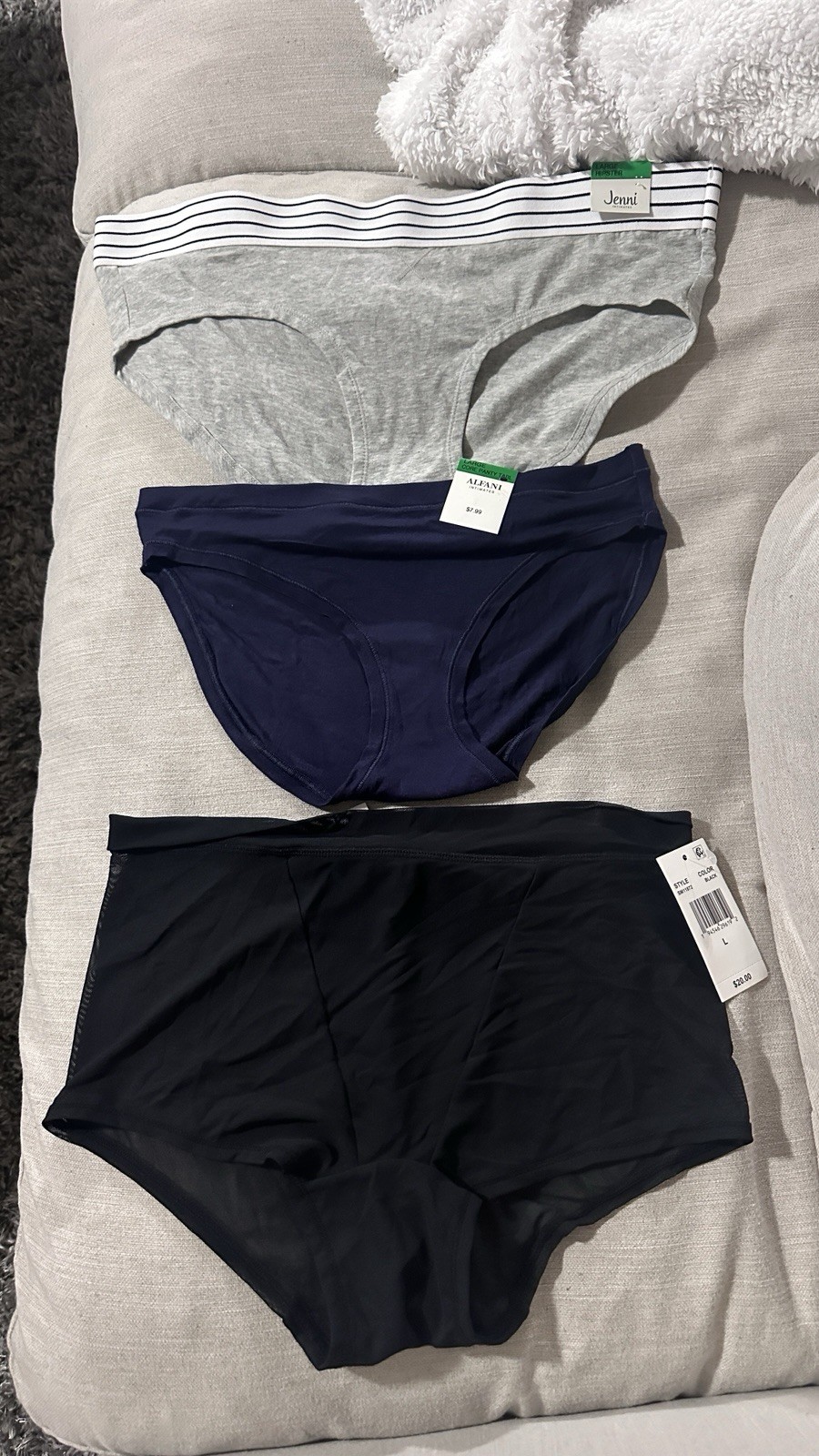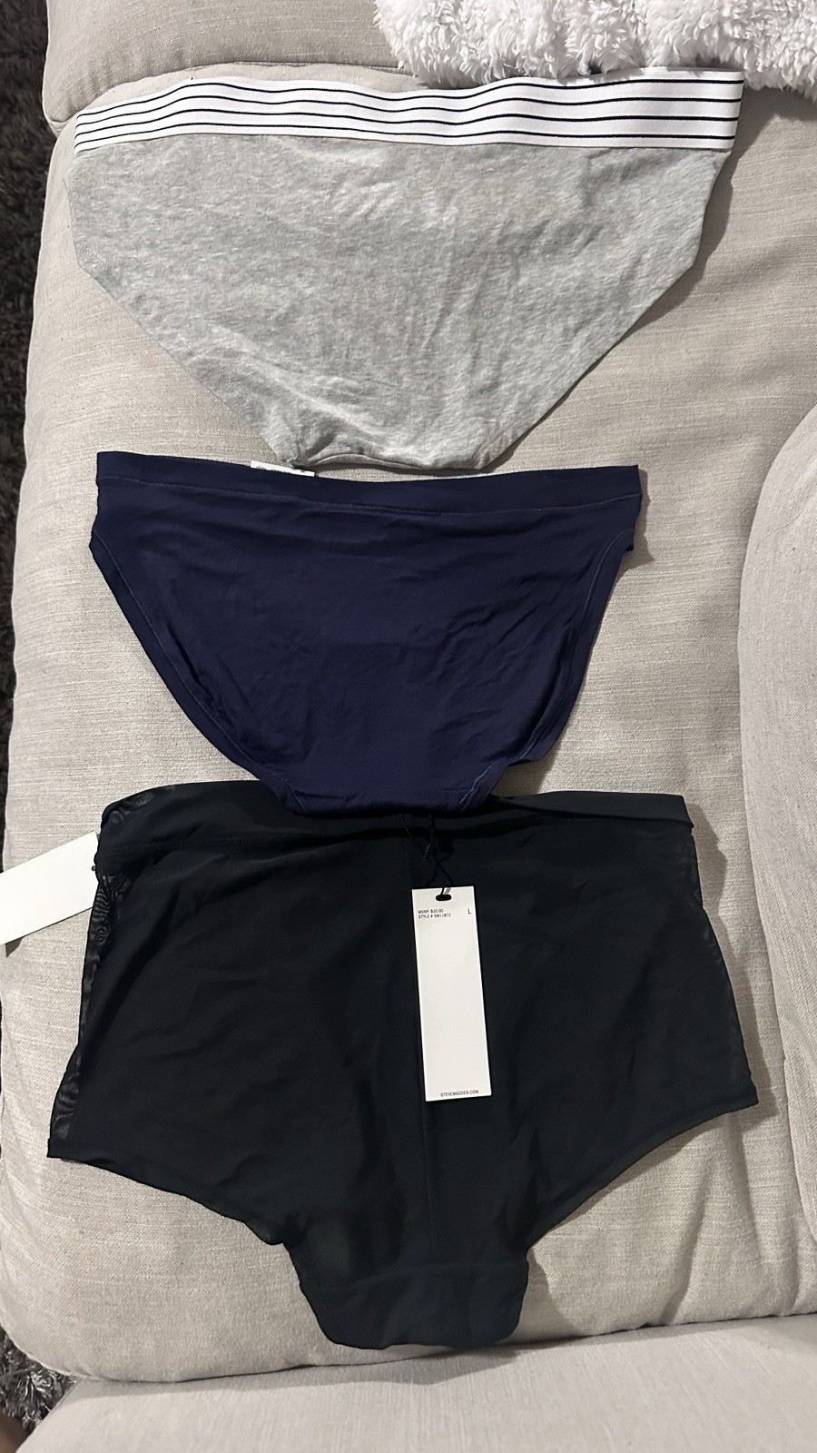 A set of 3 underwear in size large from Steve Madden, Alfani, and Jenni.