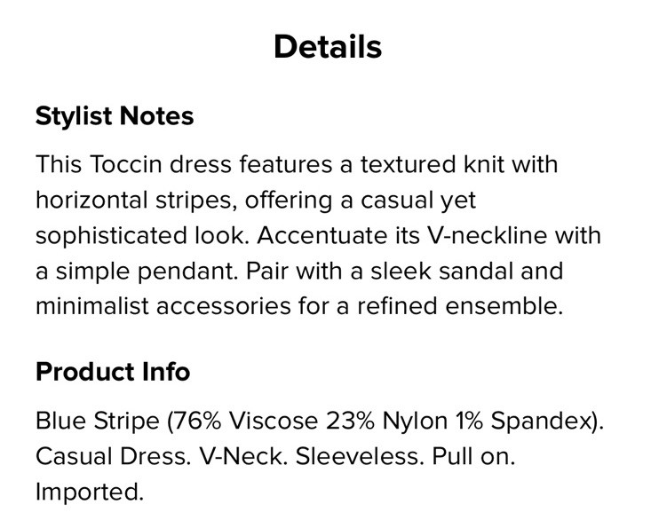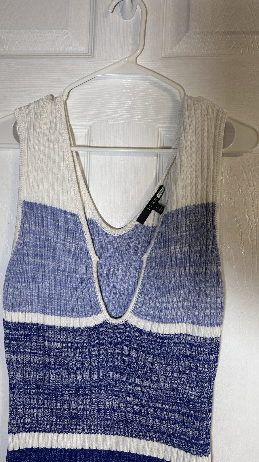 The Toccin Sadie Sleeveless Striped Midi Dress in size L is a stylish and versatile option for any woman's wardrobe. This casual dress features a classic blue stripe pattern, a flattering midi length, and a sleeveless design. With the brand's reputation for quality and style, this dress is sure to be a standout piece that can be dressed up or down for any occasion. Ideal for those looking for a chic and comfortable option for everyday wear.
