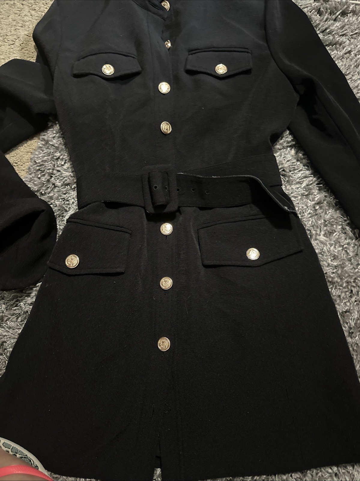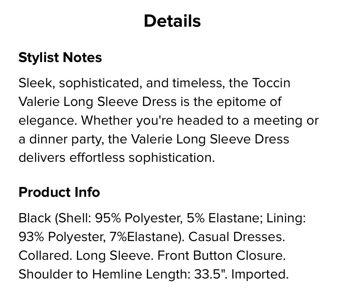 The Toccin Valerie Long Sleeve Dress in size 8 is a sleek and stylish jacket dress designed for women. With a midi length and long sleeves, this black dress is perfect for a variety of occasions. The Valerie brand ensures quality and attention to detail, making this dress a versatile and fashionable choice for any wardrobe.
