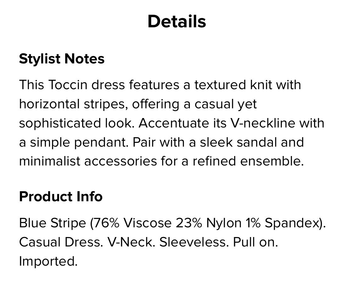 The Toccin Women's Sadie Sleeveless Striped Midi Dress is a stylish and versatile piece for any woman's wardrobe. This dress features a flattering V-neckline, a sleeveless design, and a midi length, making it perfect for both casual and dressy occasions. The blue striped pattern adds a touch of sophistication, while the fabric blend of 76% Viscose, 23% Nylon, and 1% Spandex ensures comfort and flexibility. With a regular fit and size S, this dress is a must-have for any fashion-forward woman.