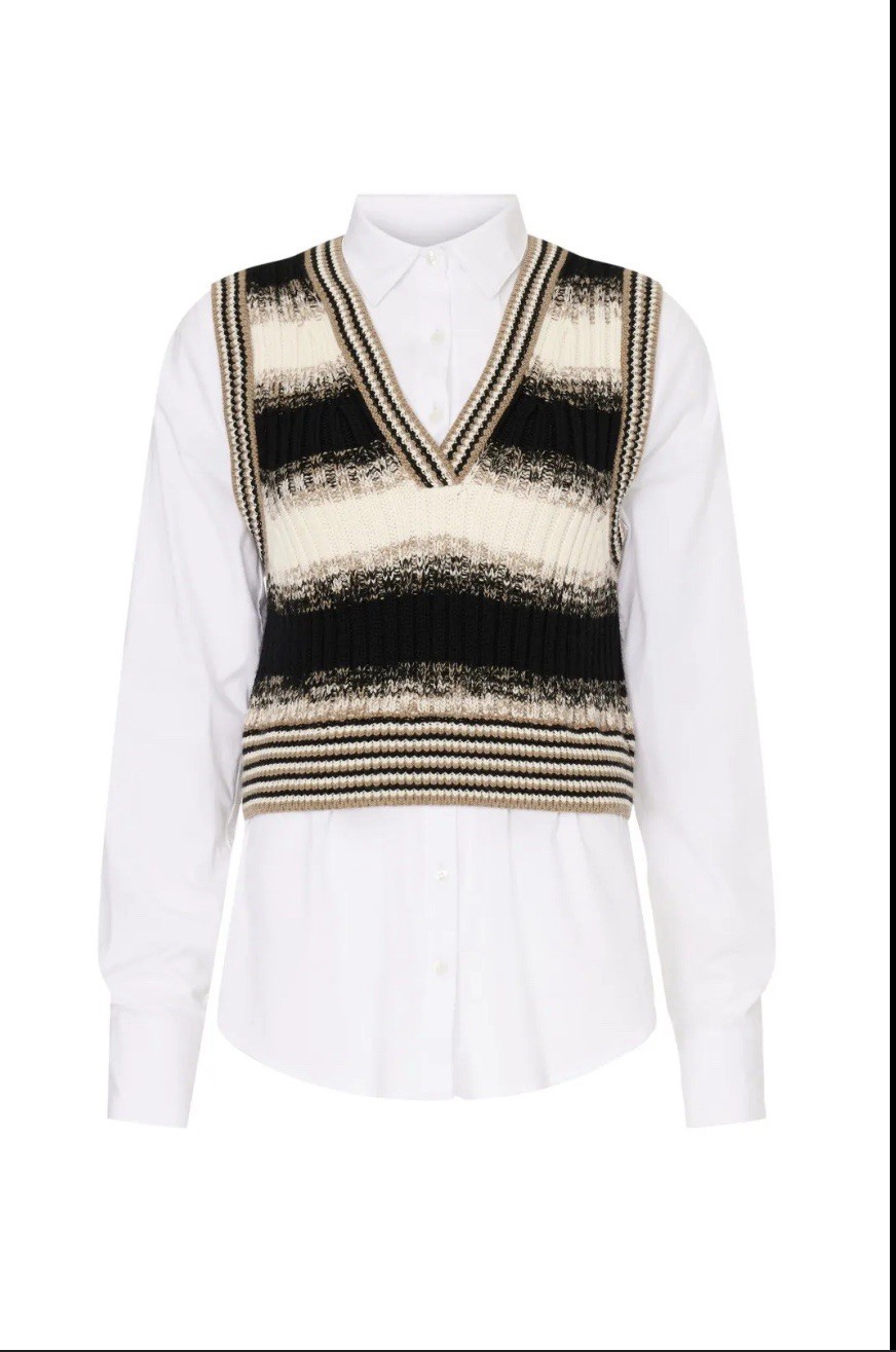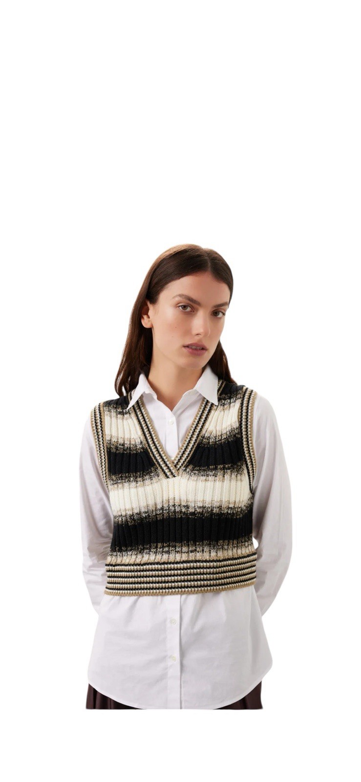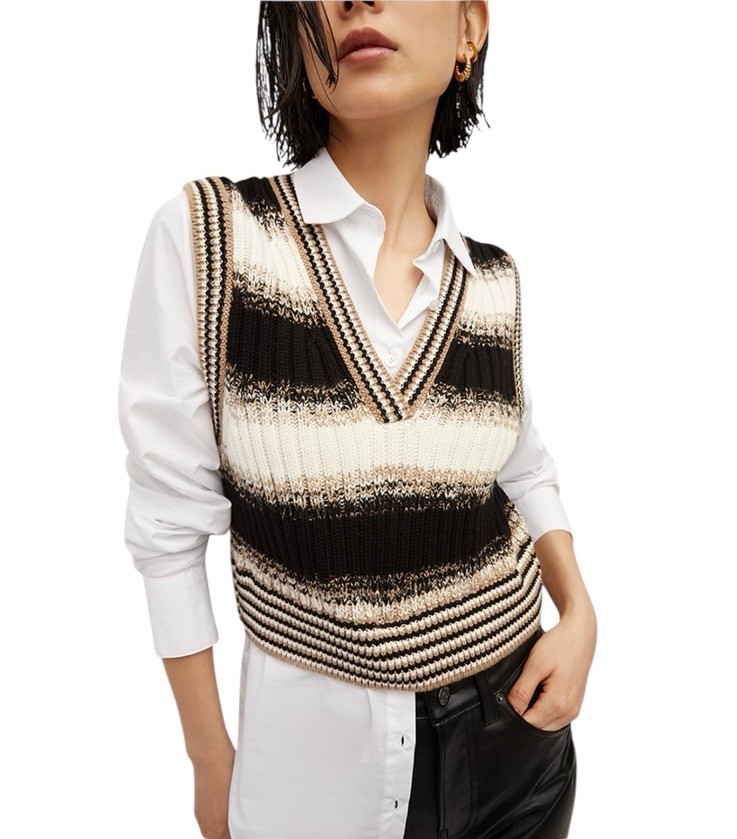 Multicolor stripe knit (100% Merino Wool/100% Laine Merinos/97% Cotton, 3% Elastane). Top. Sleeveless. V-neck. Pull on. Imported.