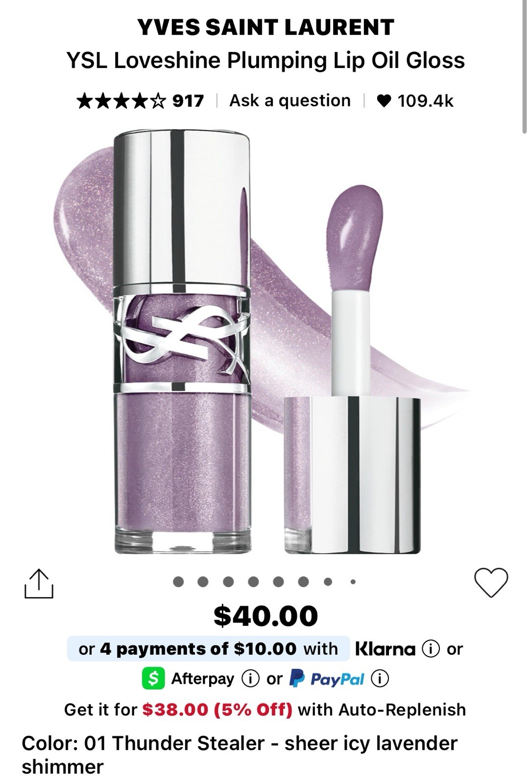 The YSL Loveshine Plumping Lip Oil Gloss #1 Thunder Stealer is a luxurious lip product by Yves Saint Laurent. This liquid lip oil offers a shine effect and plumping action, leaving your lips with a beautiful, glossy finish. With a volume of 0.2 fl oz, this full-size product comes in a standard size and is perfect for adding a touch of elegance to your lips. Made in France, this lilac shade is a must-have for any makeup collection.